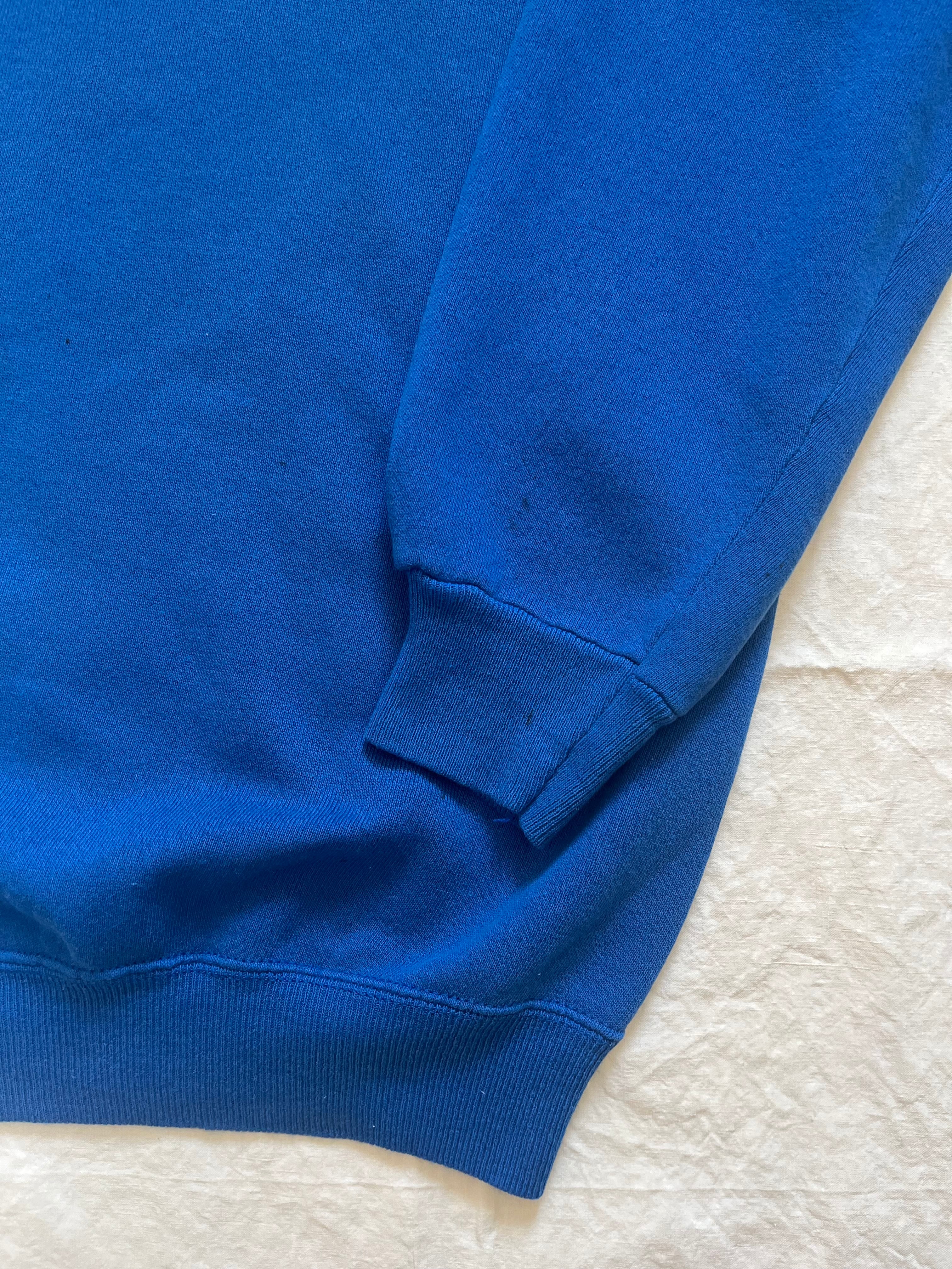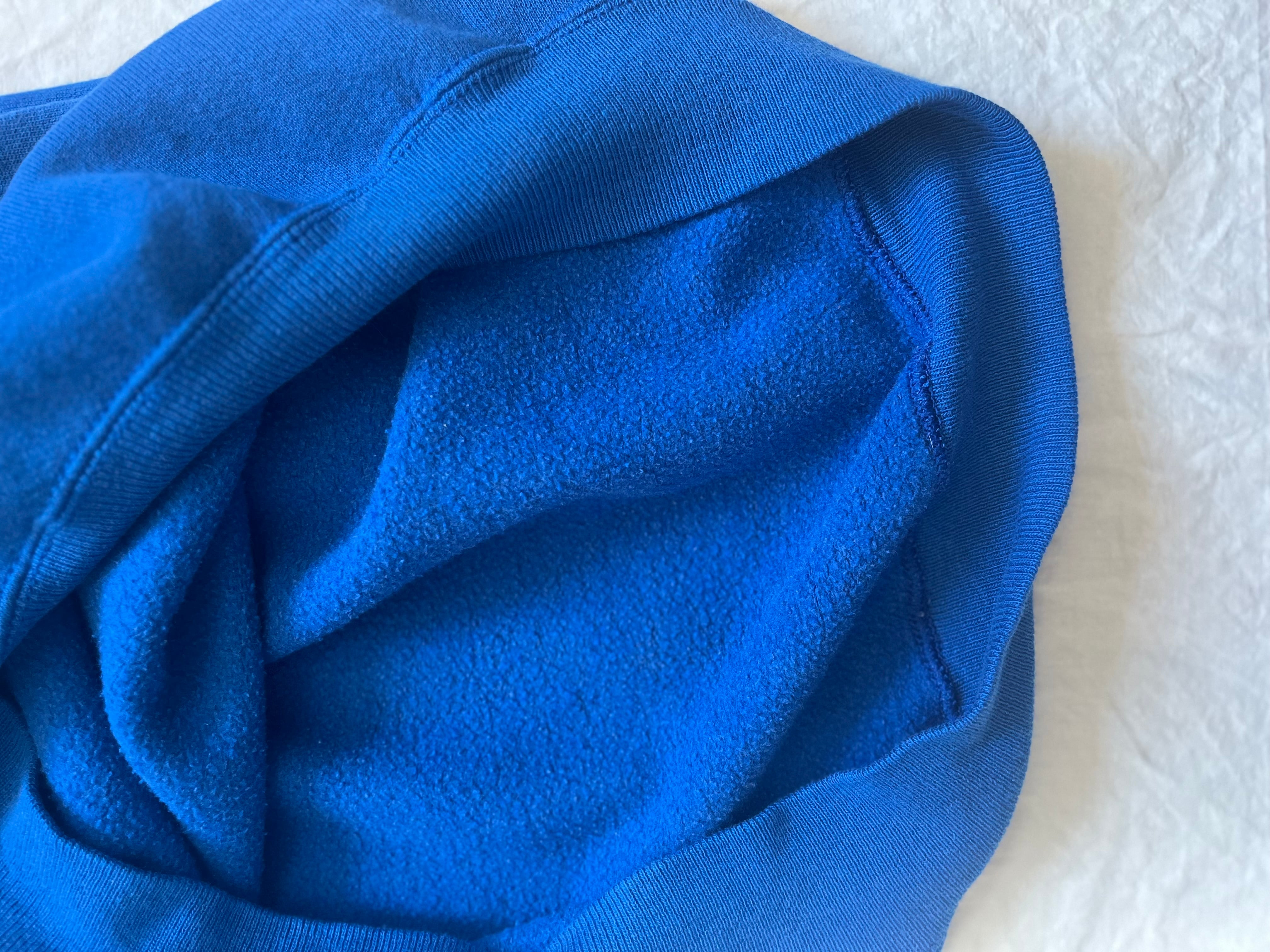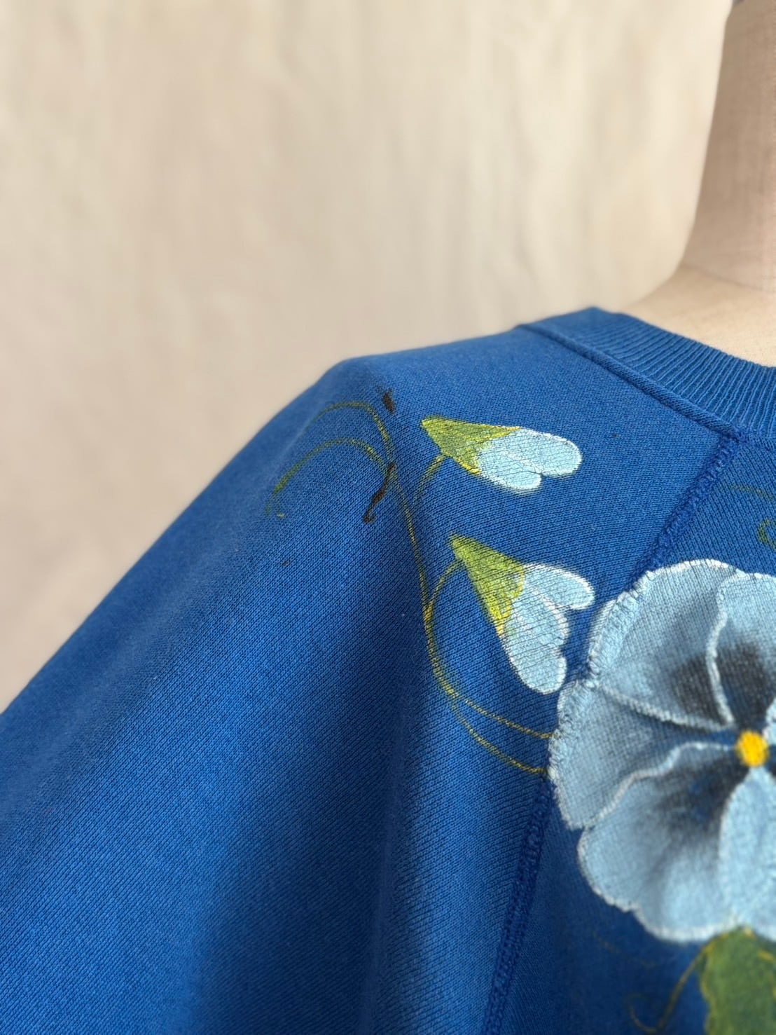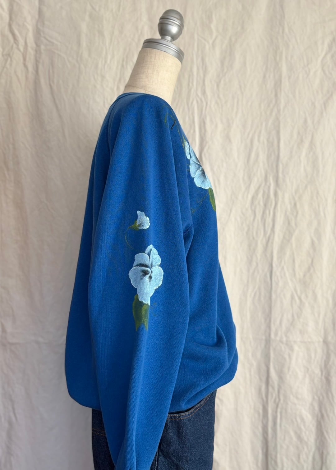 鮮やかなブルーのボディに手書きでパンジーが描かれた古着スウェット。