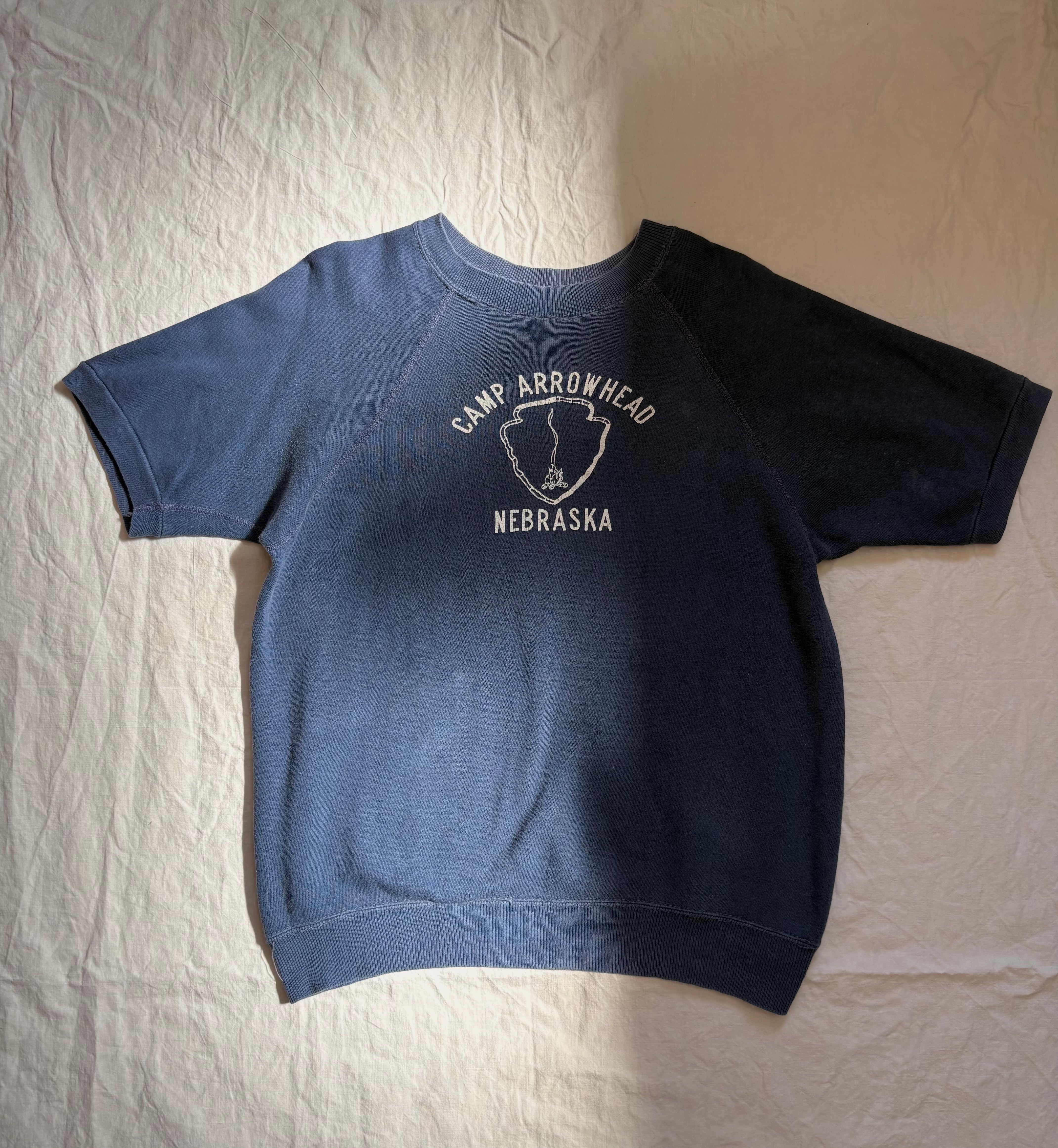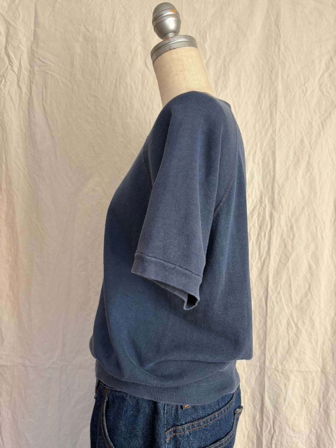 60〜70'sショートスリーブスウェット。くたくたのボディとヴィンテージらしいナス紺カラー。控えめなラバープリントのデザインと小さめのボディサイズが女性が着用しやすいヴィンテージアイテムとなっております。