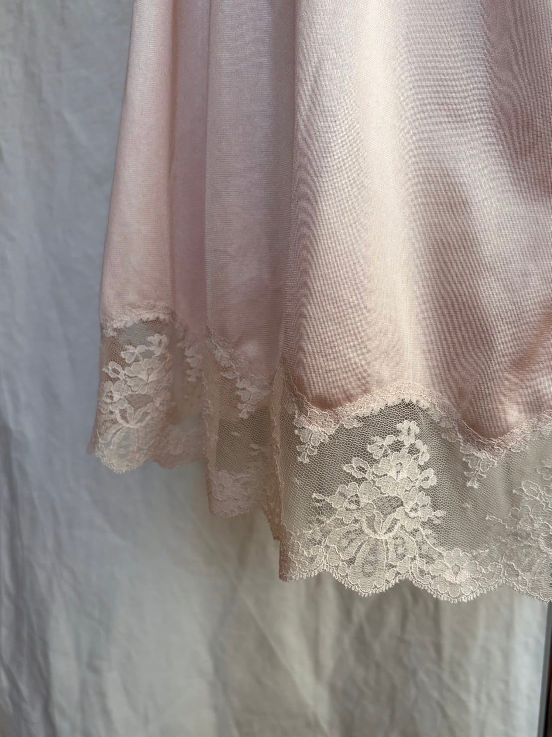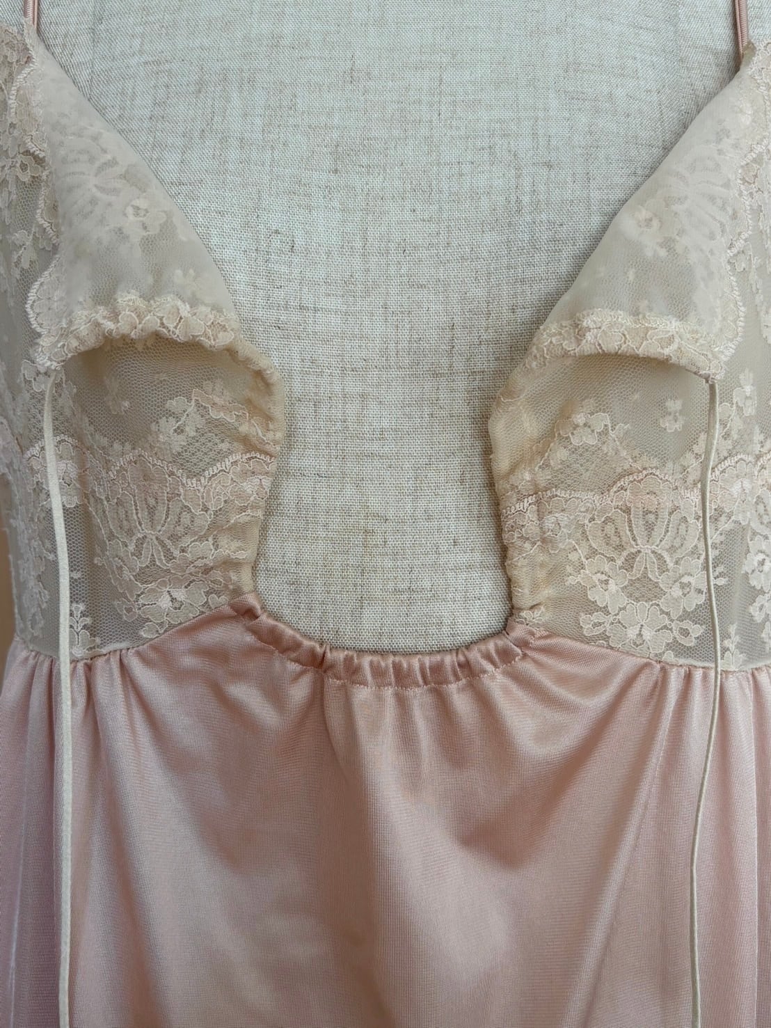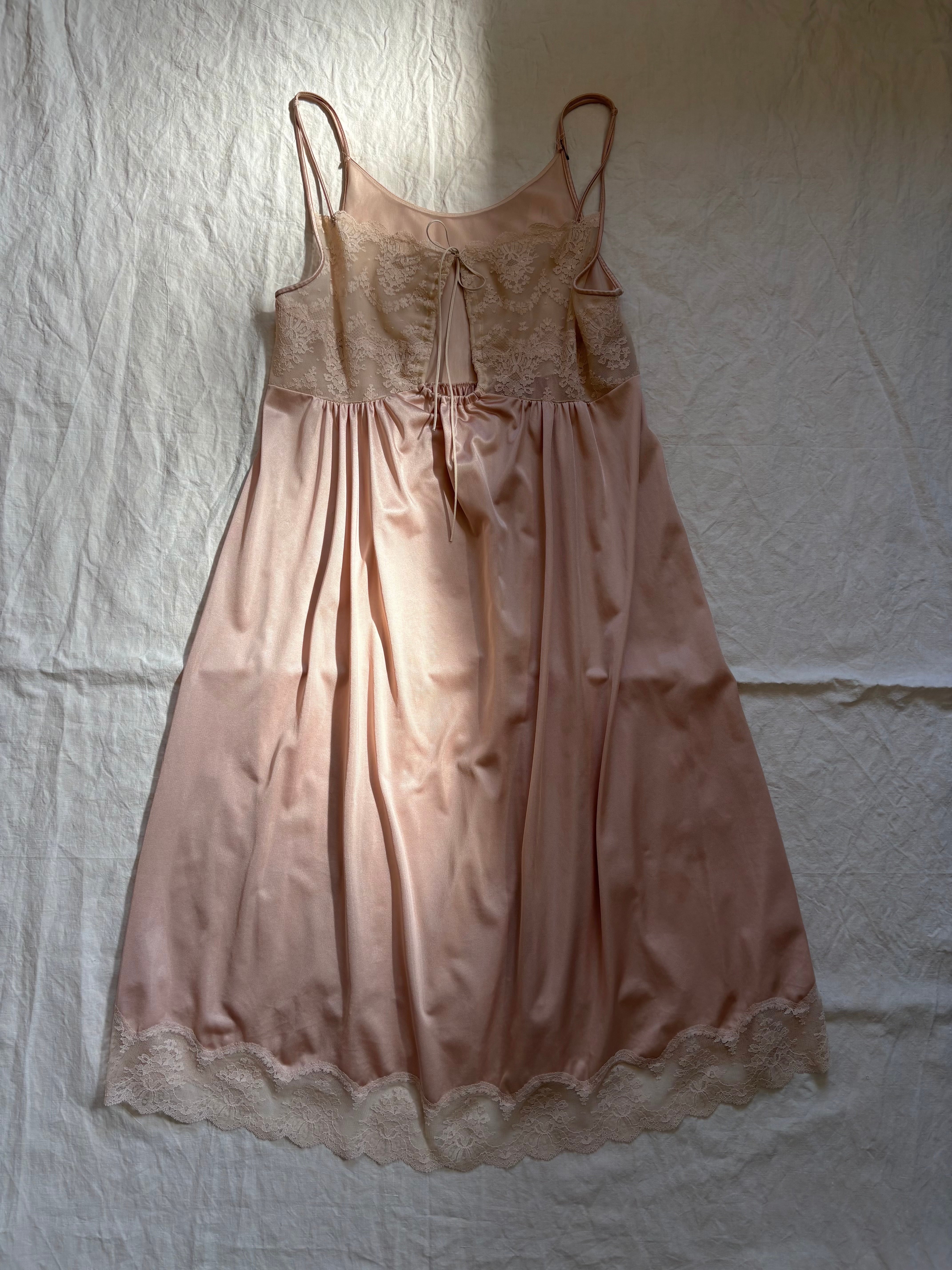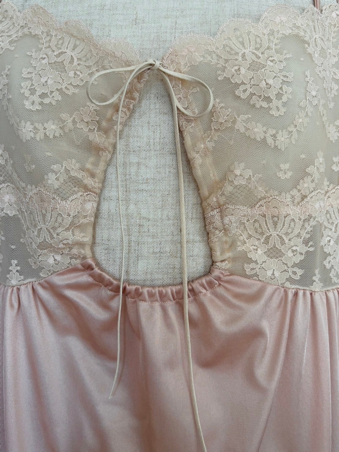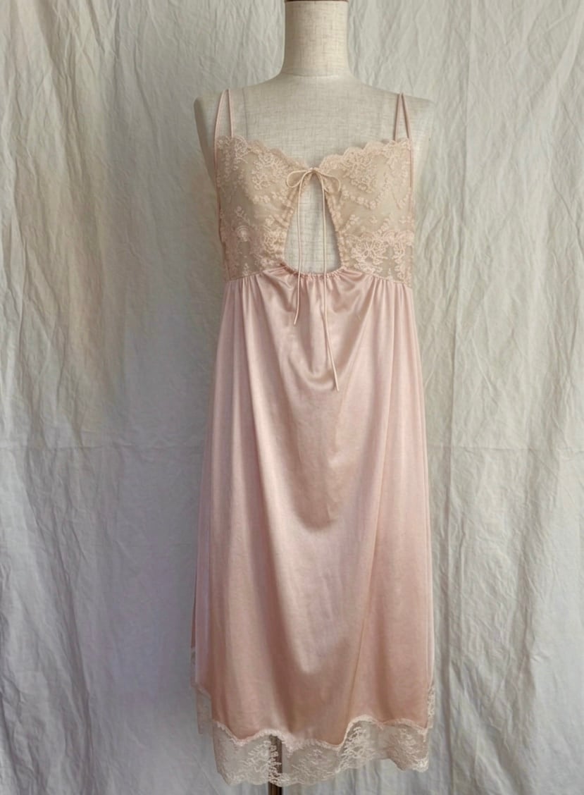 優しいピンクベージュのスリップドレス。ポイントとなる中心のスリット部分のリボンは付け替えています。