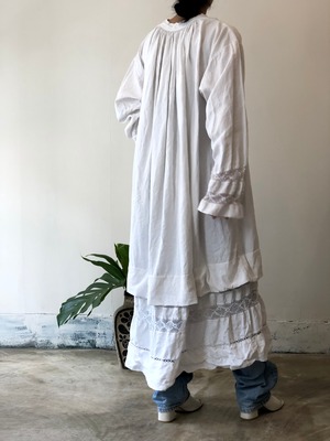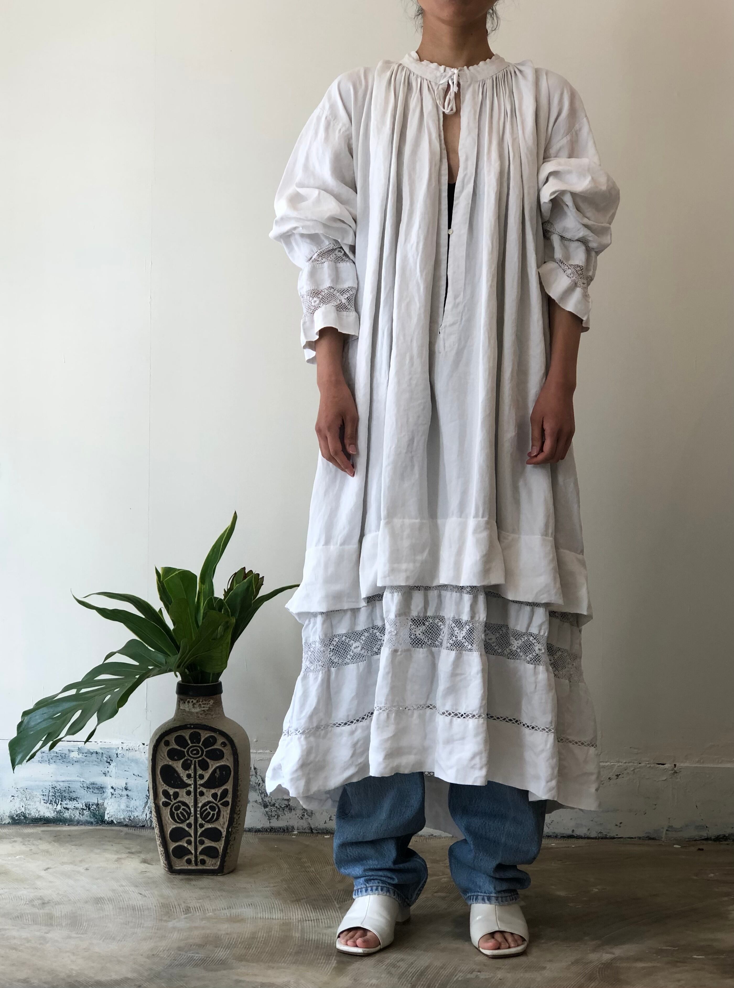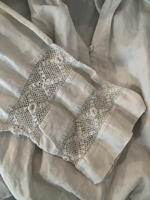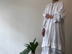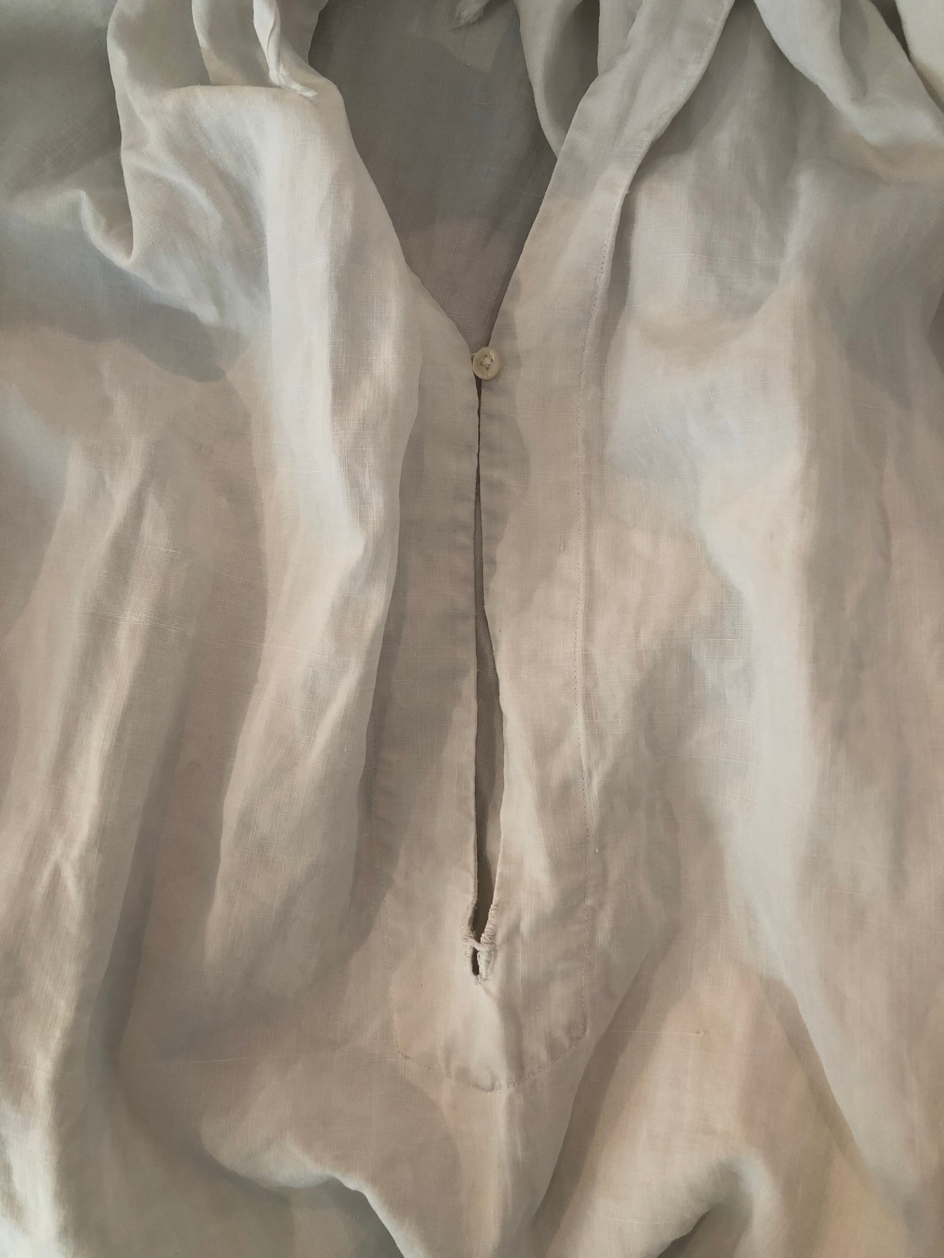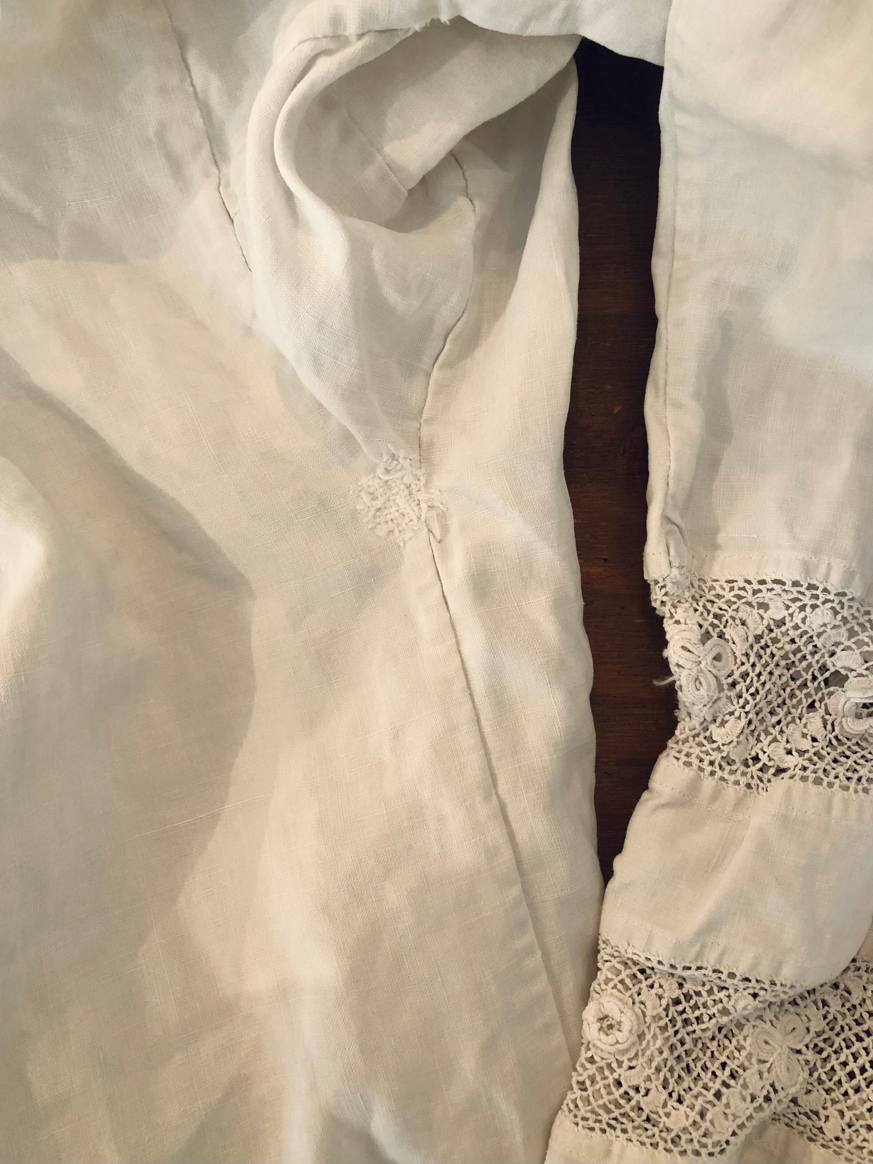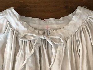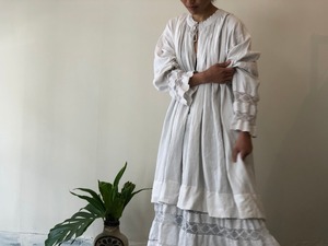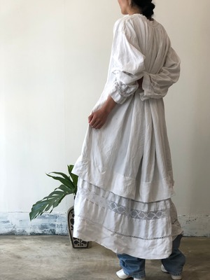 19世紀後半〜20世紀初頭のフランスのチャーチガウンです。生地はしっかりとしたリネンですが混紡のような柔らかさもあり、ハリ感と落ち感を兼ね備えた風合いで、個人的には1番好みのアンティーク生地です。