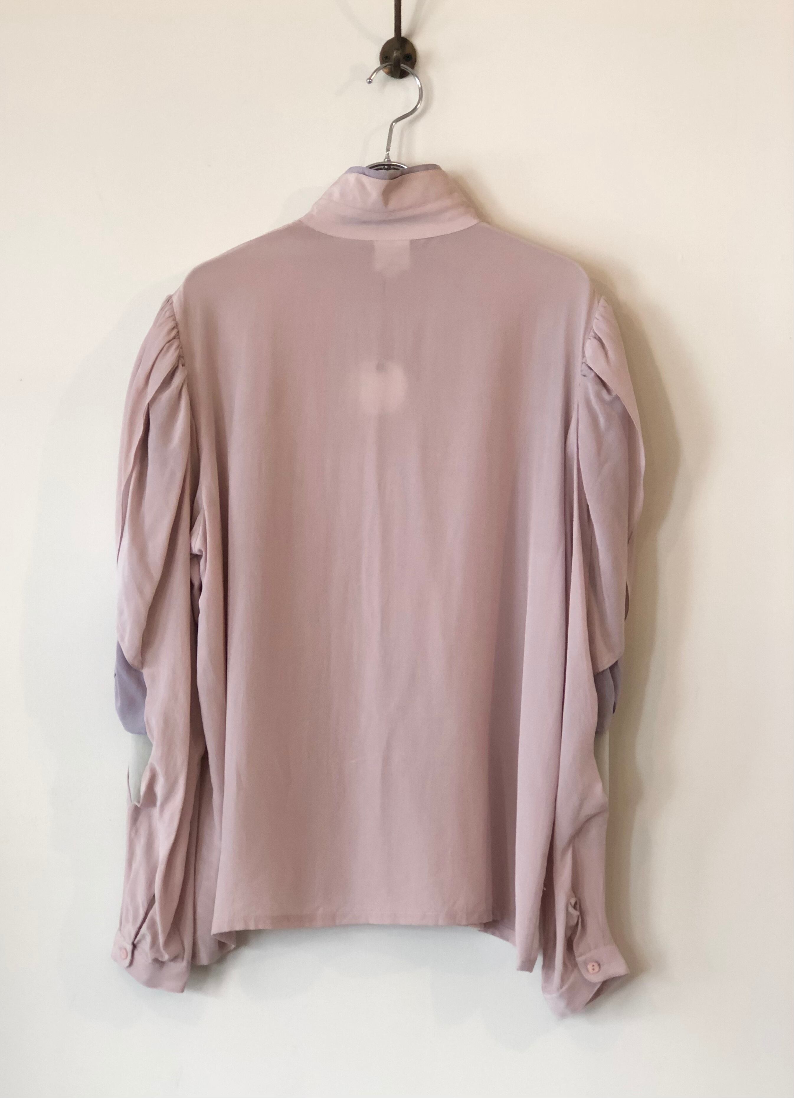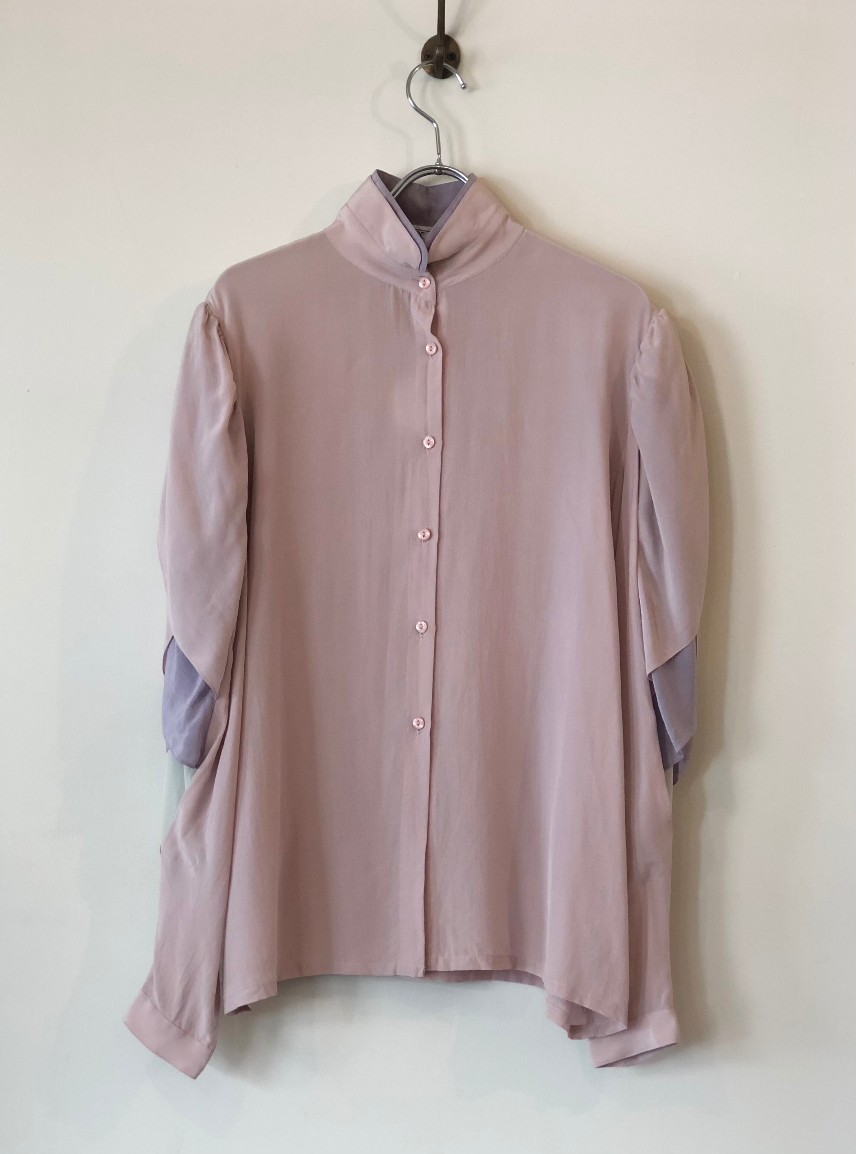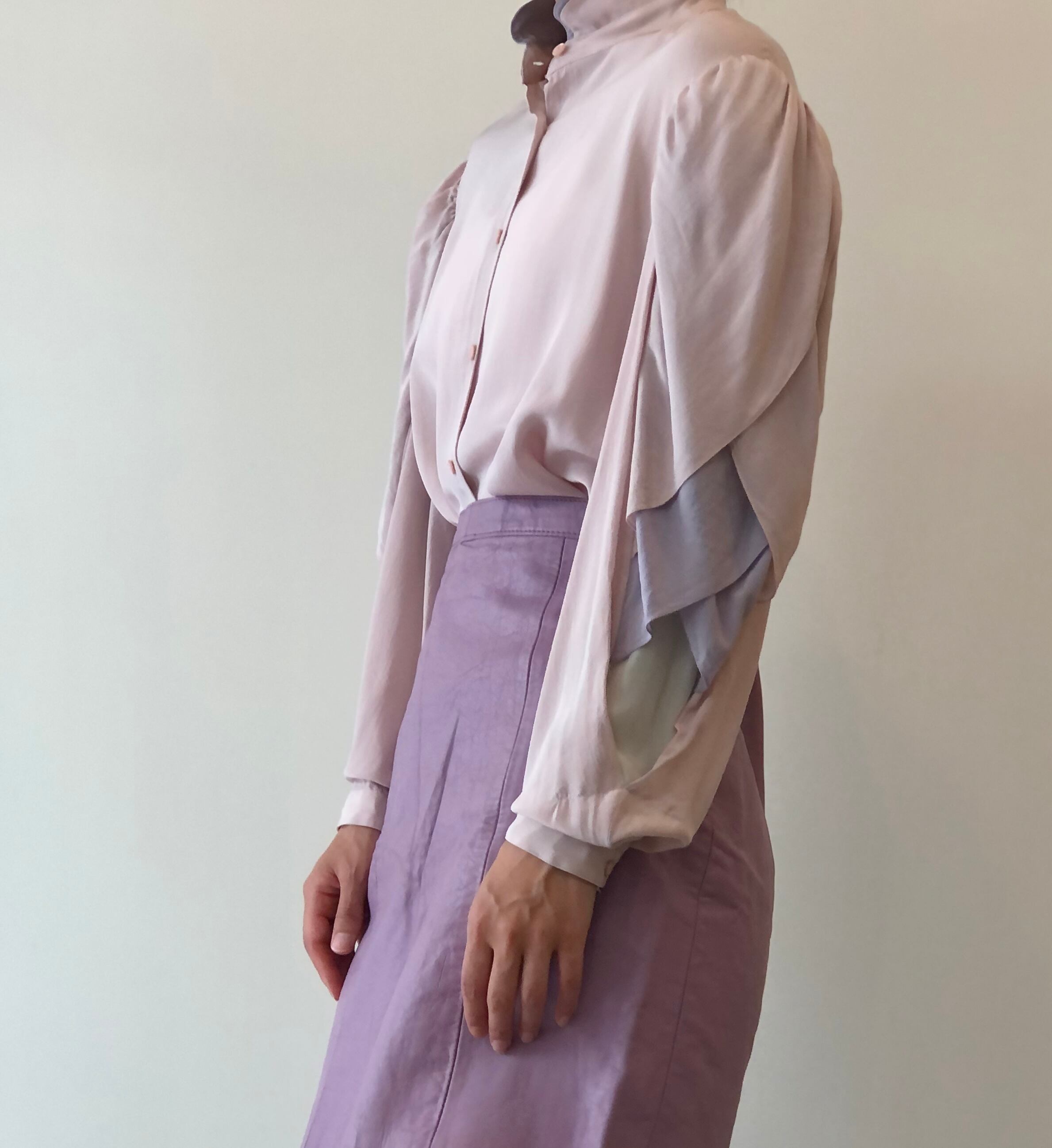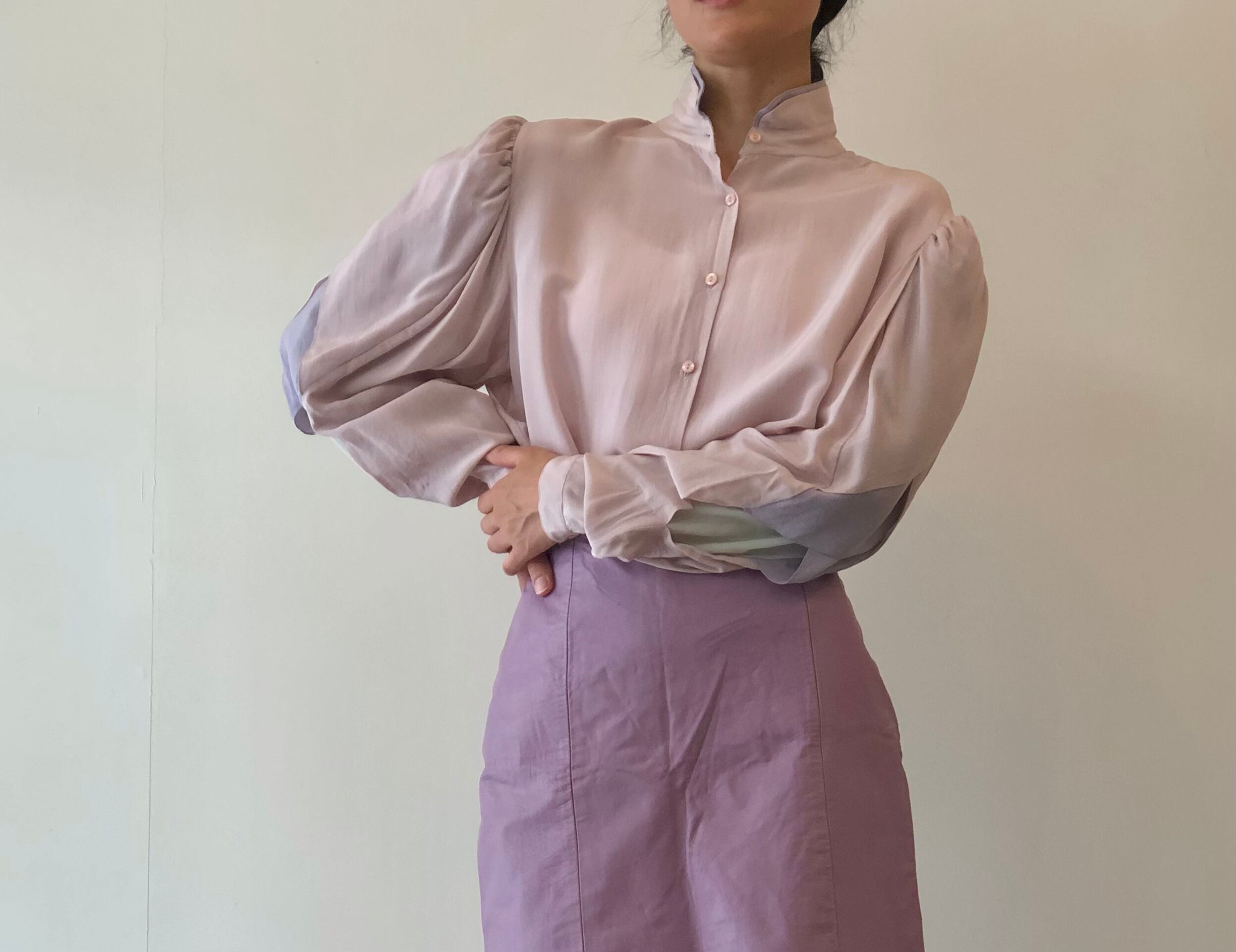 立体的で不思議な袖のディテールがとても魅力的なシルクブラウスです。ファニーなデザインと優しいパールトーンの上質な生地のバランスが絶妙です。