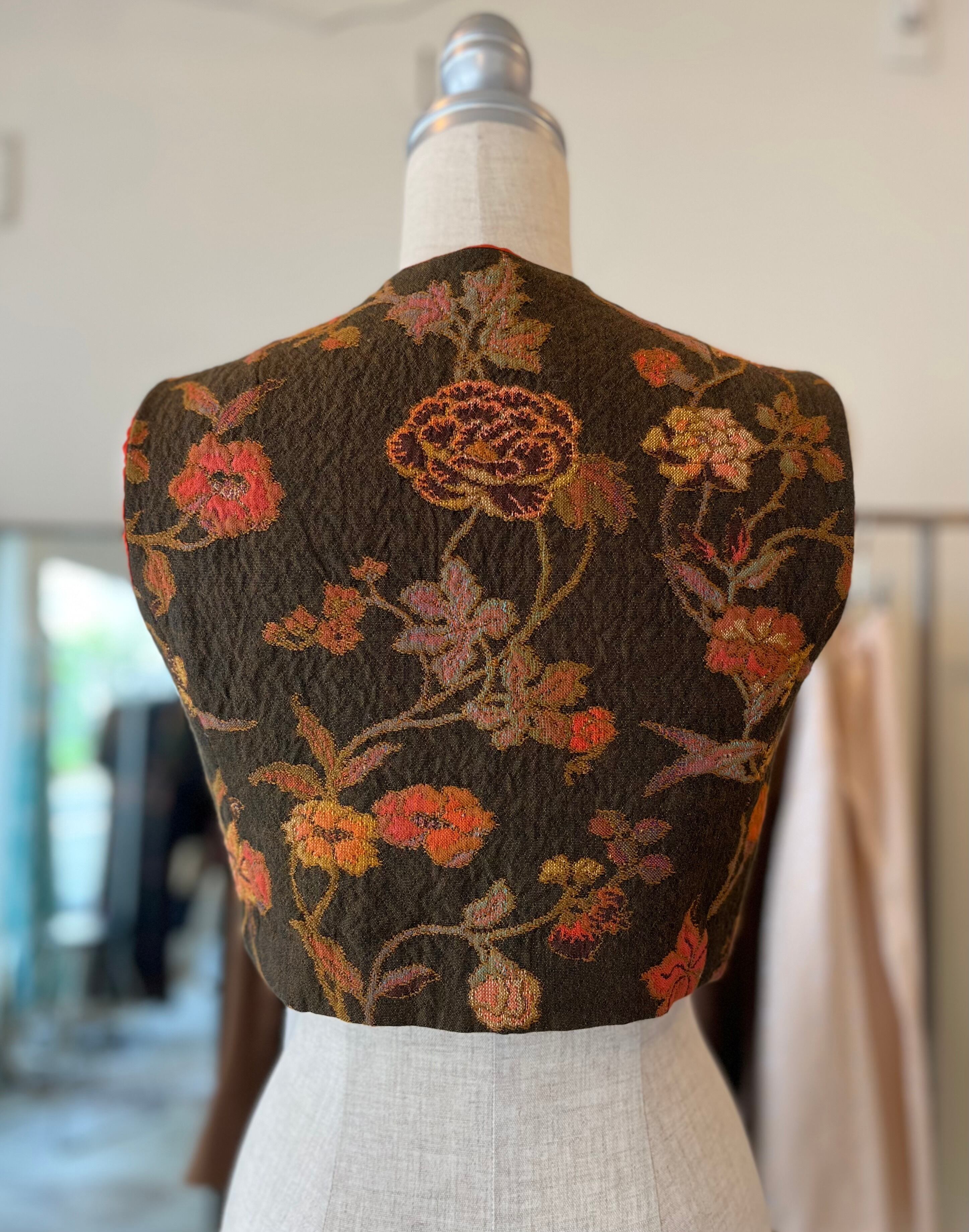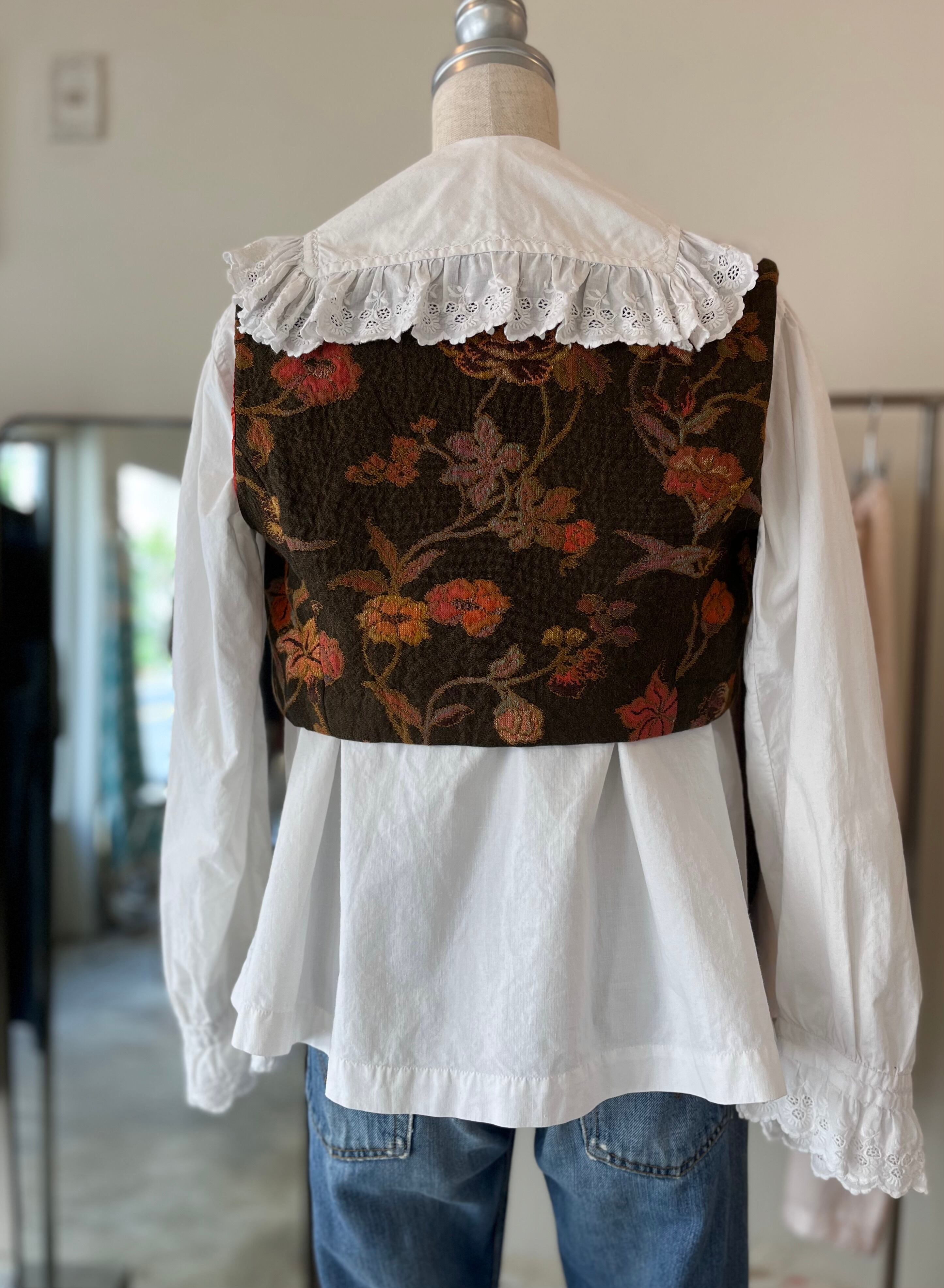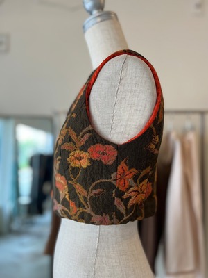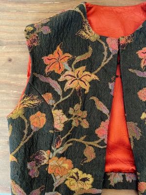 コンパクトなサイズのベストです。前あきにはホックが付いており、全て閉めるとコルセットのような雰囲気にもなります。