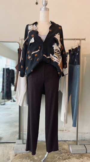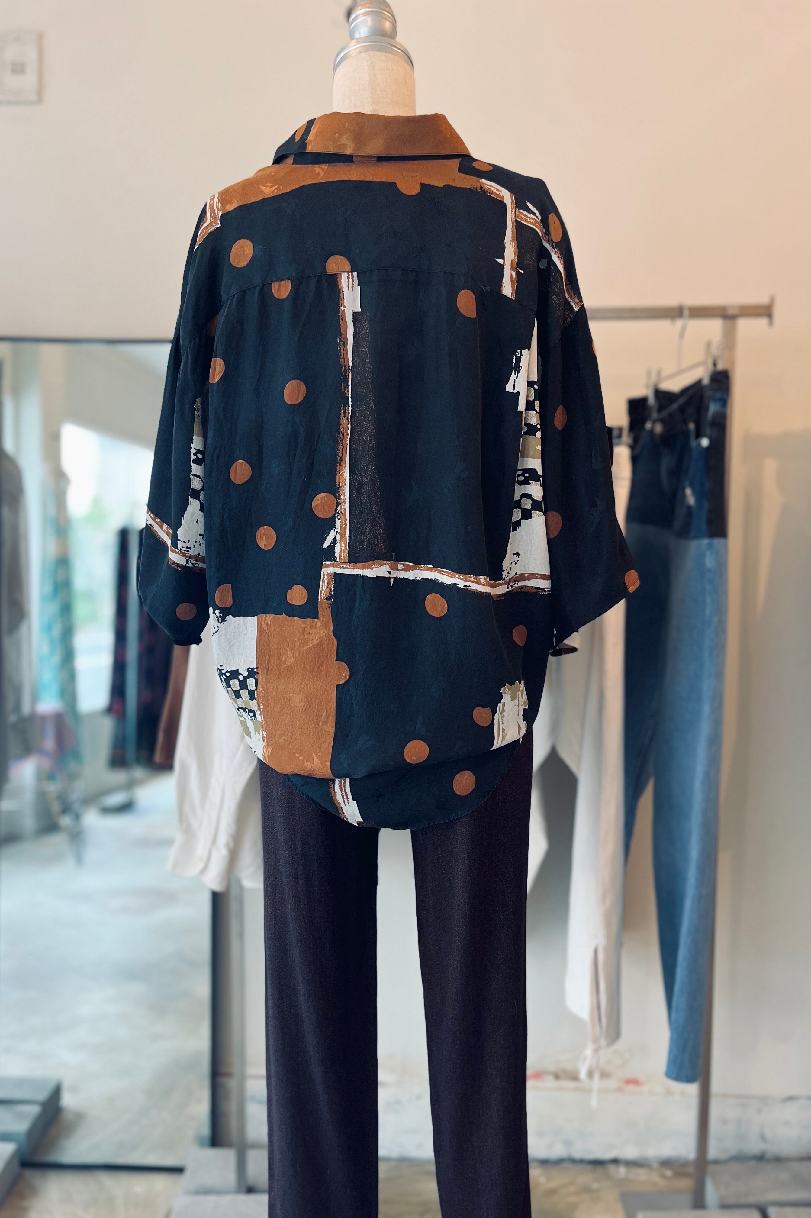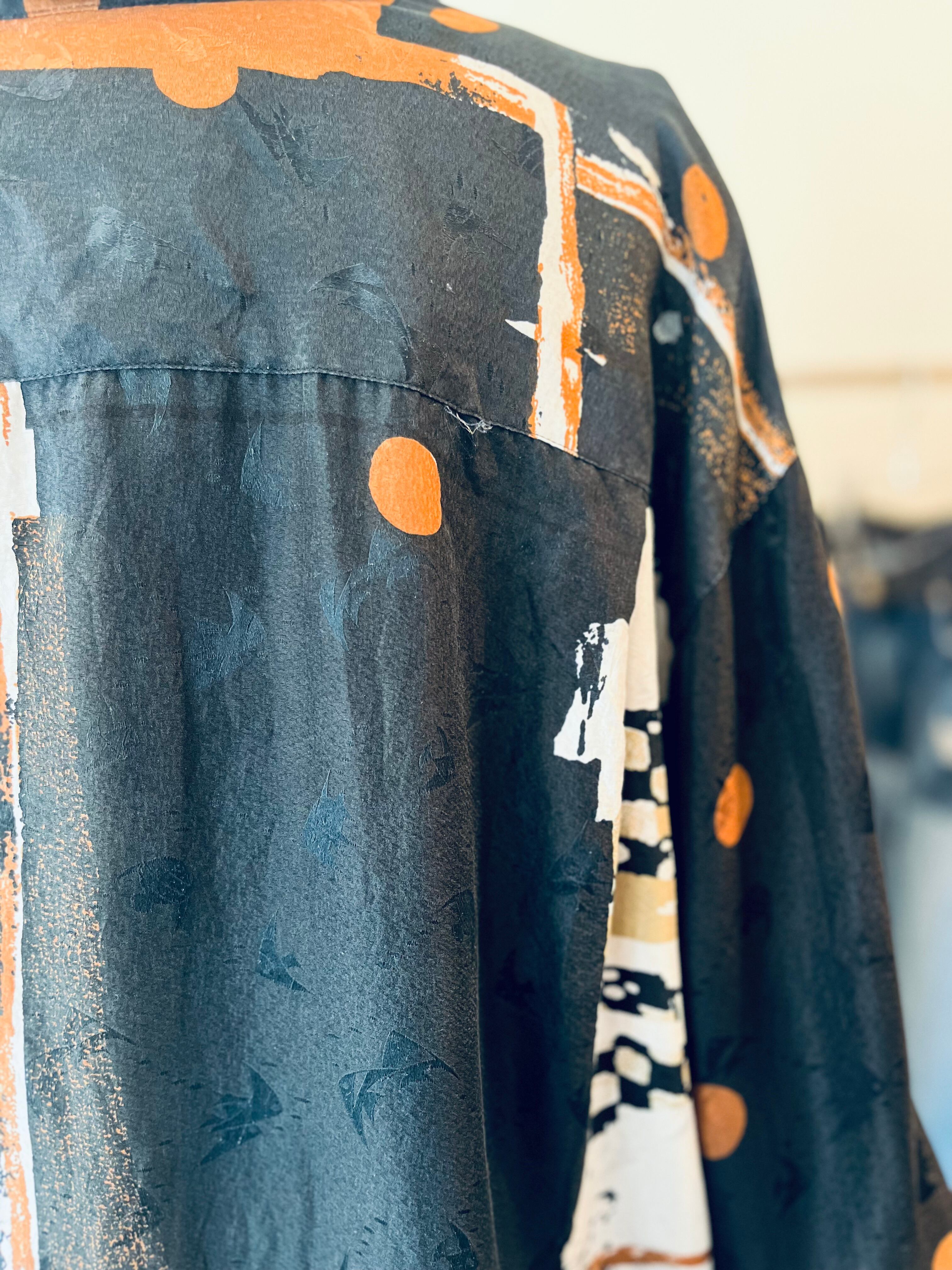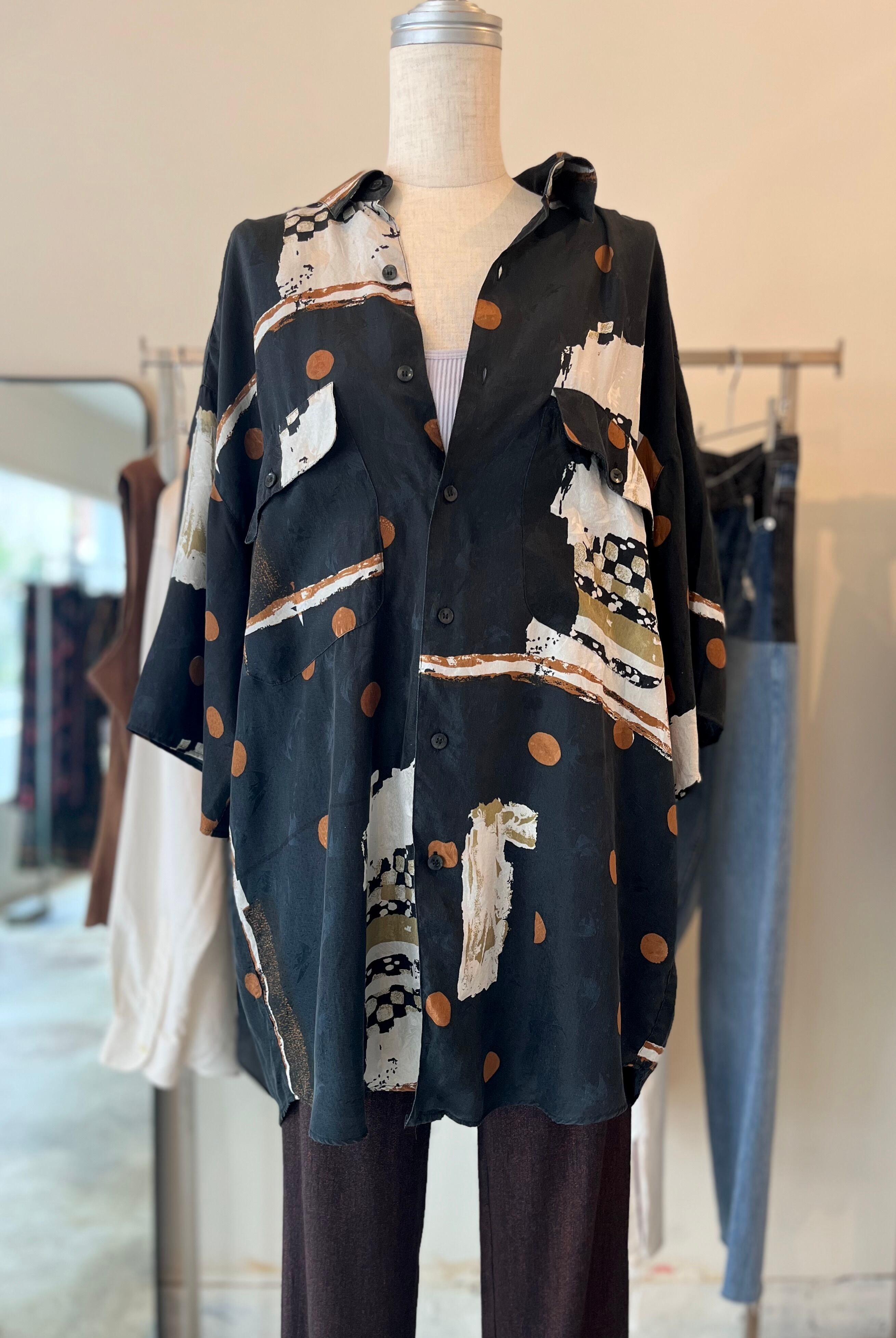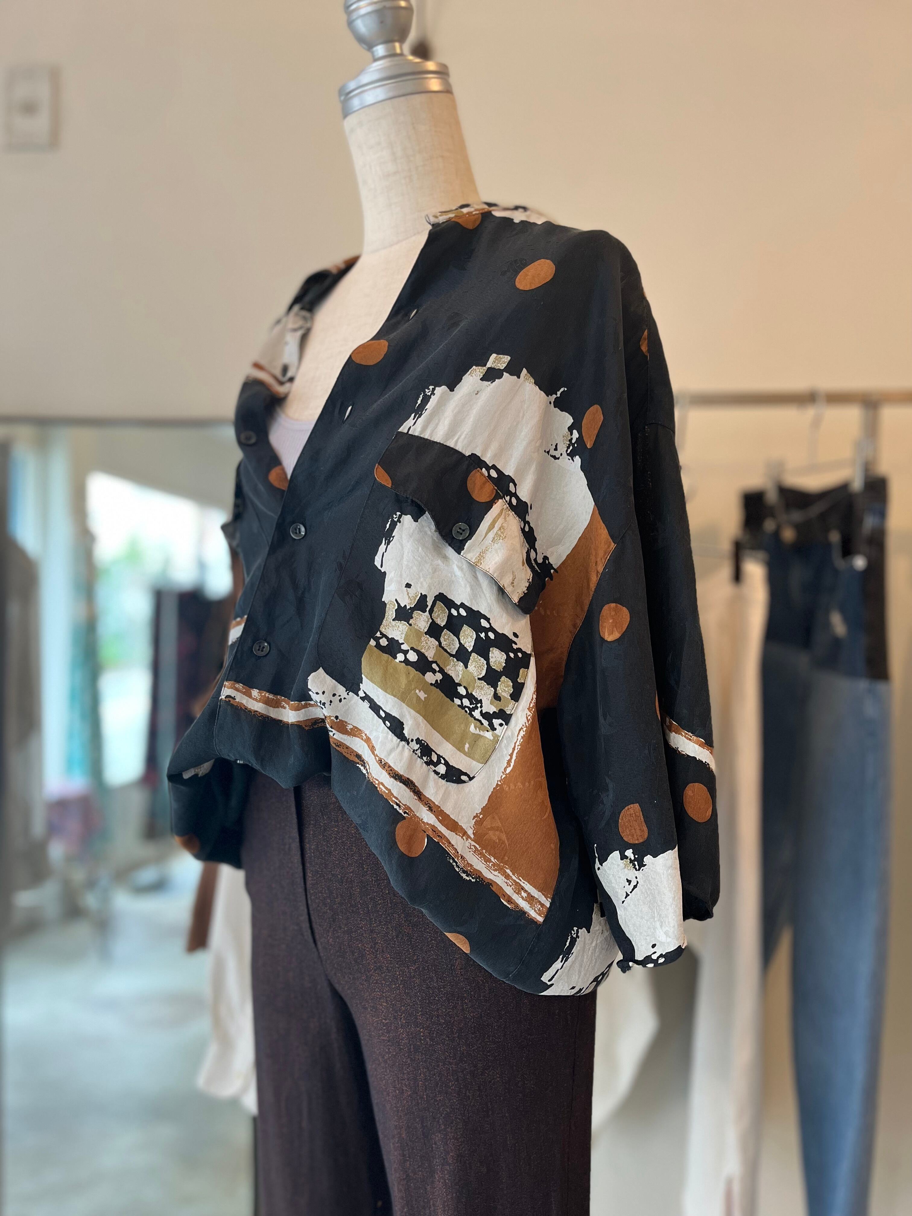 五分袖くらいの半袖で、だいたい肘くらいの丈になるので夏の羽織りにぴったりのシルクシャツです。