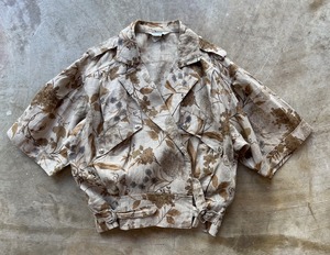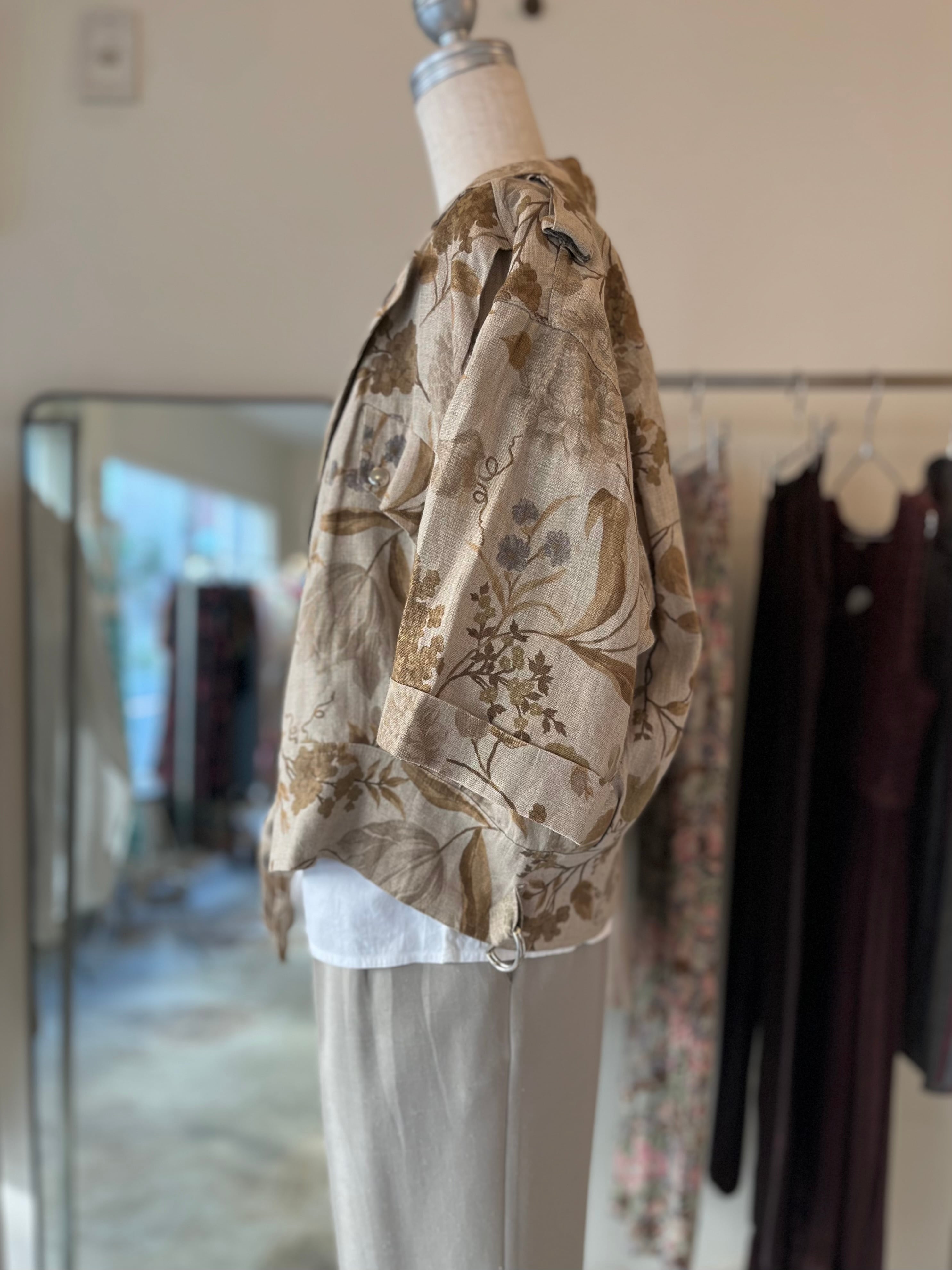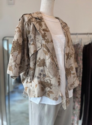 リネンのデザインジャケットです。晩夏らしい柄とカラーリングで、肌寒い日や日差しよけの羽織りに。