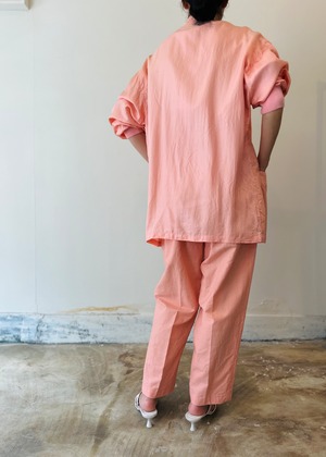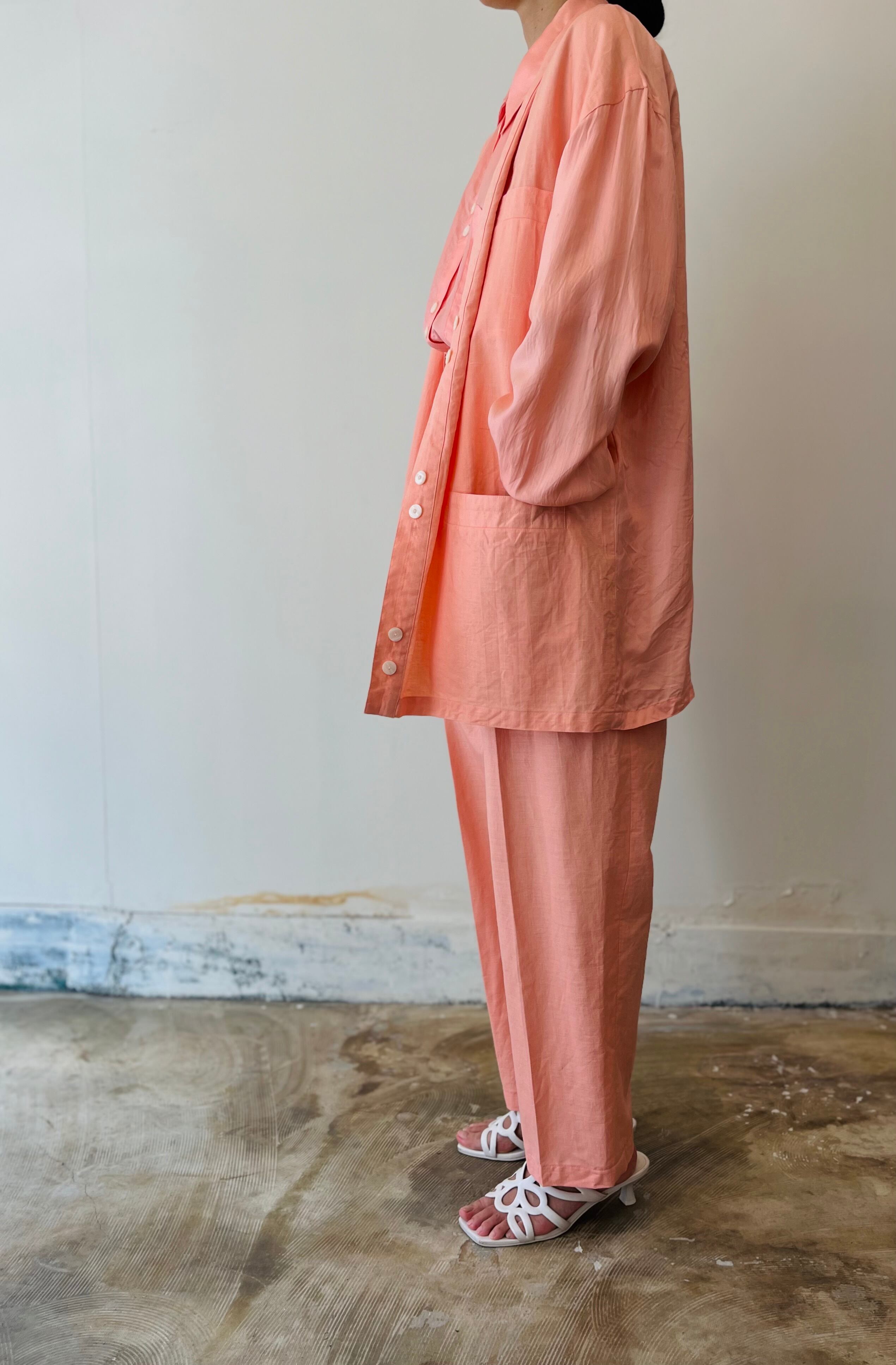 3pieceのジャケットです。前見頃がコットンリネン、後見頃と袖はシルク素材なので肌触り良く涼しい羽織りです。袖口は柔らかいリブになっておりカジュアルな仕様です。単品でも通年活用できるアイテムです。