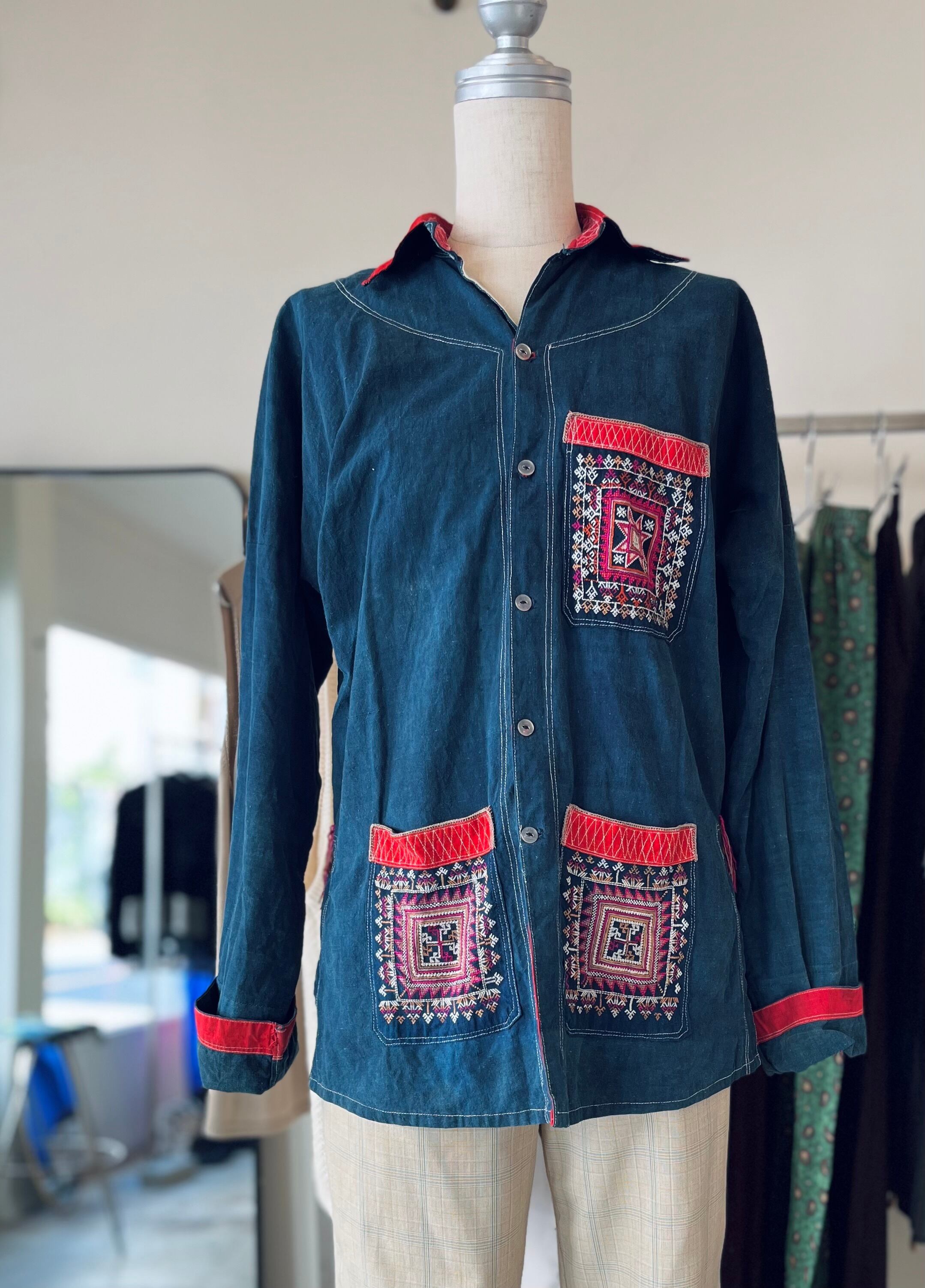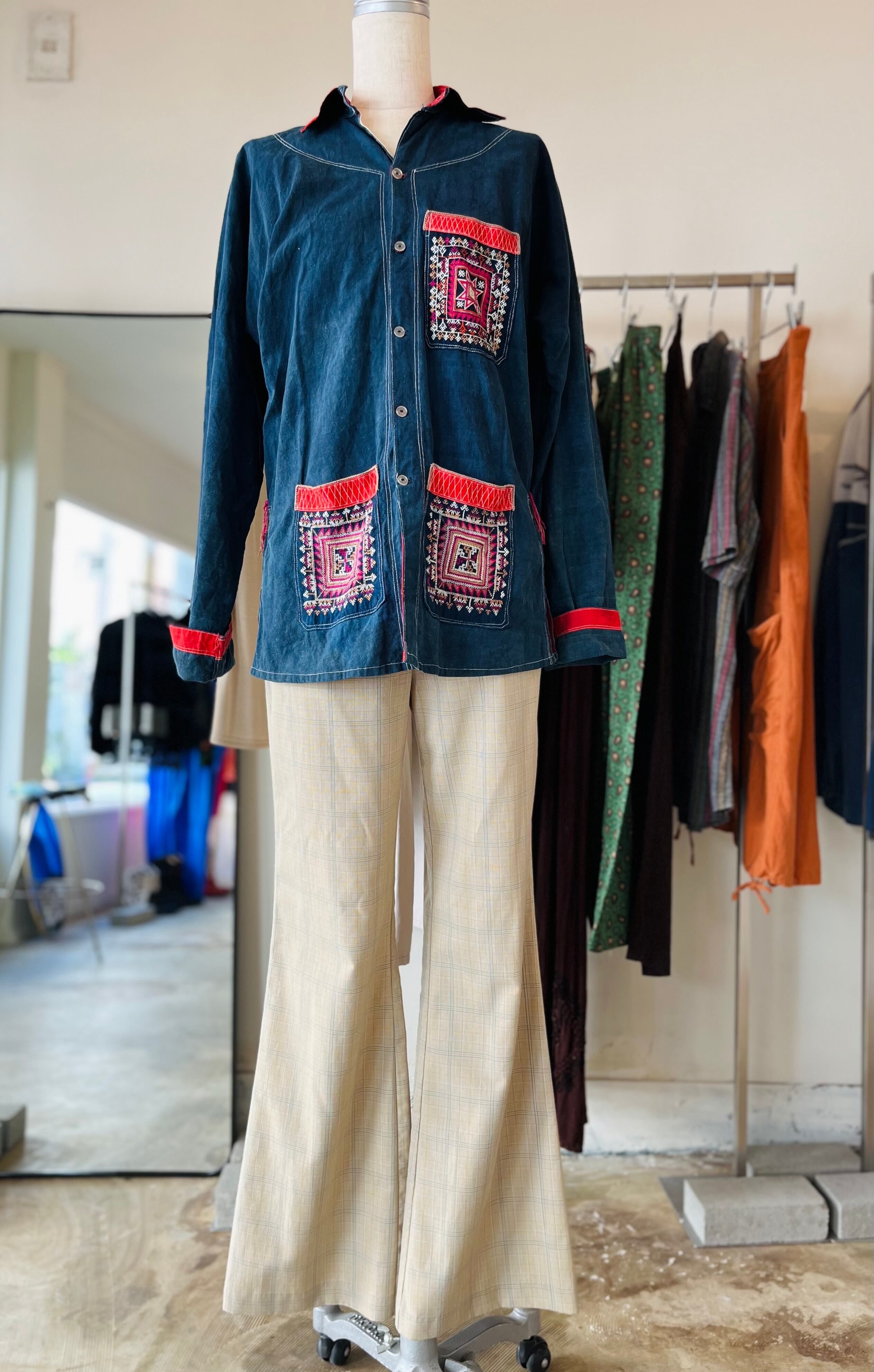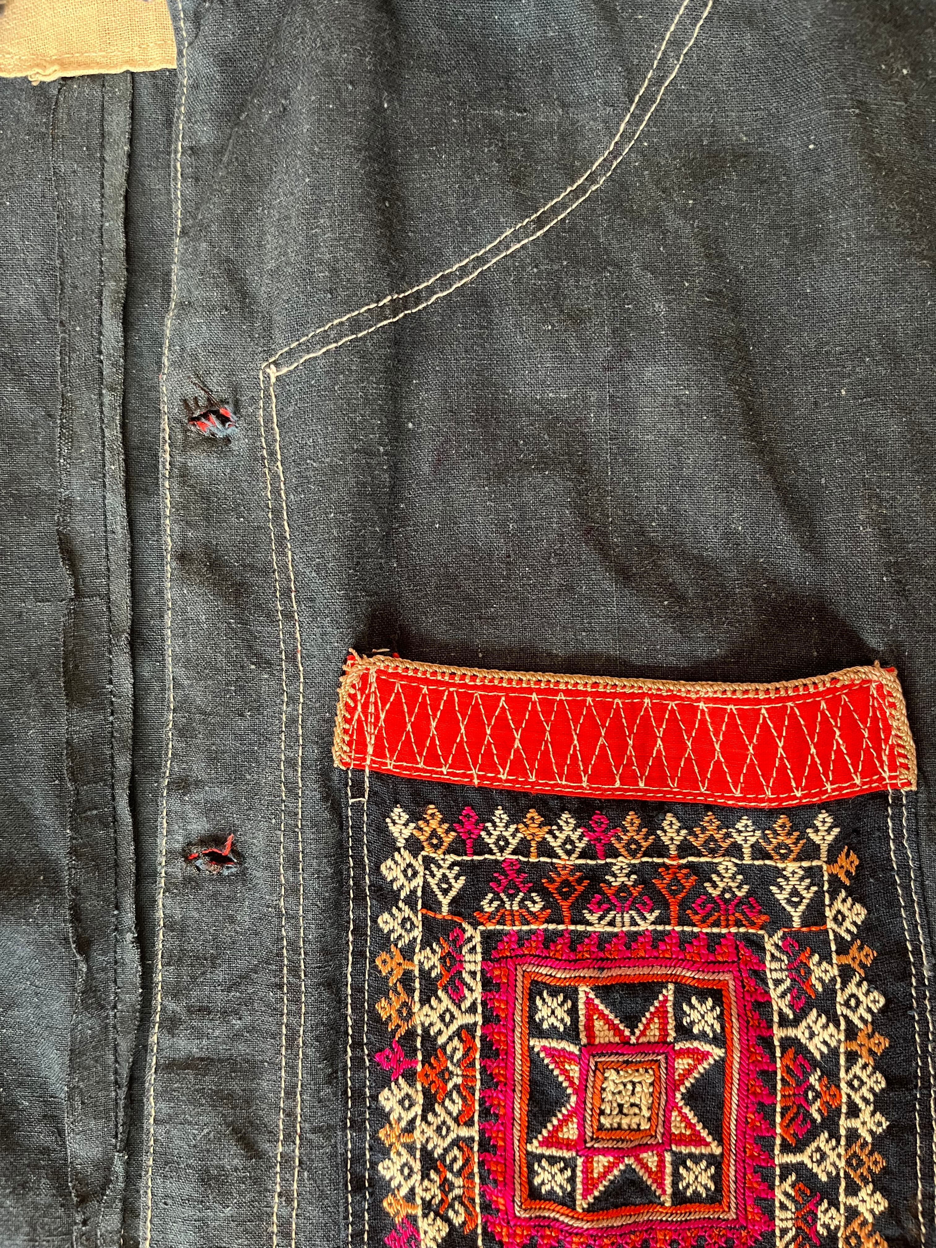 細やかな刺繍の魅力はもとより、台襟やポケットの縁取り等の端々にまでしっかりステッチワークが施されています。決して高性能ではないミシンだからこその、頼りないステッチもデザインの一部となっているのがビンテージの魅力です。