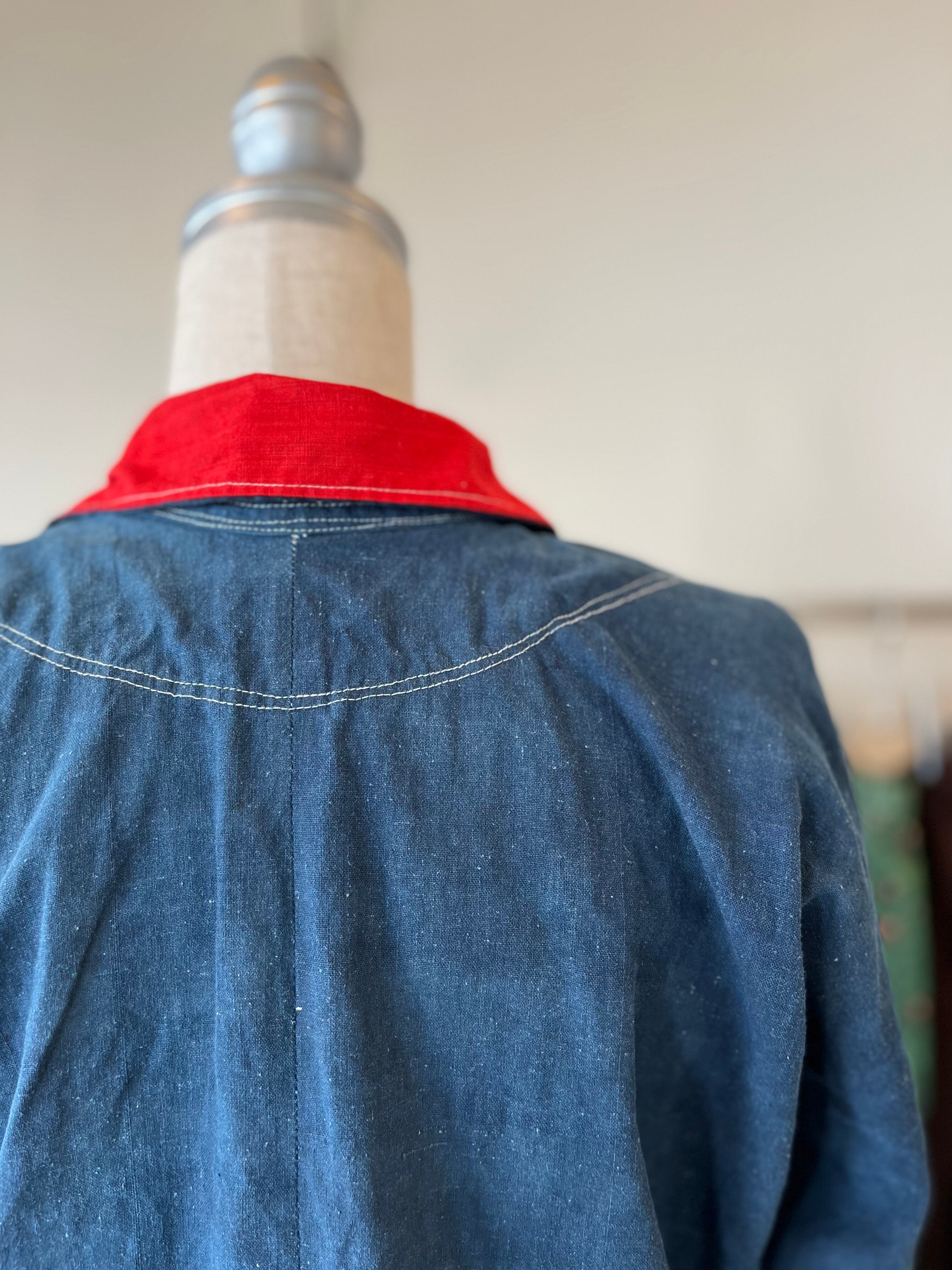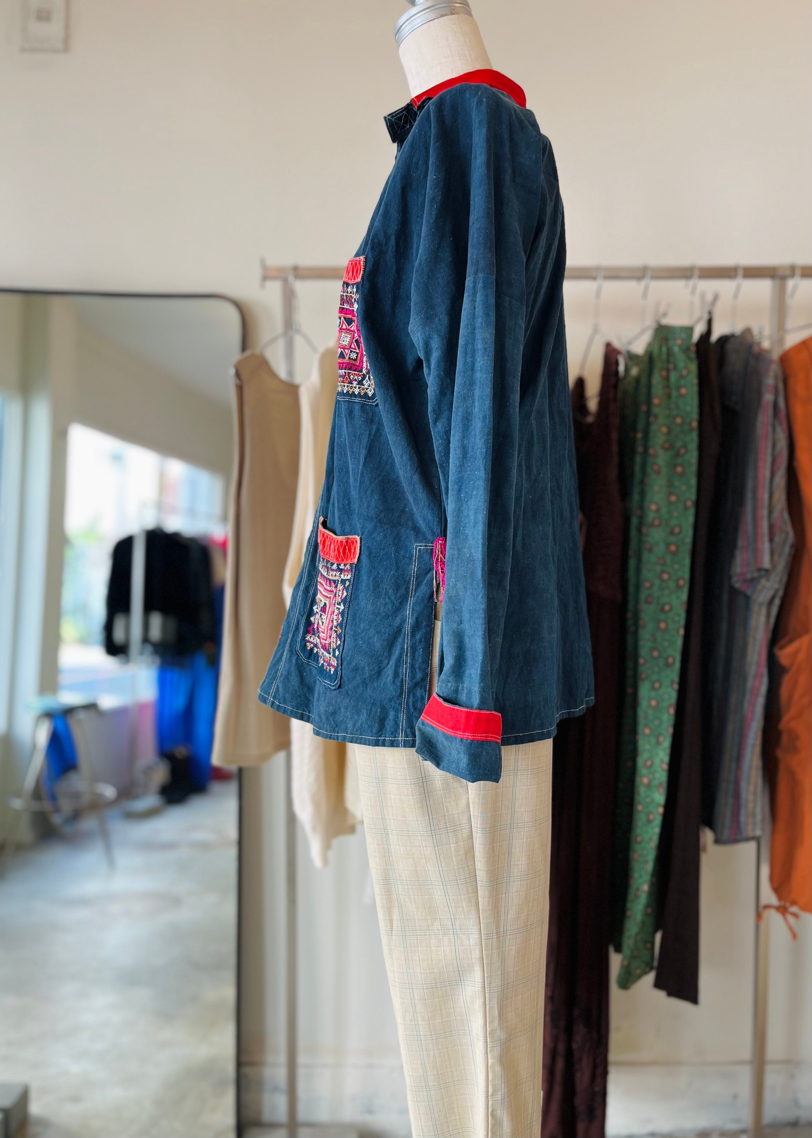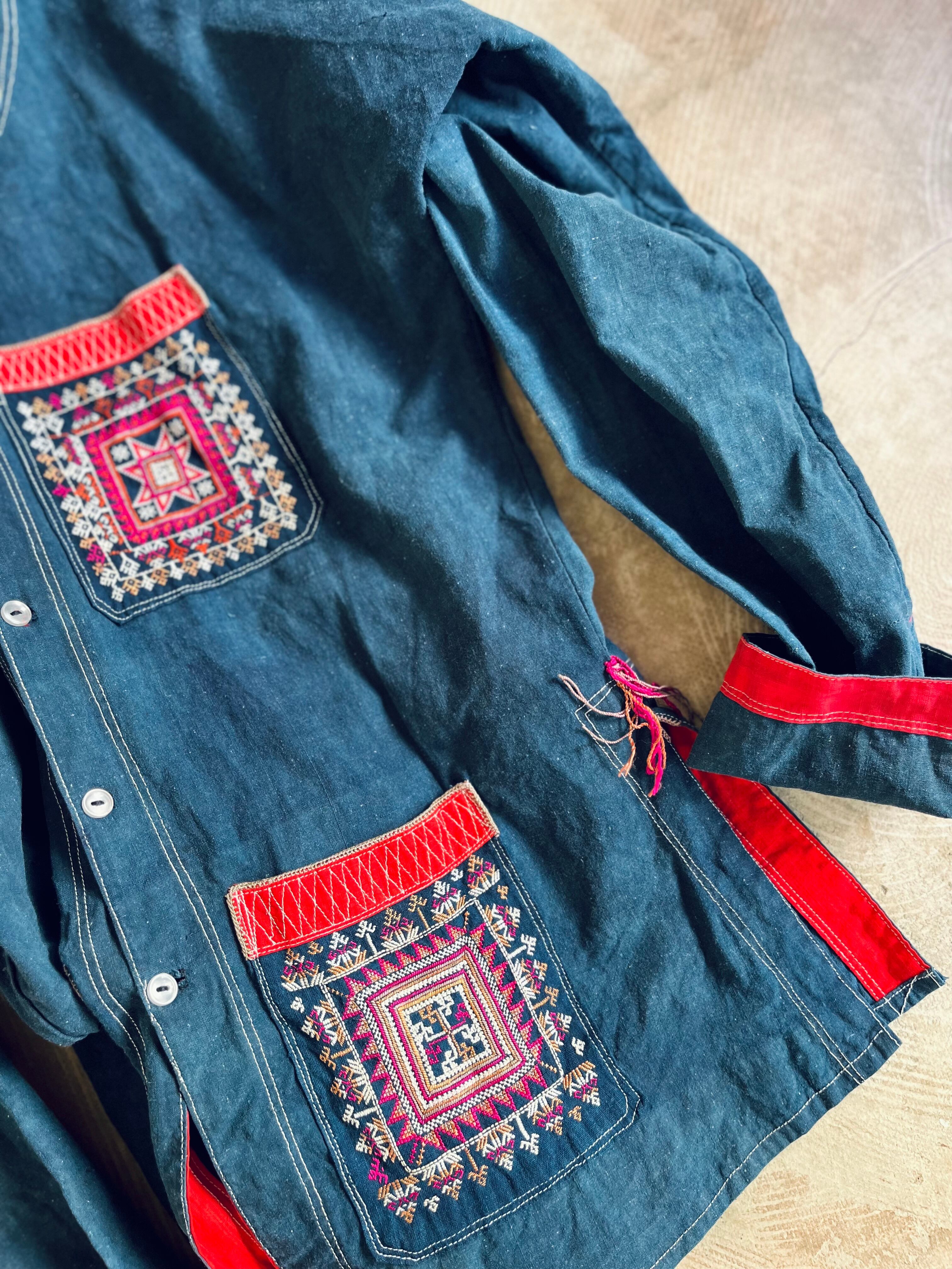 細やかな刺繍の魅力はもとより、台襟やポケットの縁取り等の端々にまでしっかりステッチワークが施されています。決して高性能ではないミシンだからこその、頼りないステッチもデザインの一部となっているのがビンテージの魅力です。