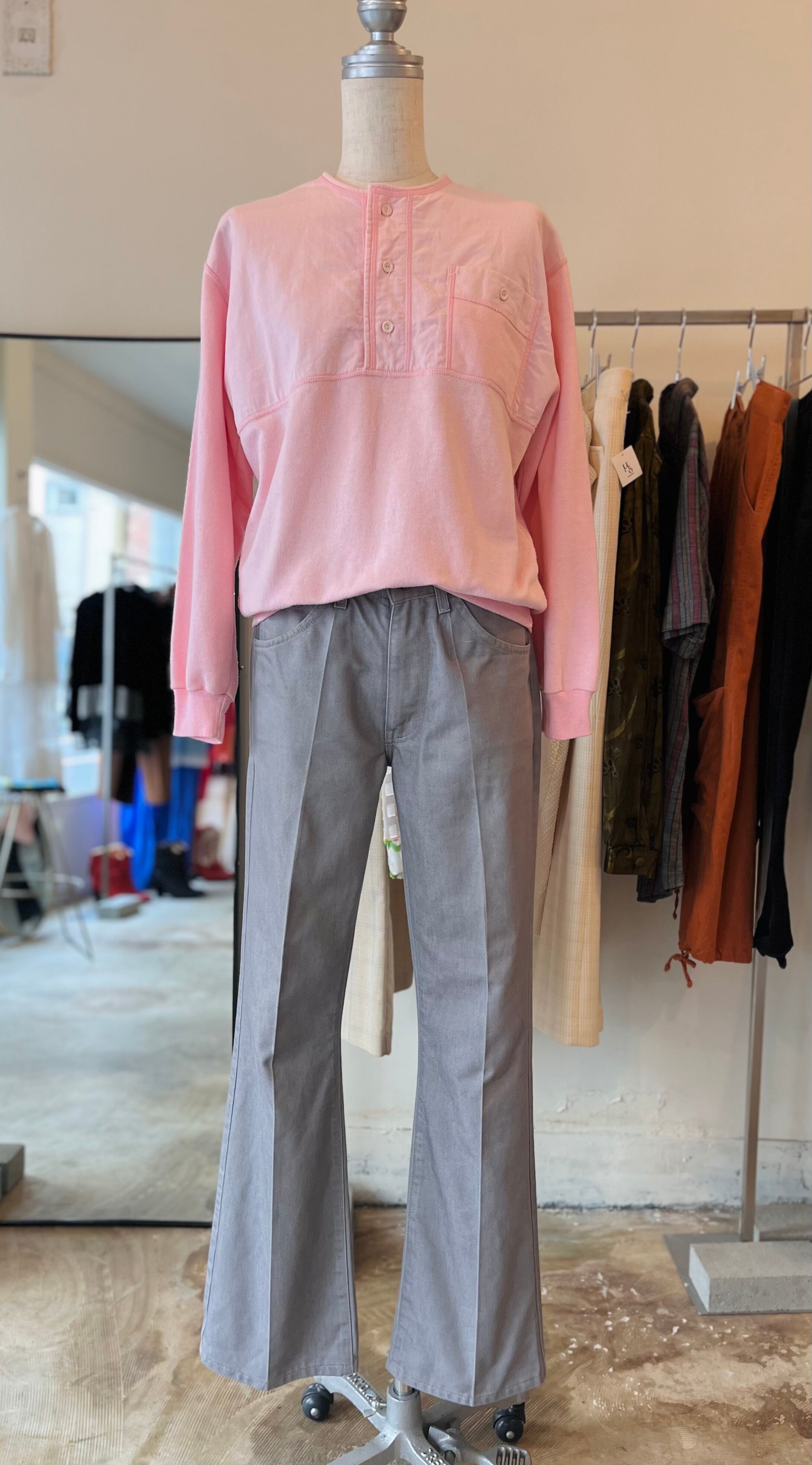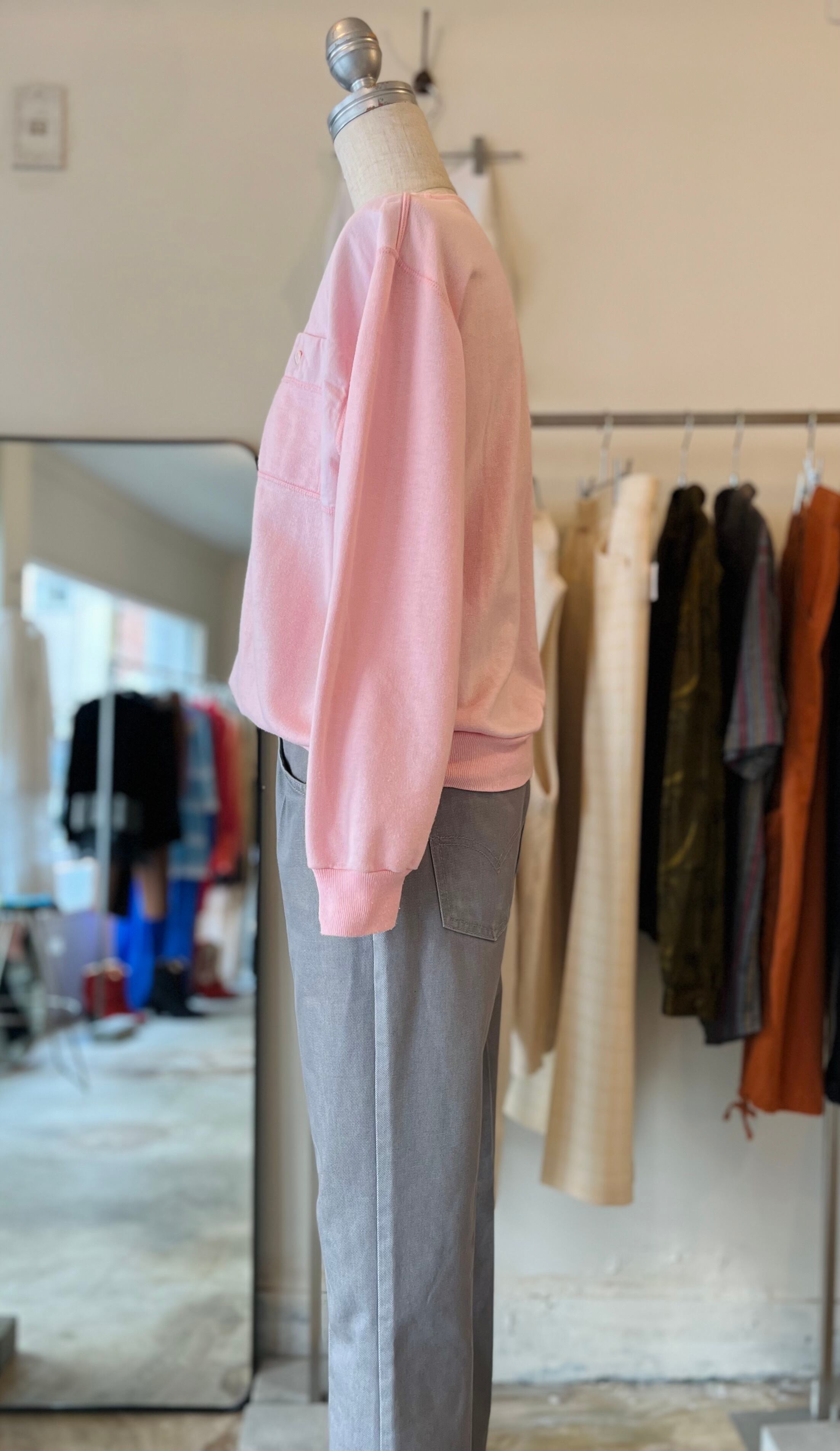 ベビーピンクが珍しい裏毛のスウェットです。前見頃の上側は布帛仕立ての切り替えになっており、スウェットですがデザイン性があるのがポイントです。女性にぴったりなコンパクトなサイズ感で、アウターの中にも着やすく便利なアイテムです。