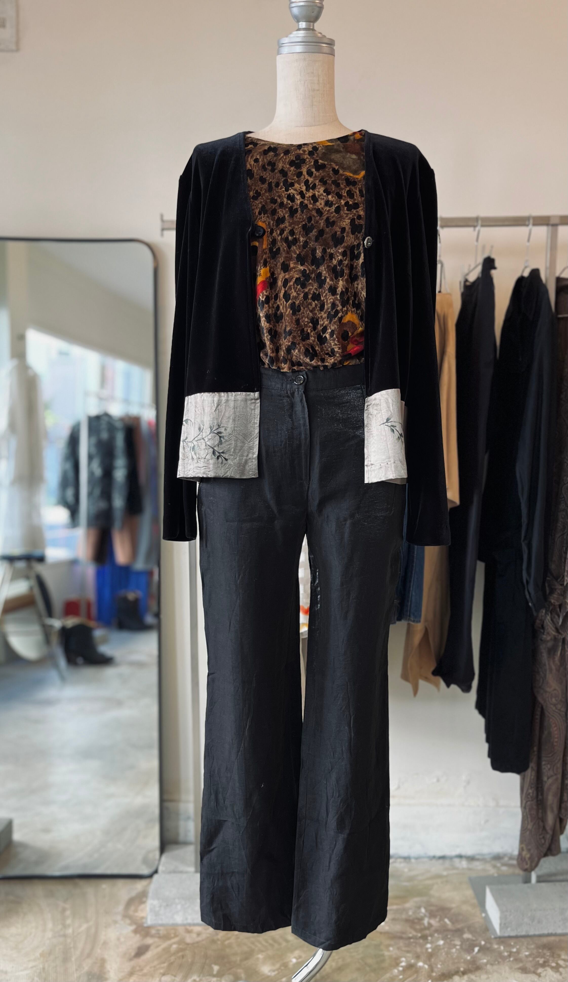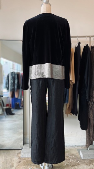 伸縮性があり滑らかなベルベットの裾に素敵な切り替えのあるカーディガンです。切り替え部分の素材は不明ですが、サテンで絹のような上品な光沢があります。