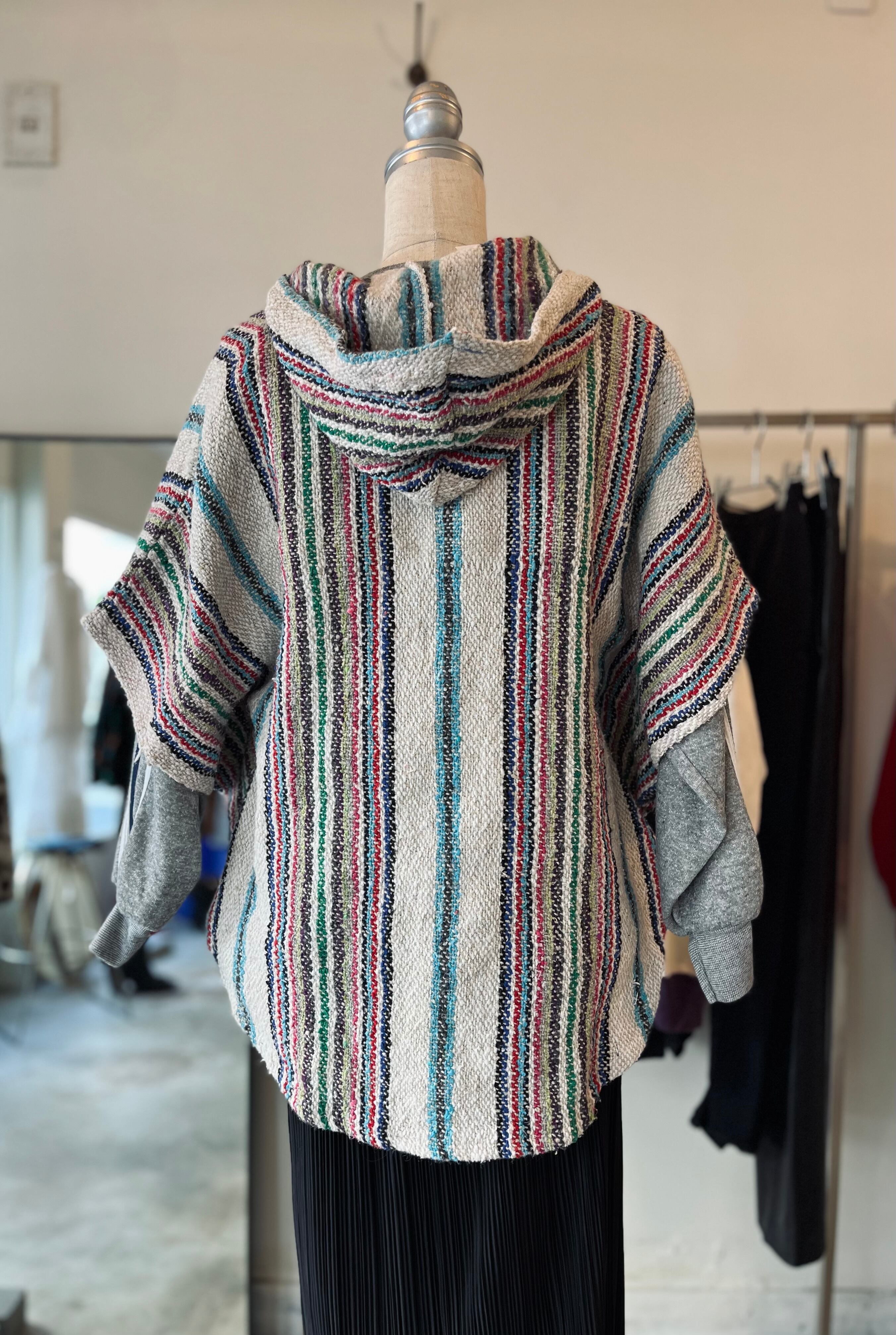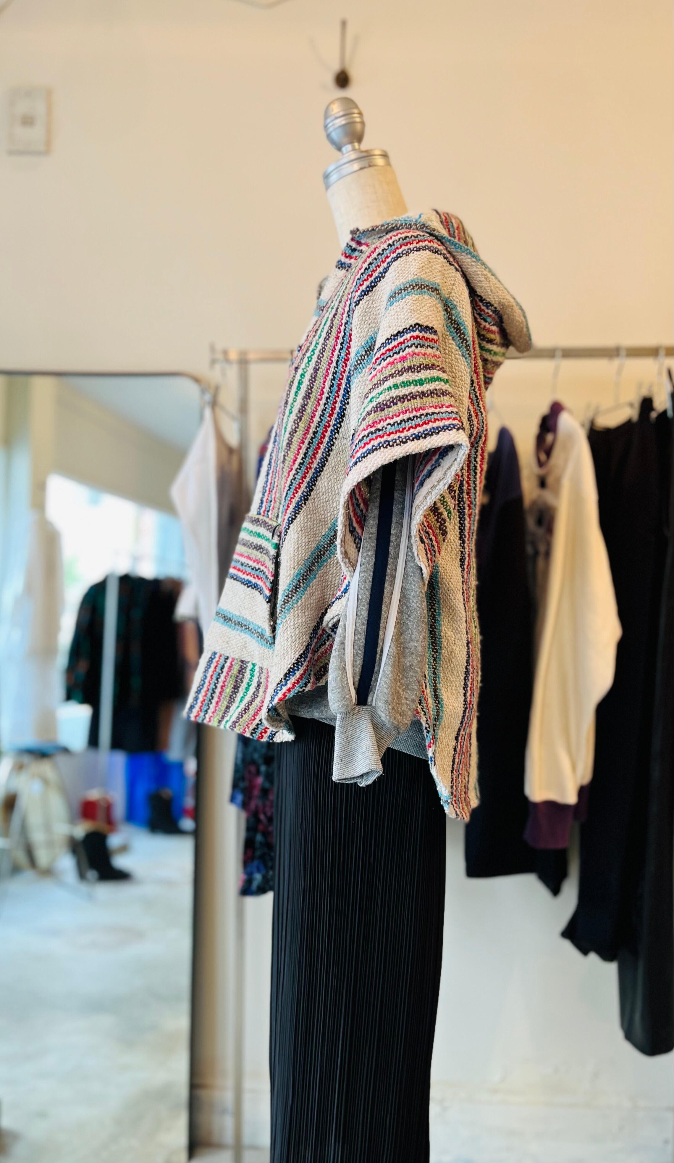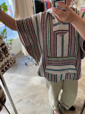 マルチカラーのストライプがかわいいメキシカンビンテージのポンチョです。サイズ感もコンパクトなので女性でも着用しやすく、スウェットやニットに重ねて気温に合わせてコーディネートしていただけます。
