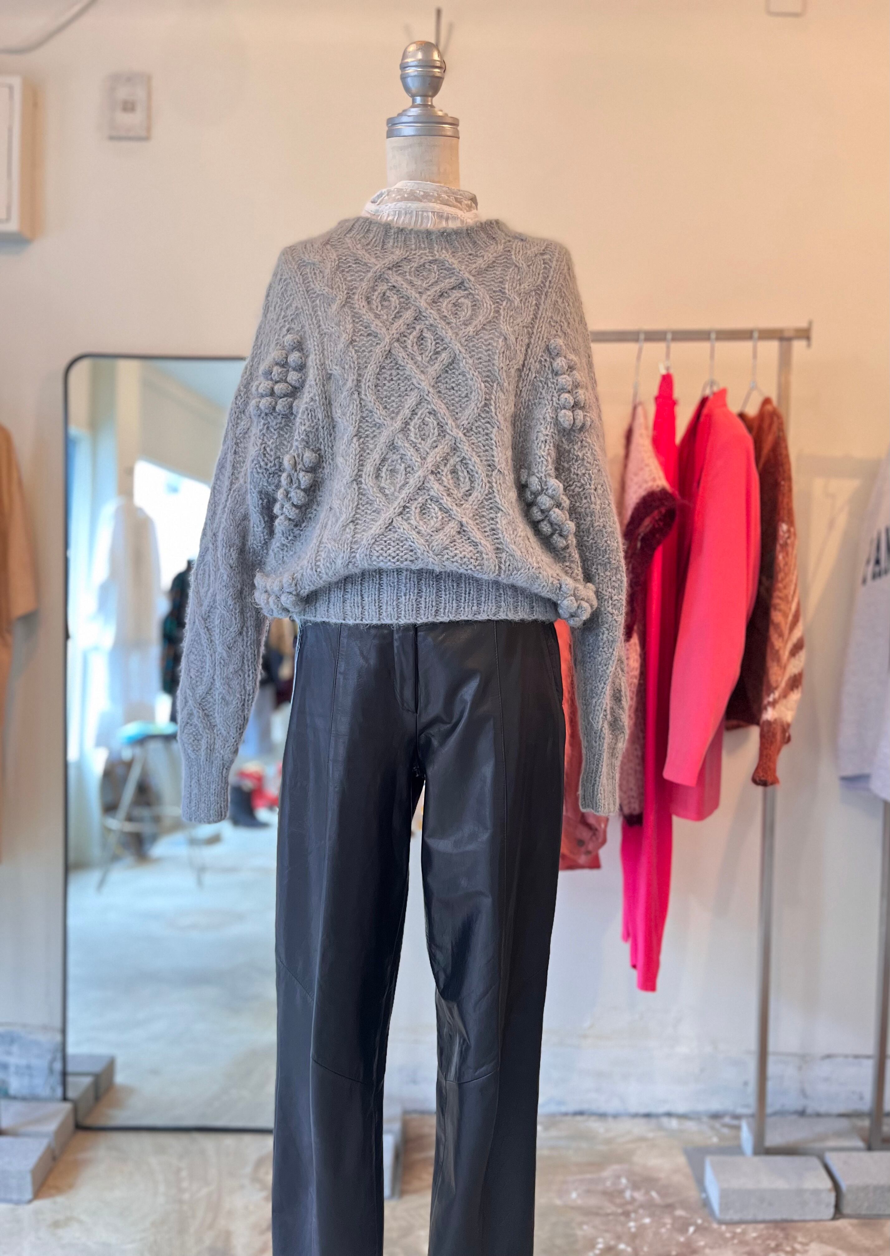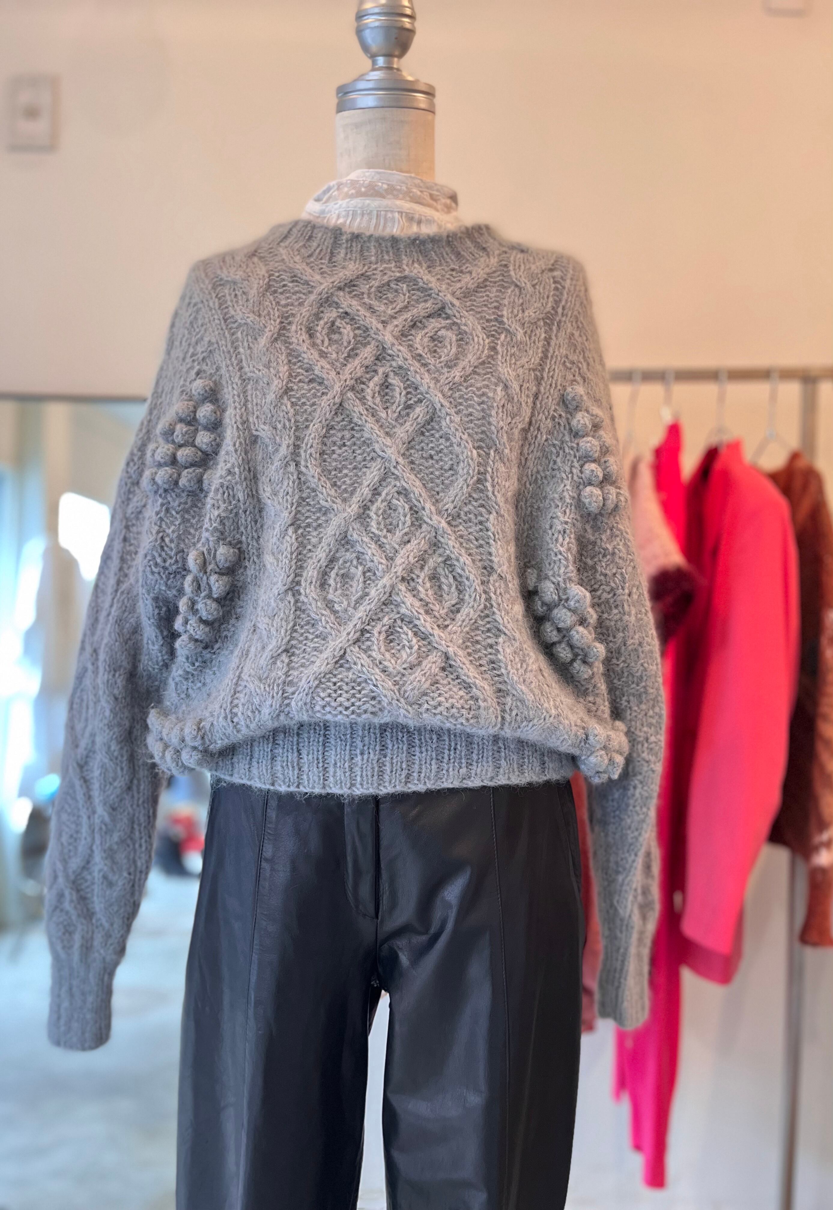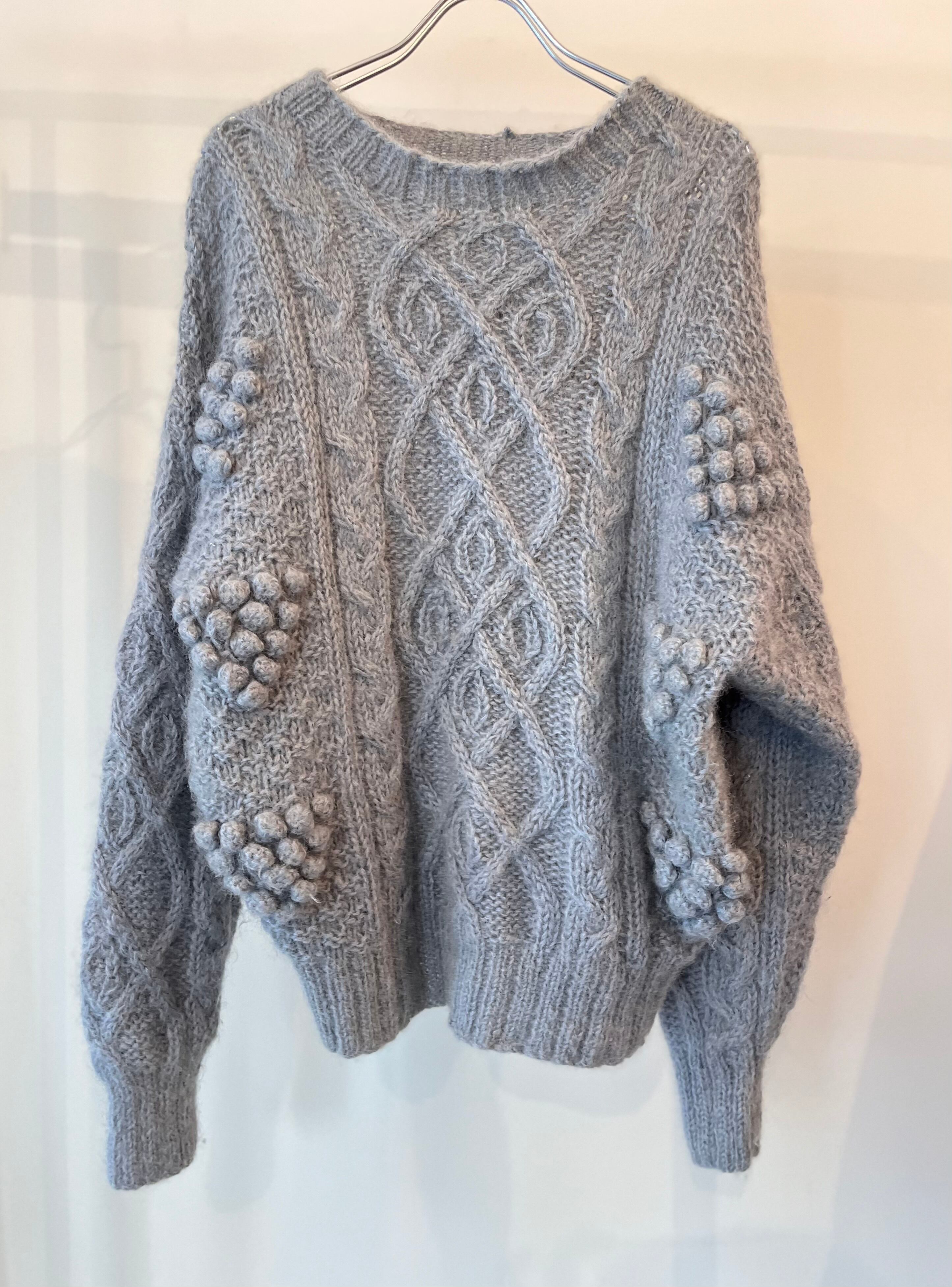 あまり見かけない位置に付けられたポンポンディテールが可愛くてデザイン性のあるニットです。一見ノーマルなケーブルニットのようで、一癖あるスタイルにしてくれる、ヴィンテージならではの1着です。