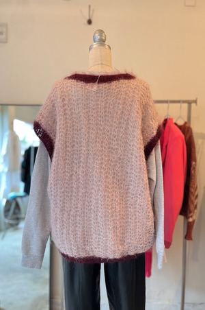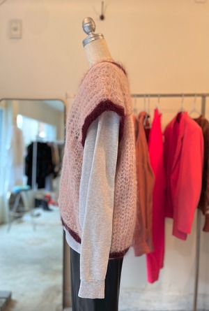 ローゲージのニットベストです。ピンクのバイカラーが可愛い。