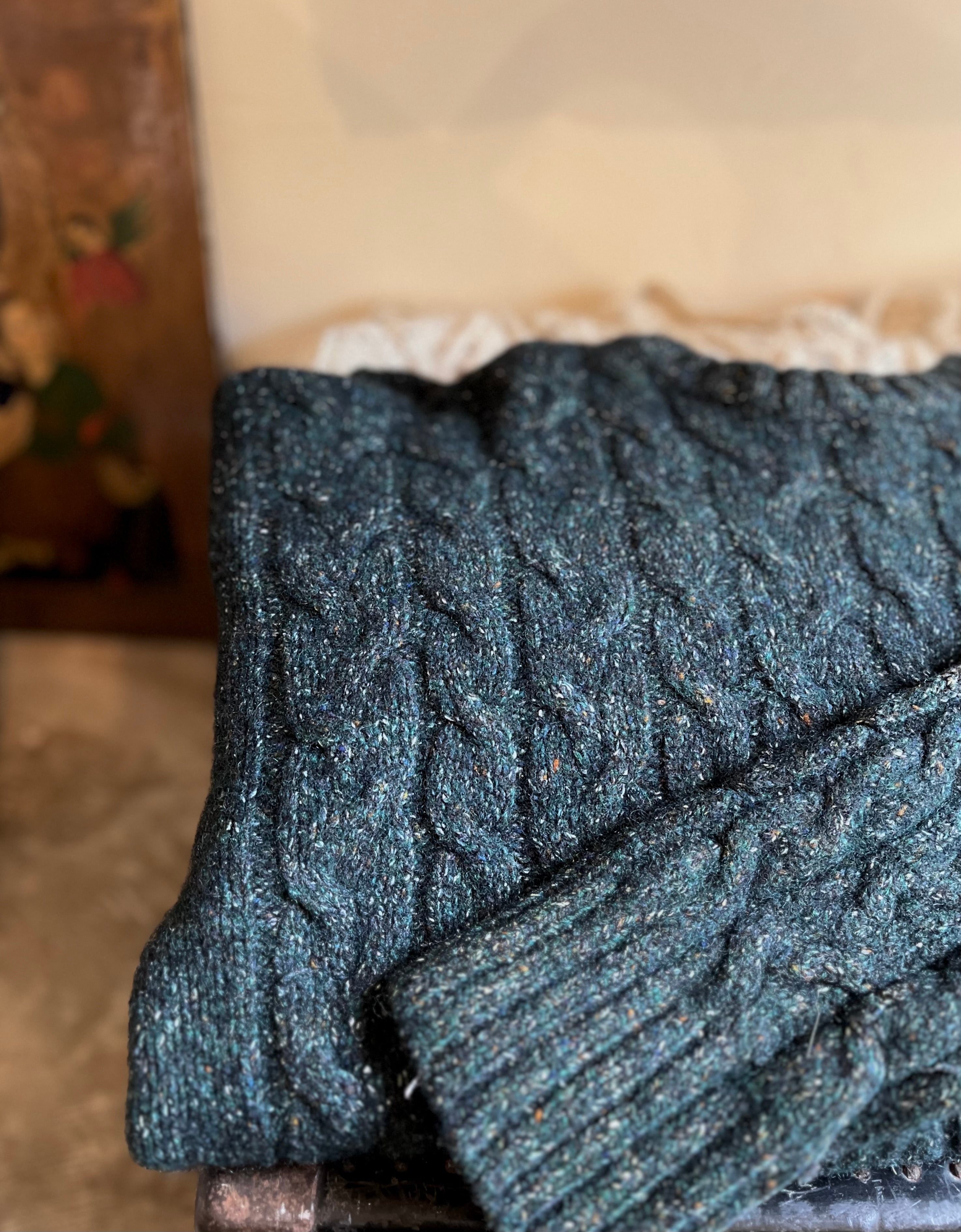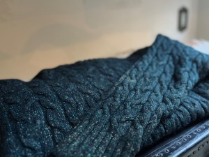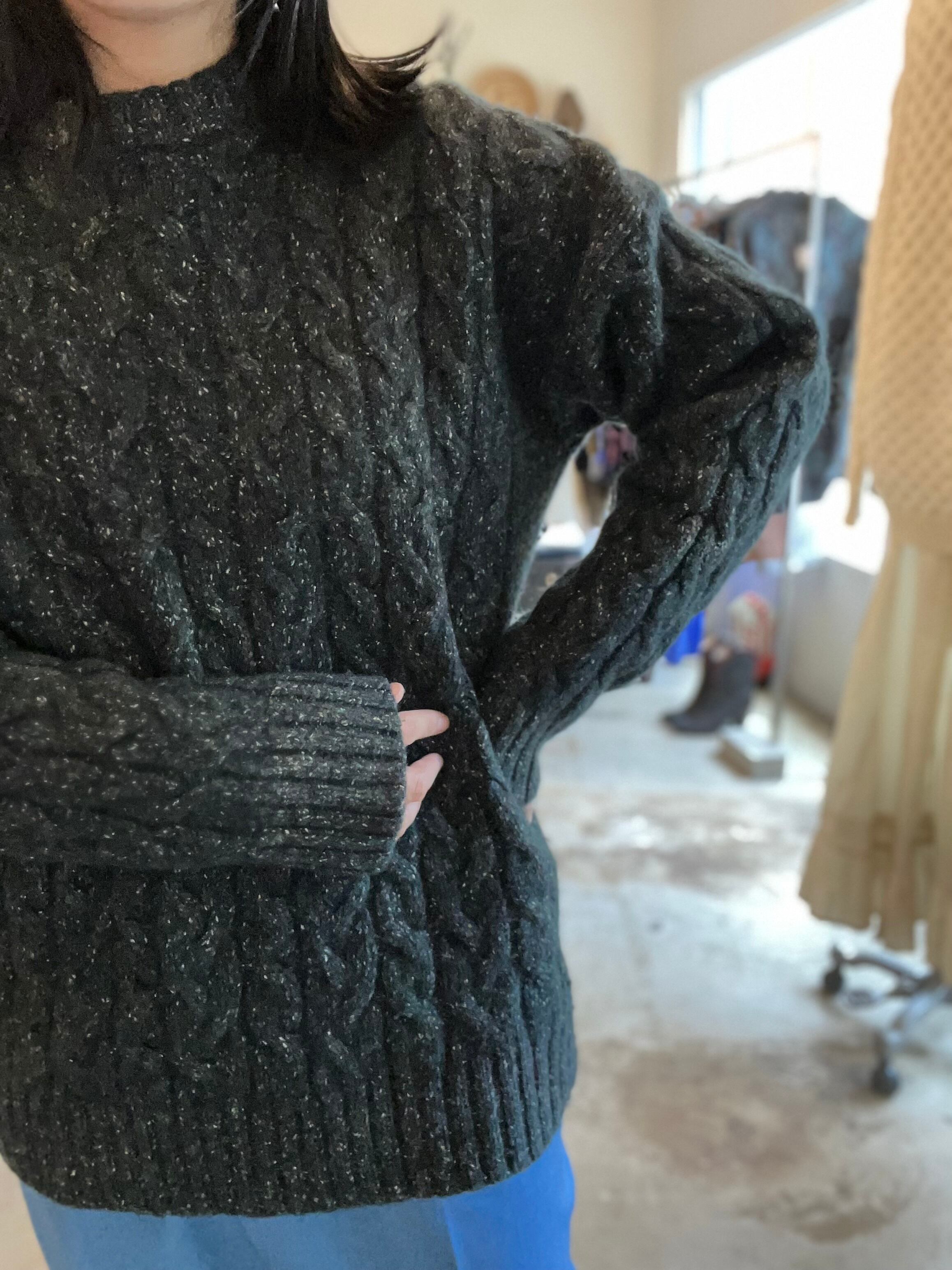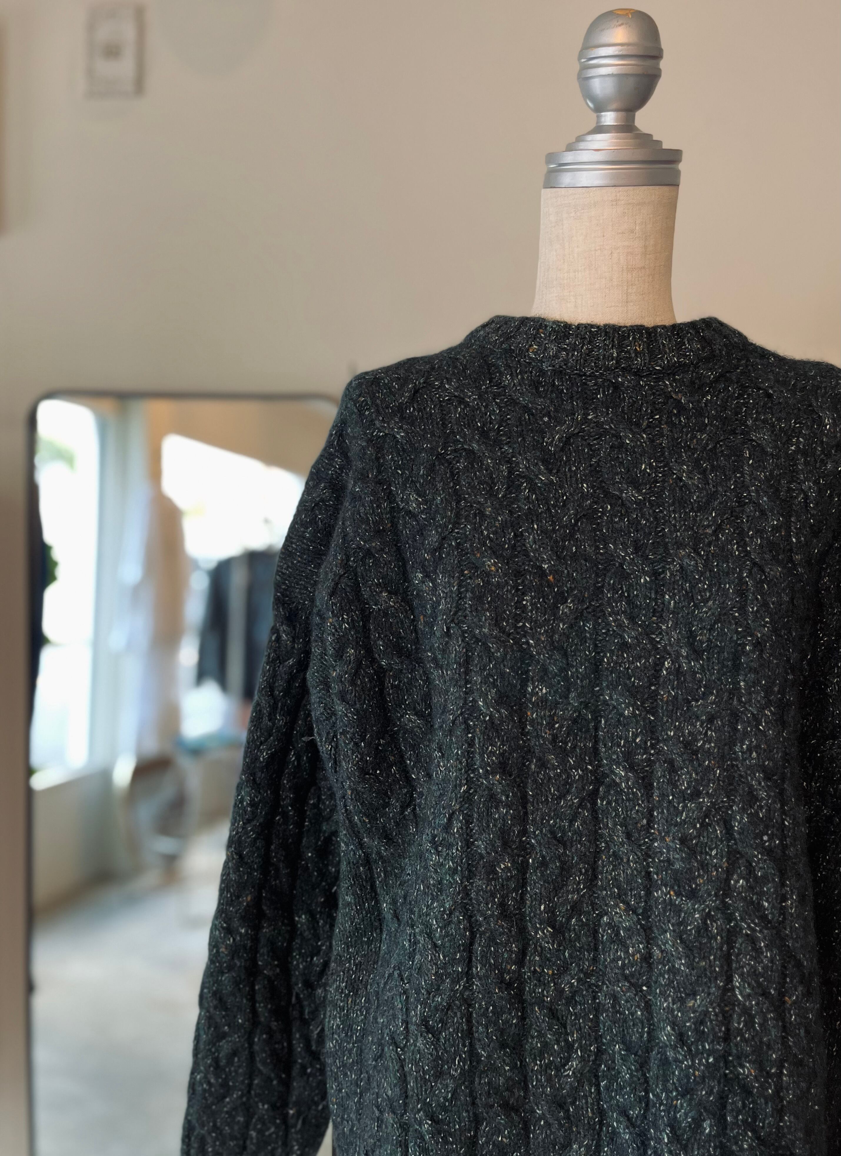 写真では色味が伝え難い、ディープグリーンのケーブルニット。実際には紺、緑、カラーネップ糸で編まれており、光の加減で見える色味が変化します。深みのある大人の色に仕上がっています。
