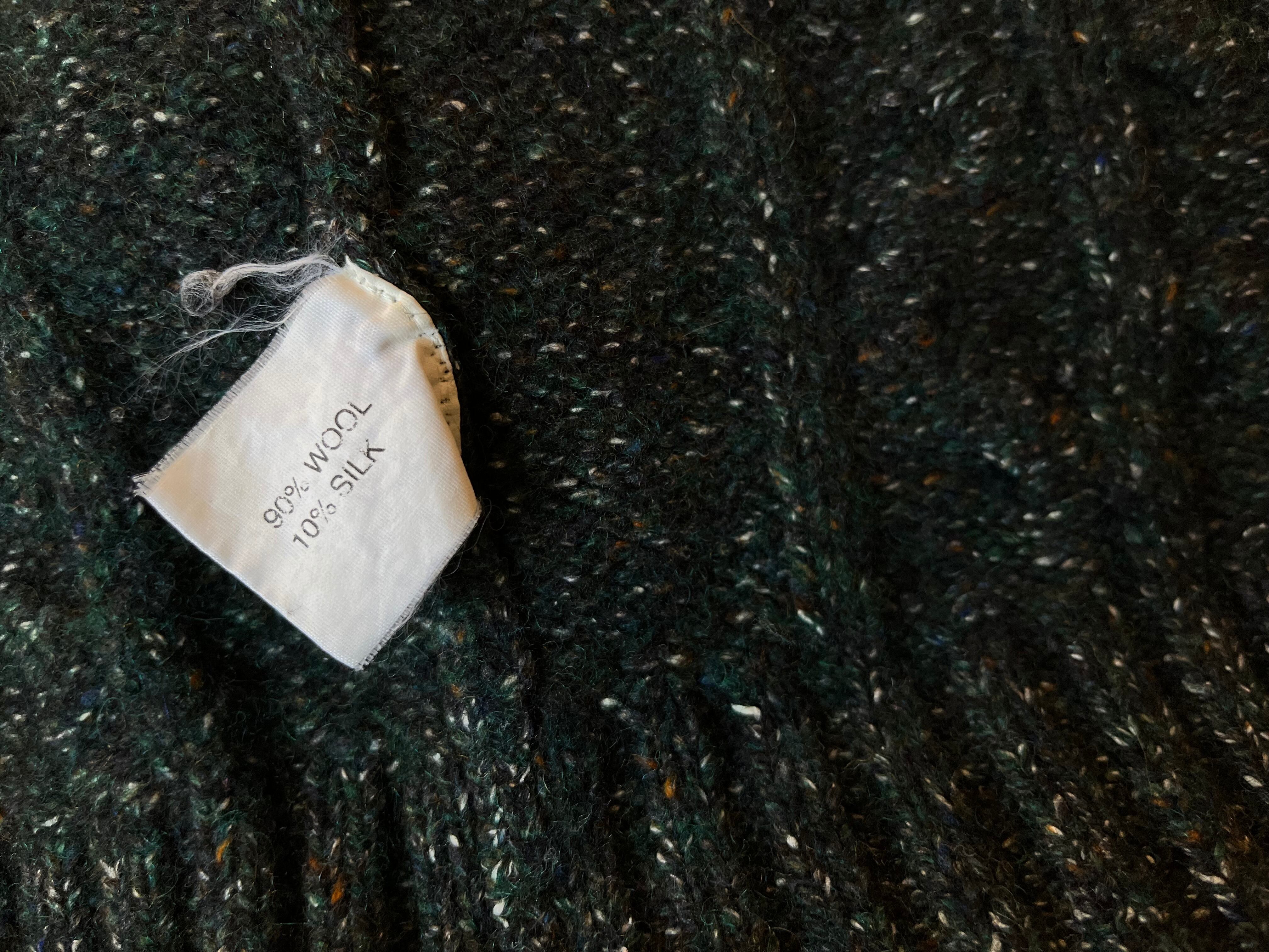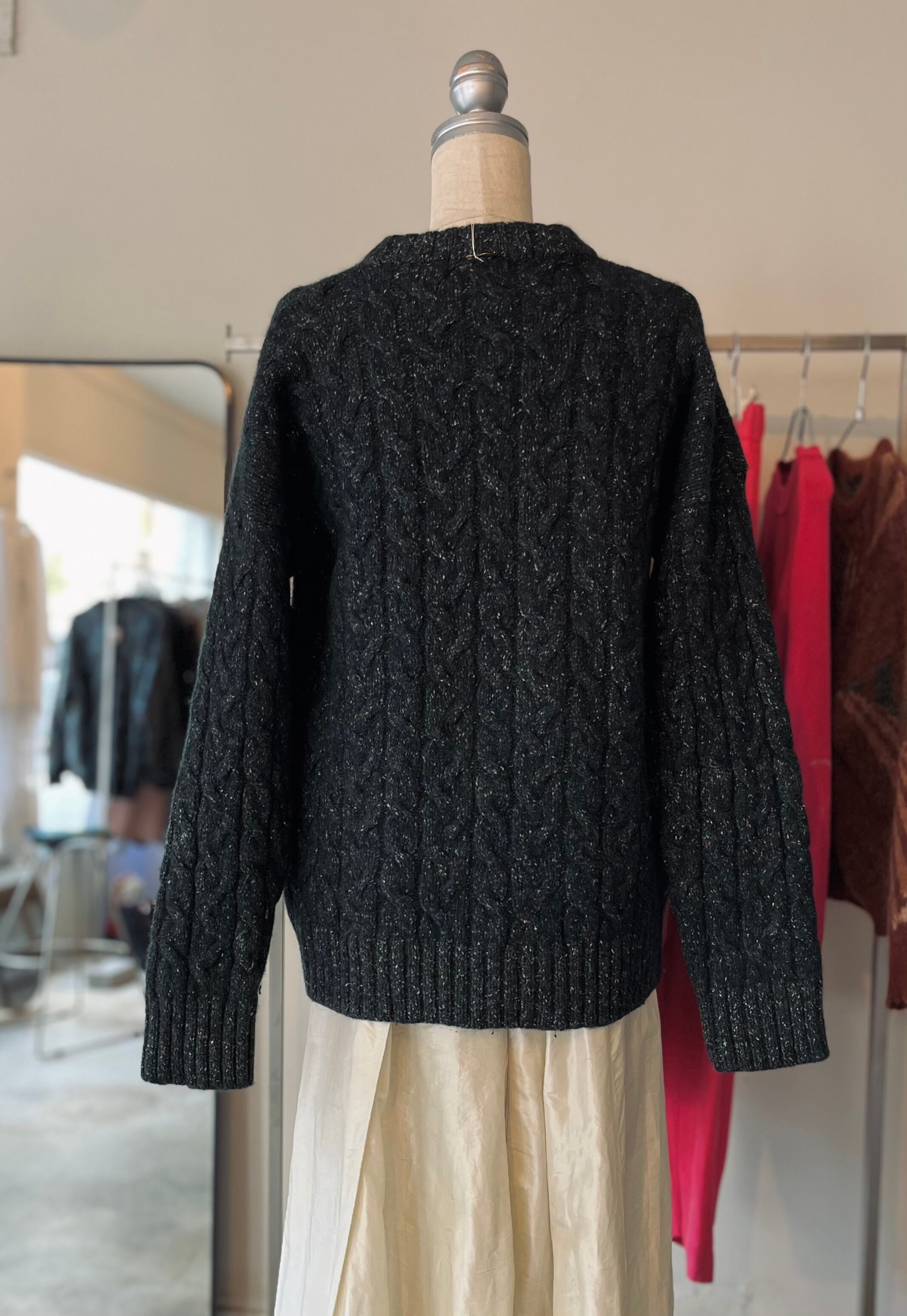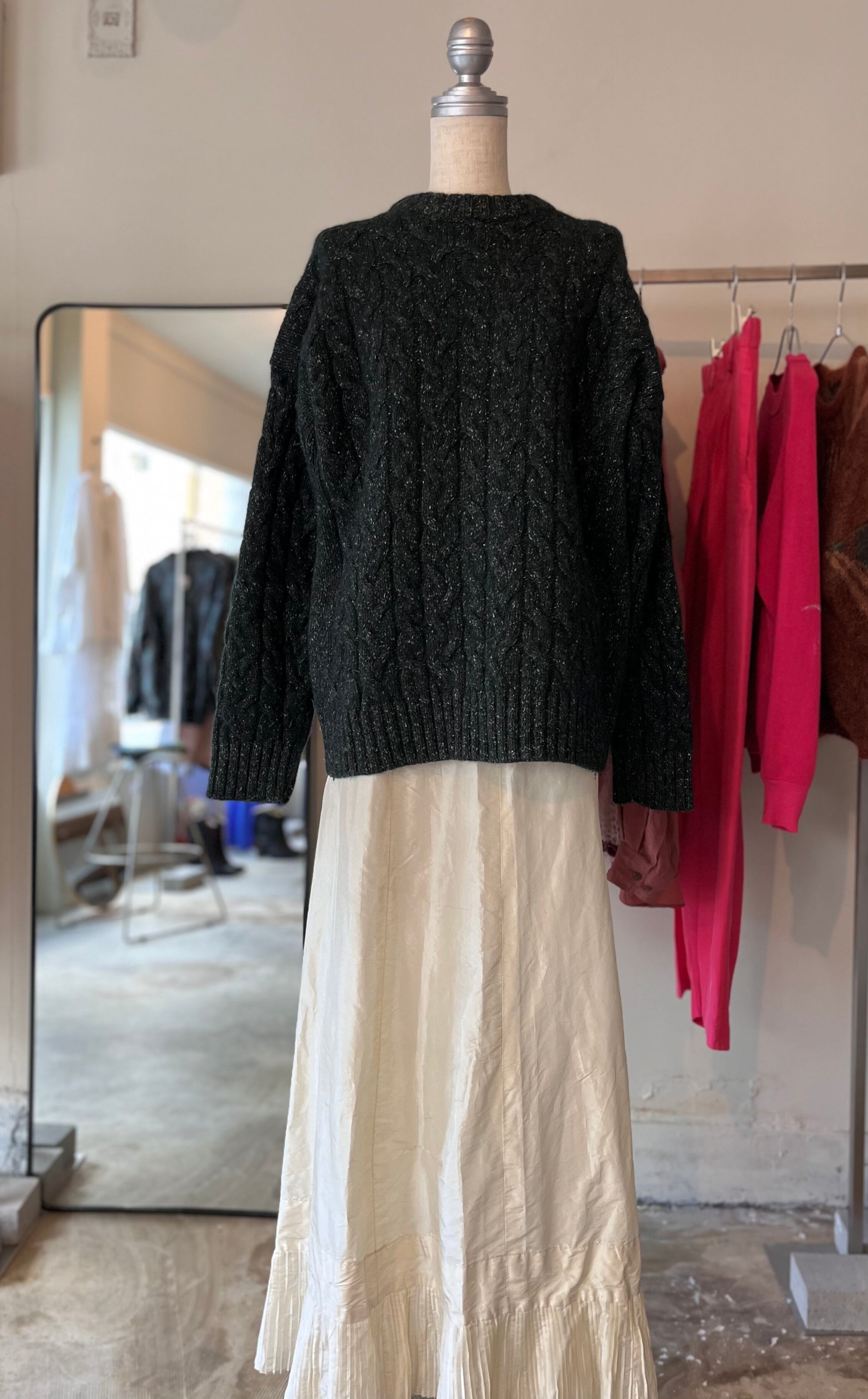 写真では色味が伝え難い、ディープグリーンのケーブルニット。実際には紺、緑、カラーネップ糸で編まれており、光の加減で見える色味が変化します。深みのある大人の色に仕上がっています。