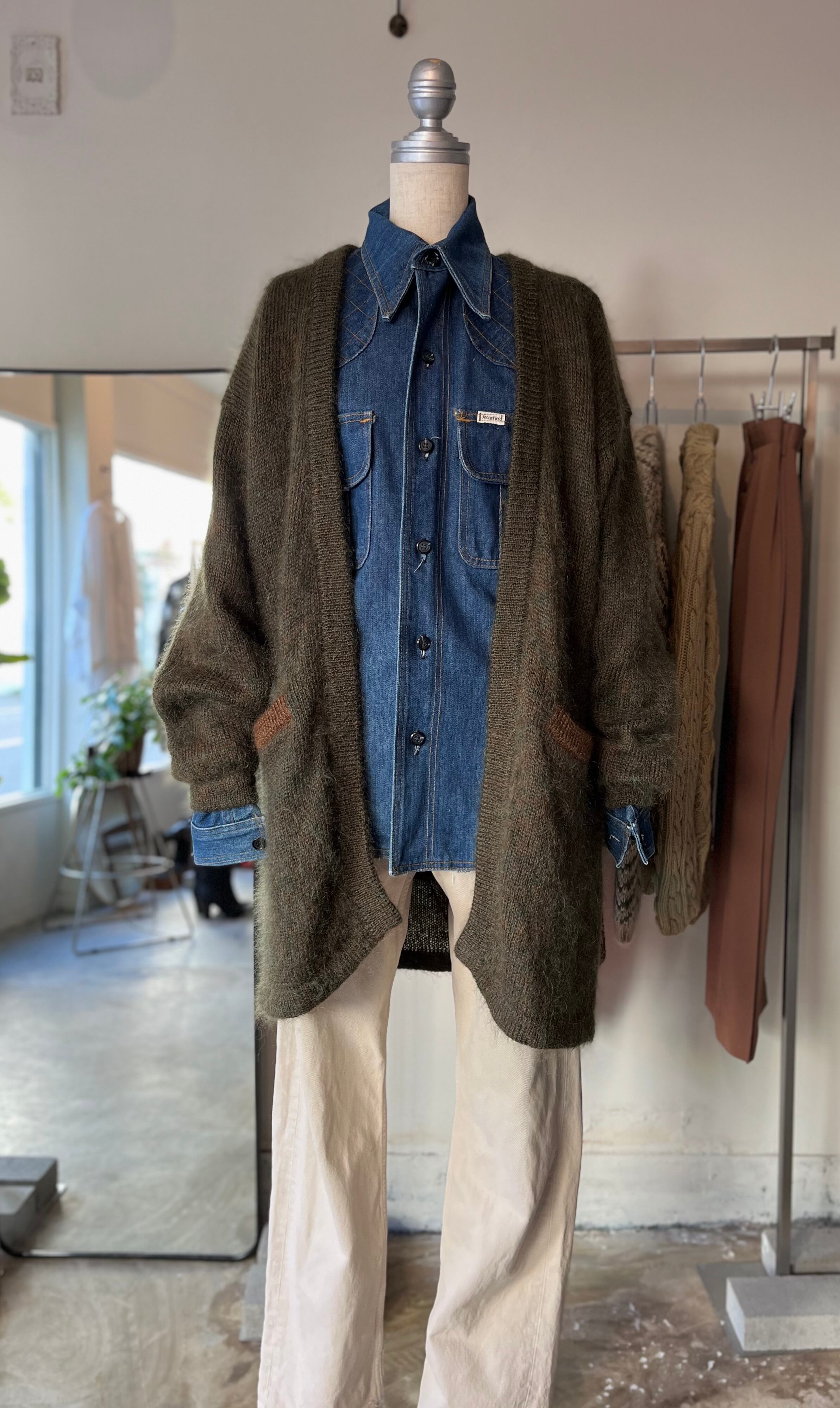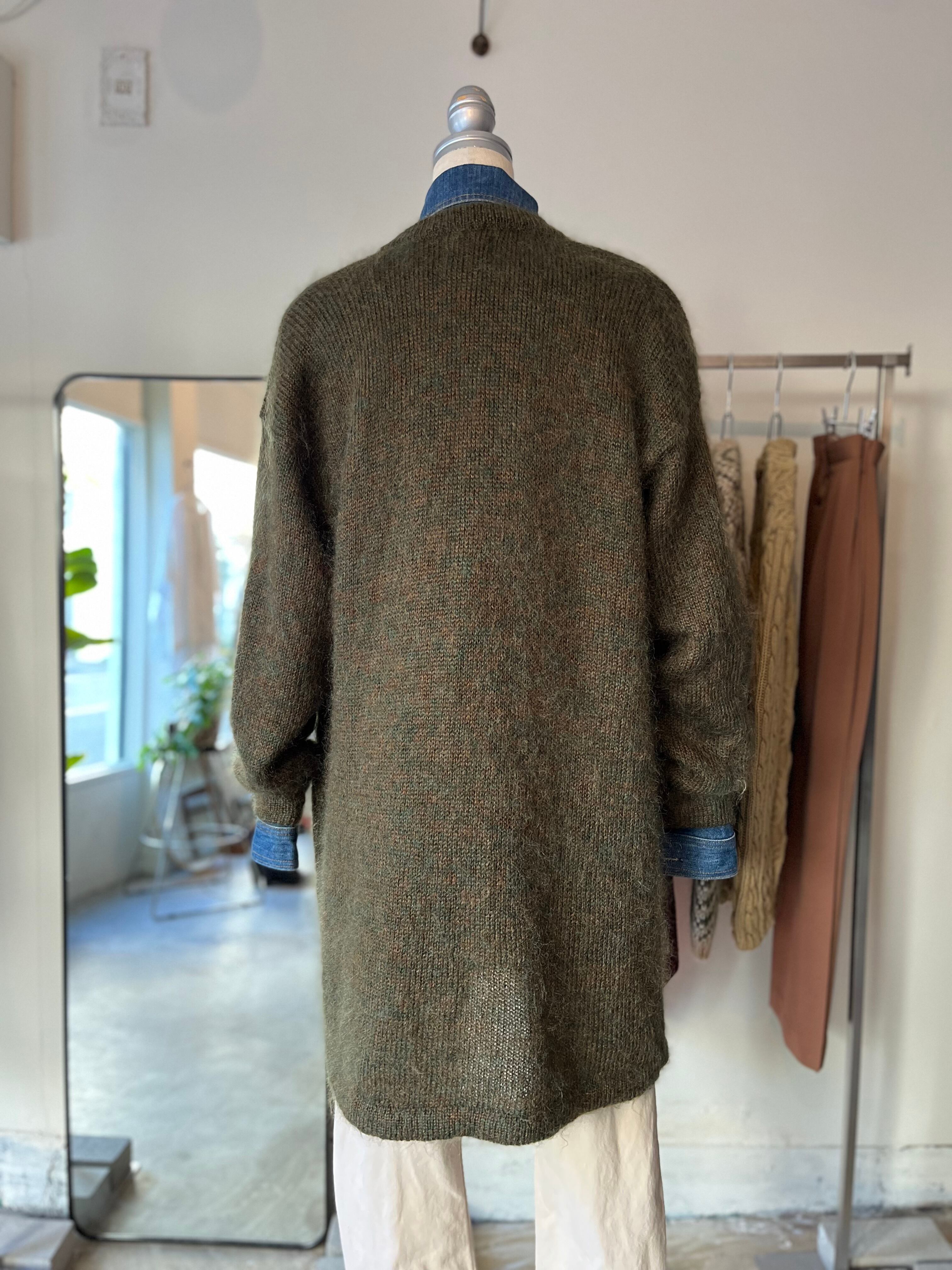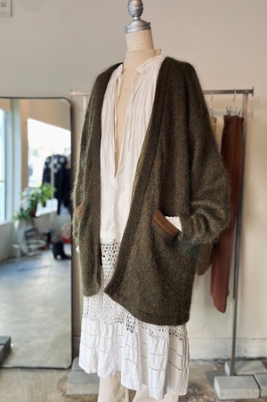 一見色カーキに見えますが、グリーンとブラウンの混色糸が素敵なモヘアガウンです