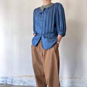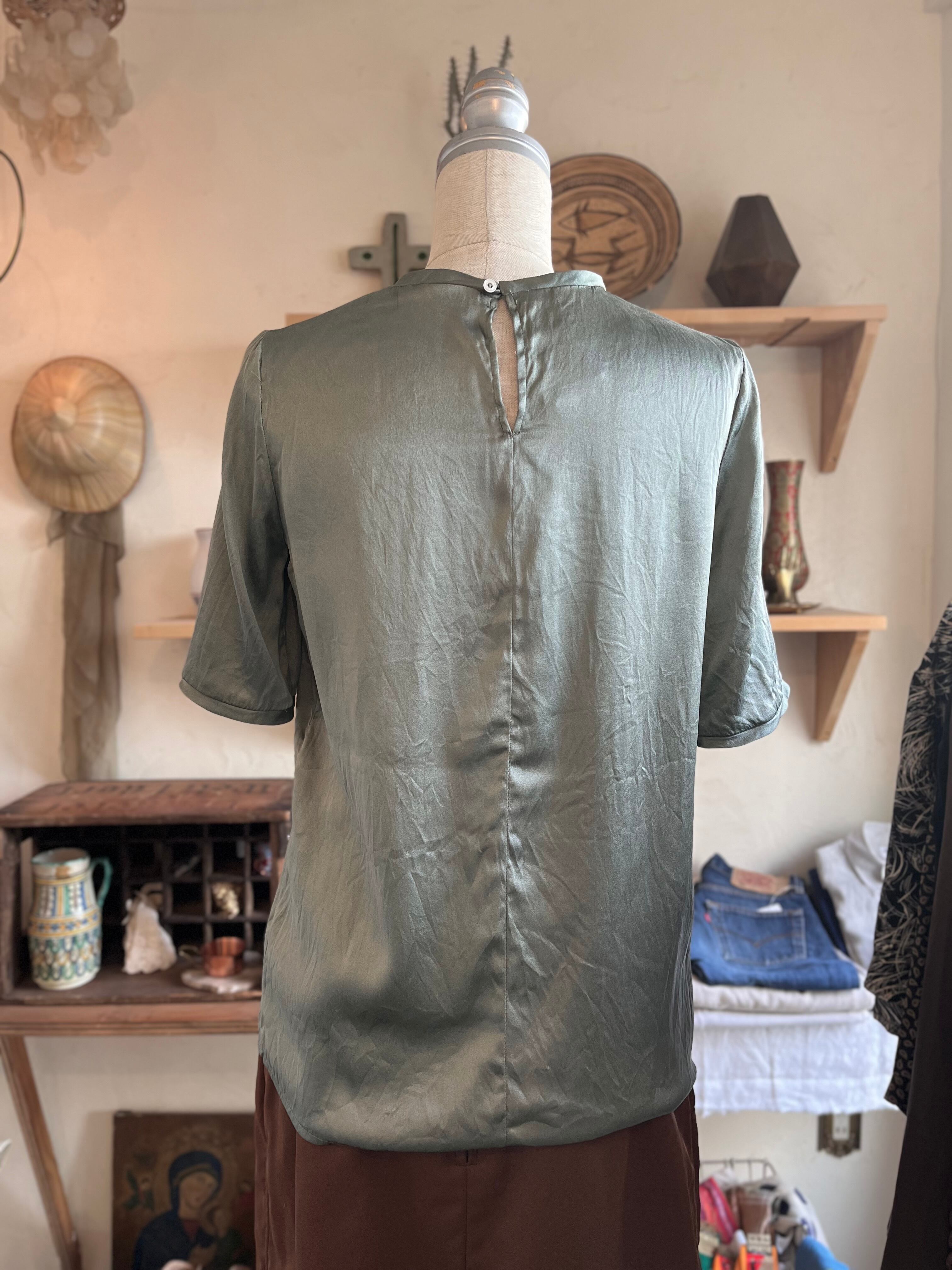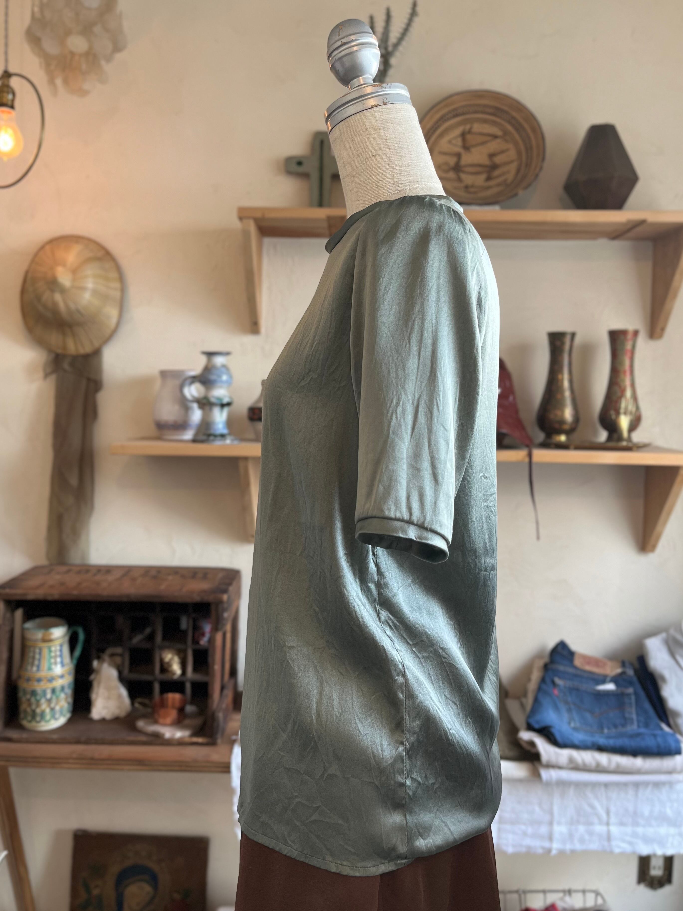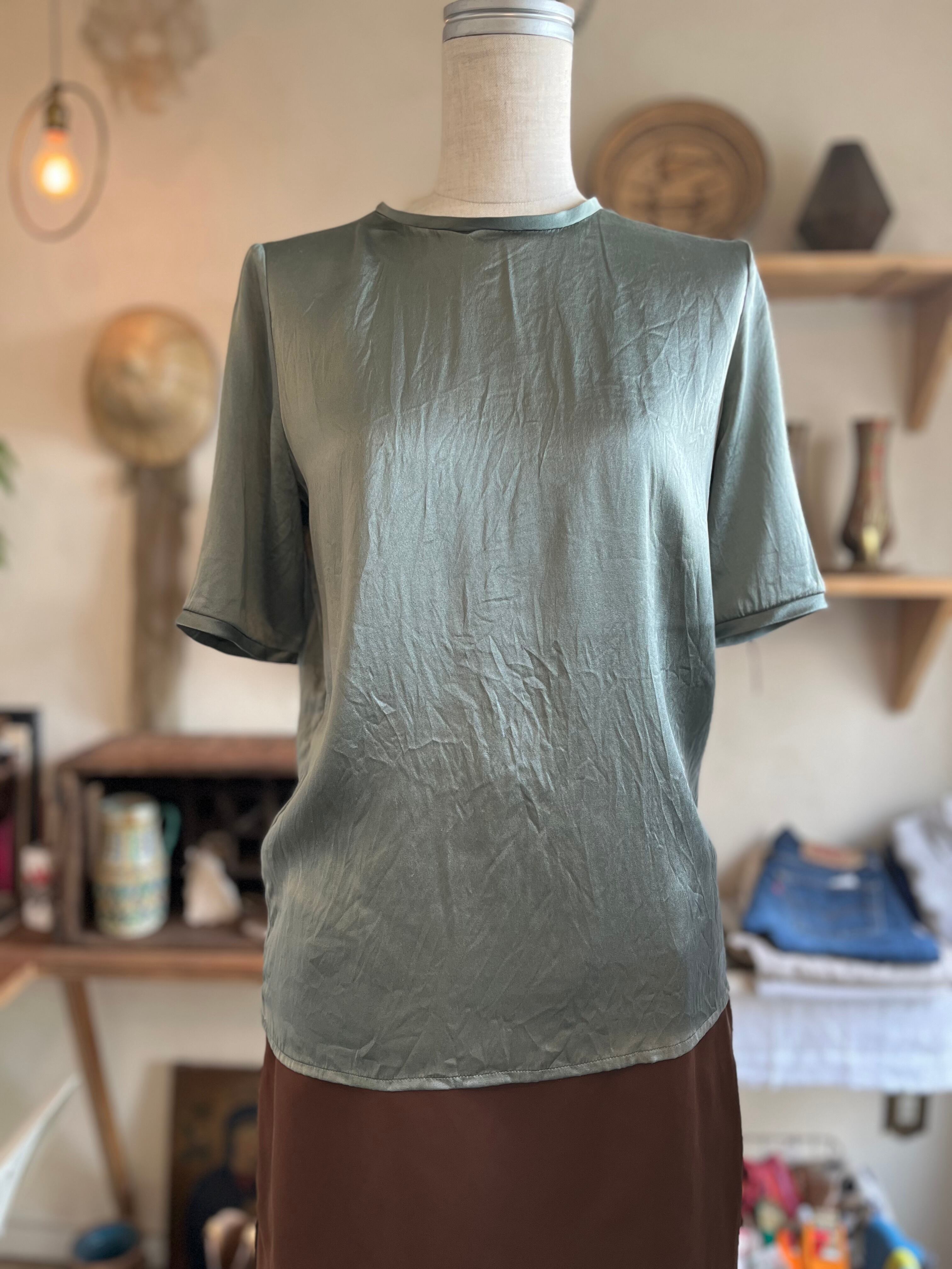 素材表記が無くなっておりますがシルクであると思われます。シンプルなTシャツ型でコーディネートのアクセントに取り入れやすいカラー。Tシャツが苦手な方にもおすすめしているシルクブラウスです。