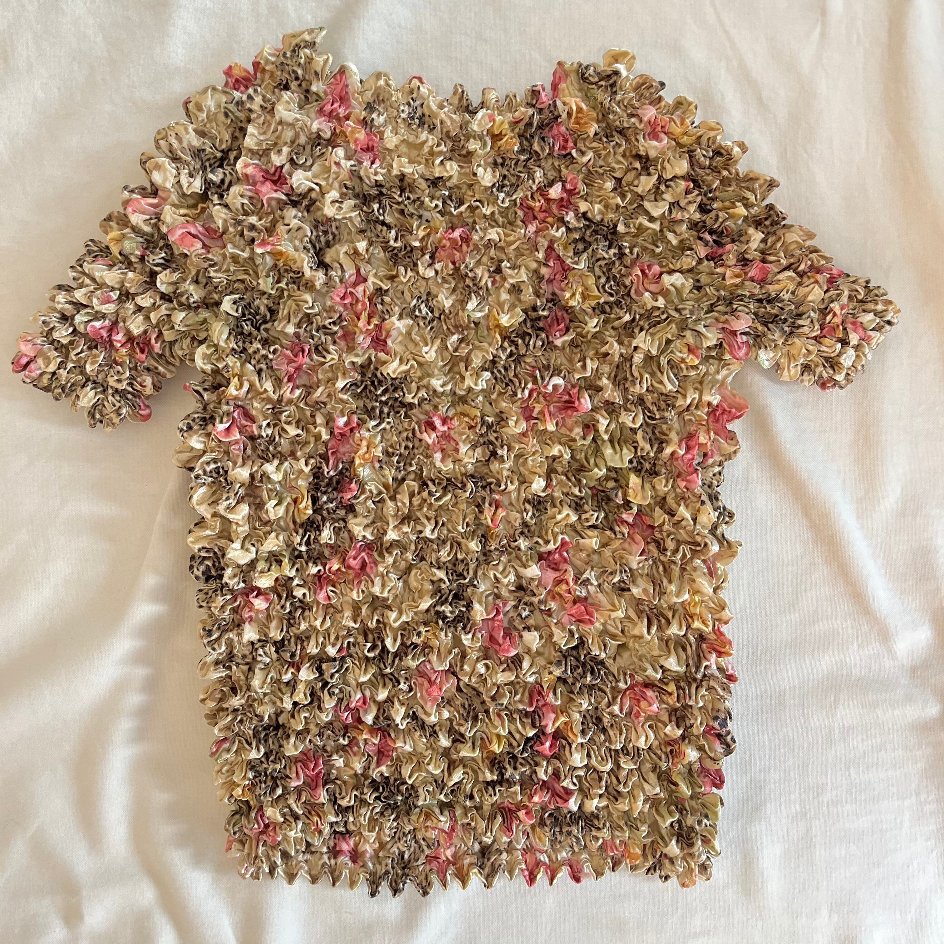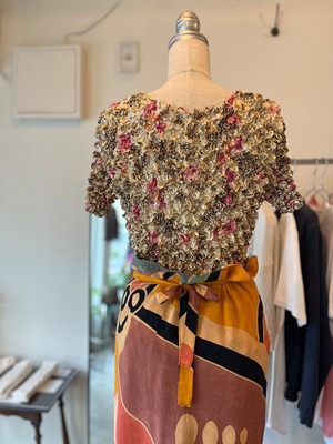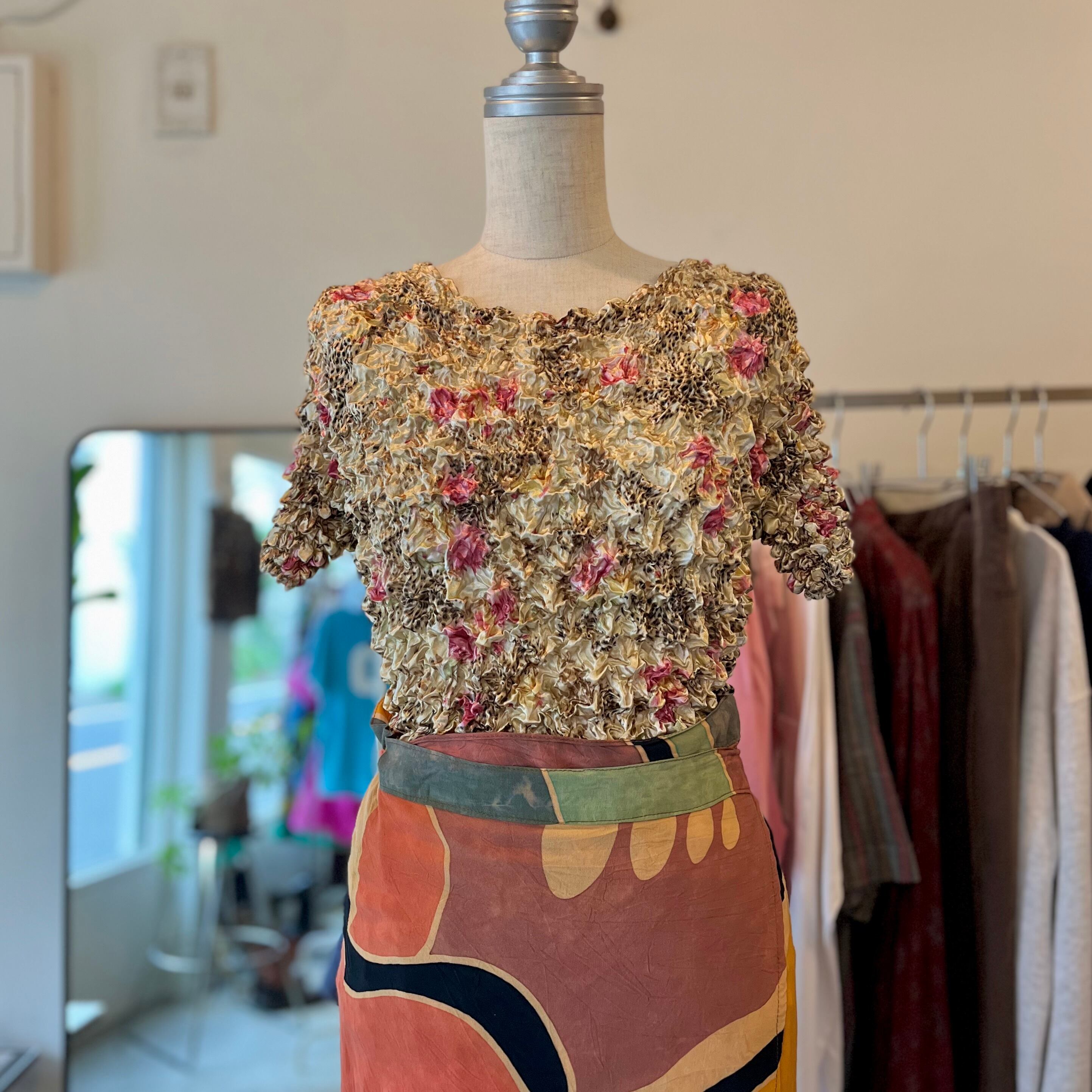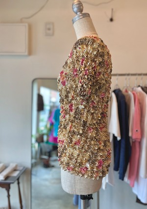 こちらはヒョウ柄のようなモチーフとピンクの花柄が古着らしく個性をプラスしてくれる1着です。
