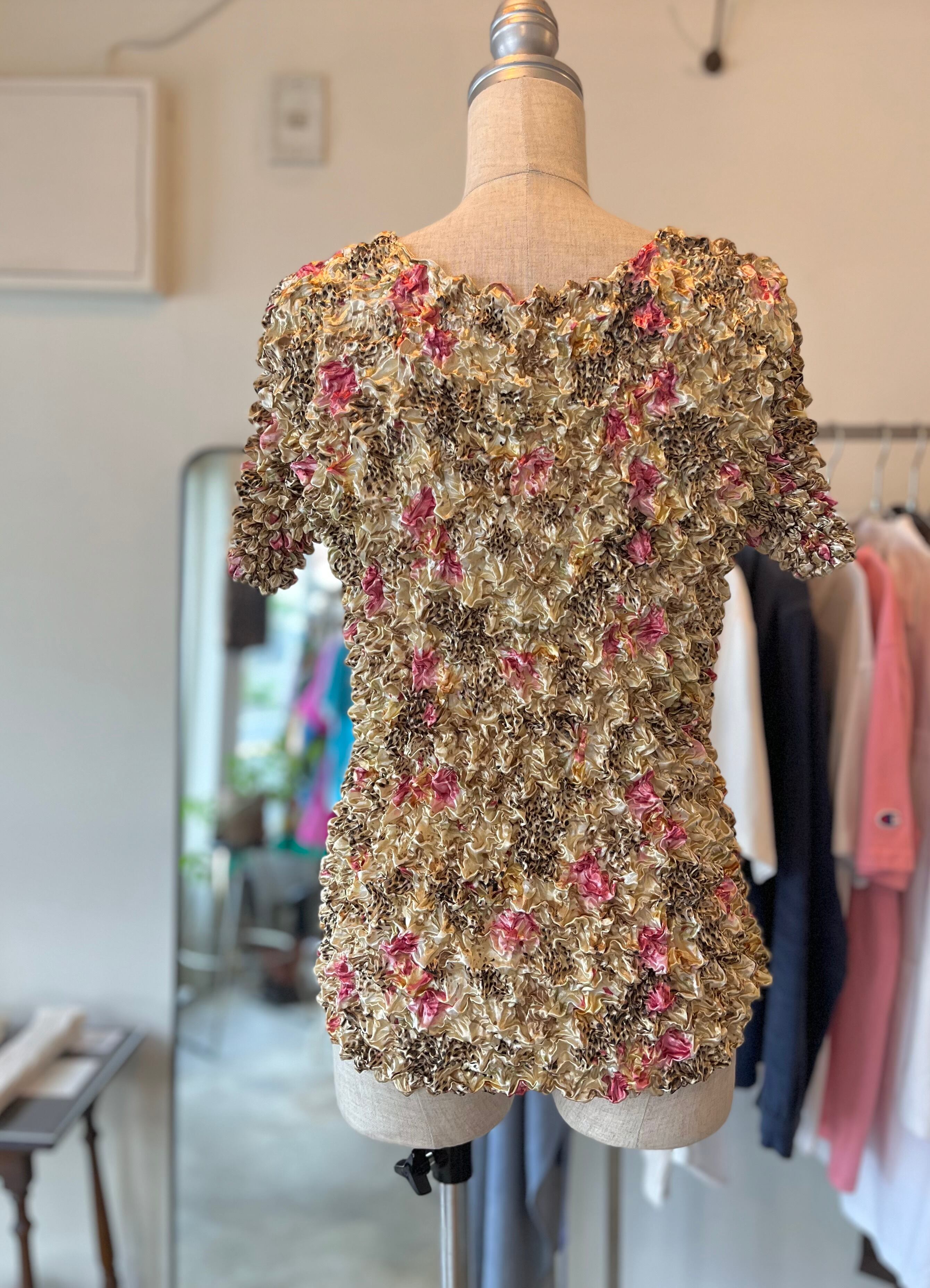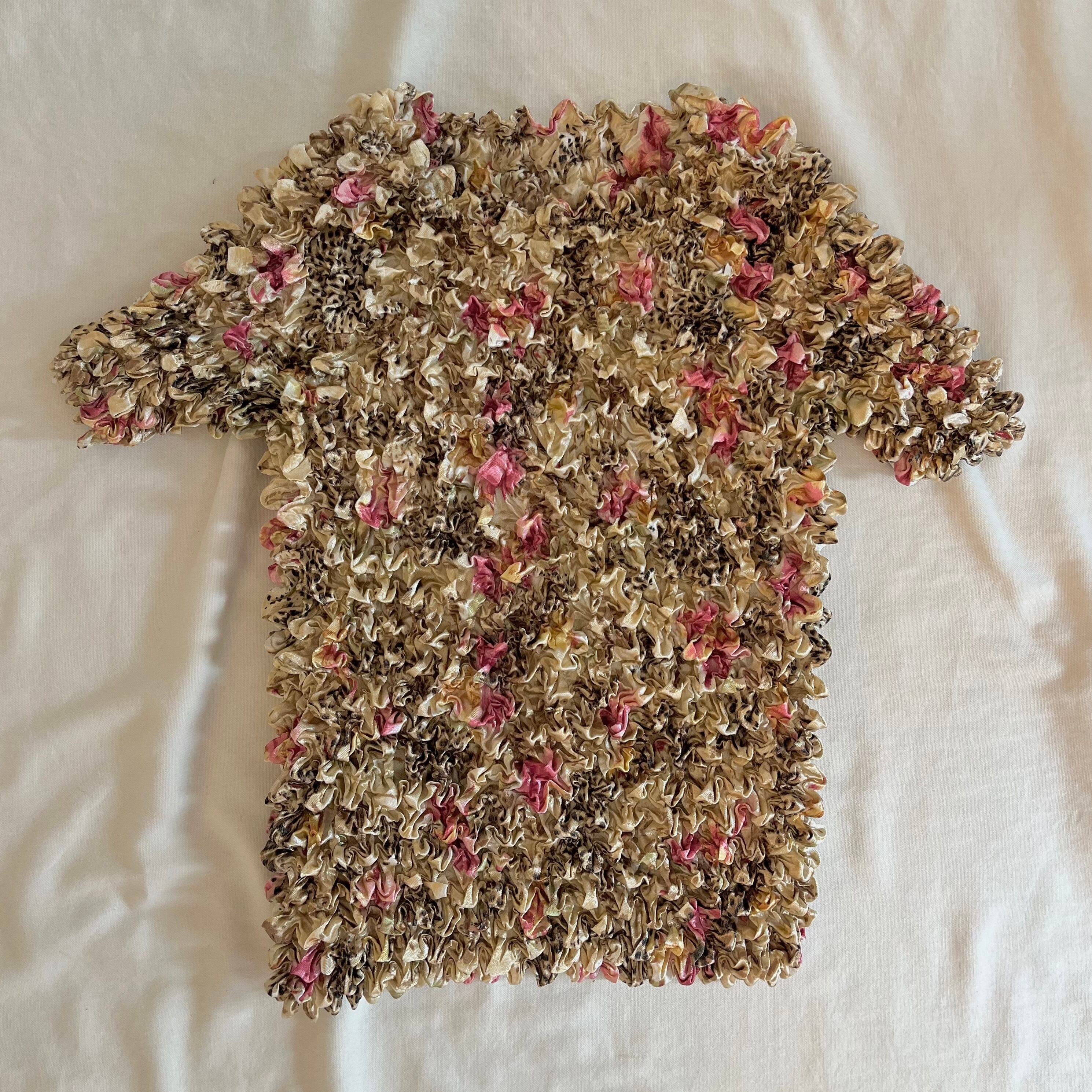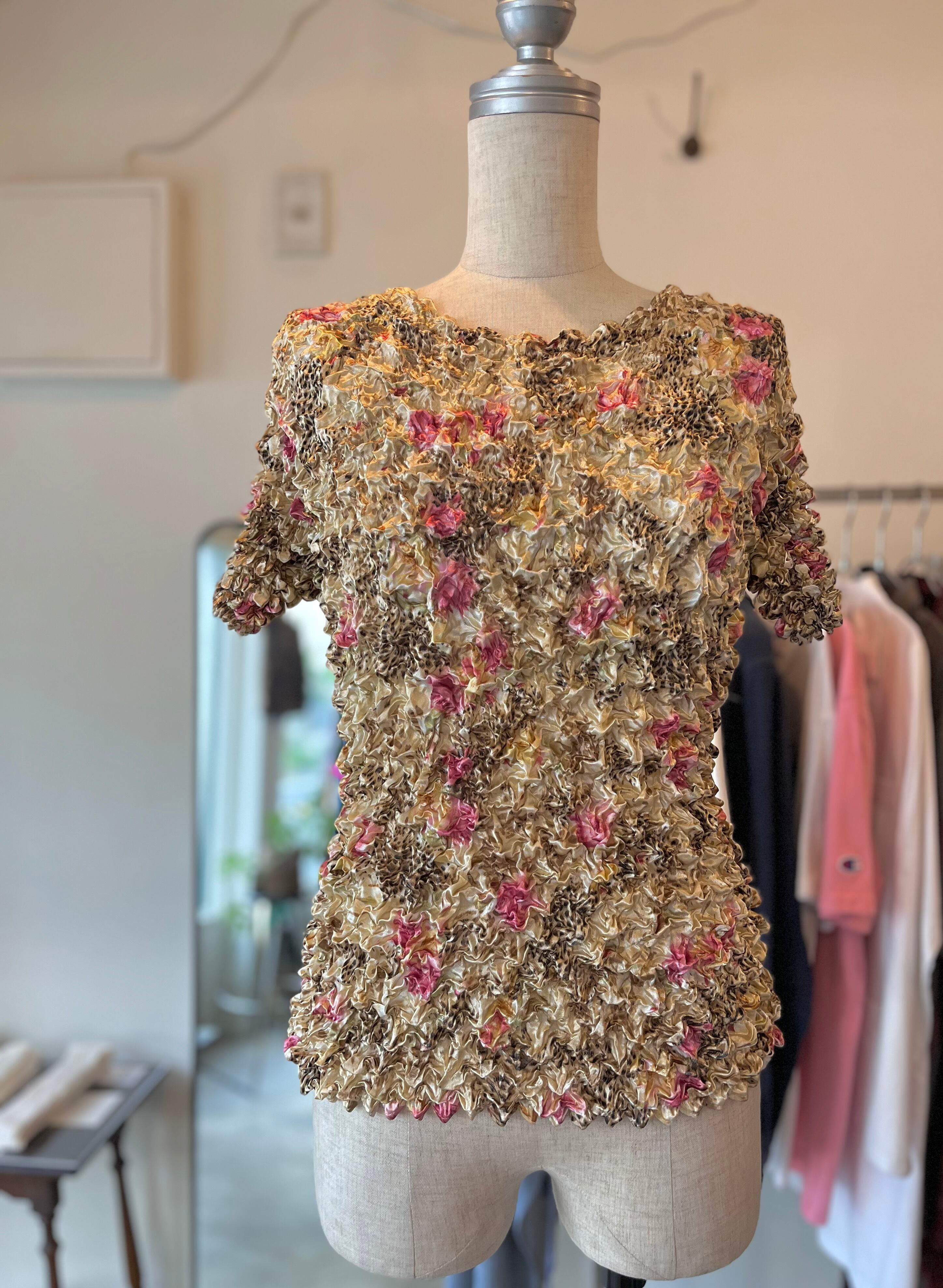 こちらはヒョウ柄のようなモチーフとピンクの花柄が古着らしく個性をプラスしてくれる1着です。