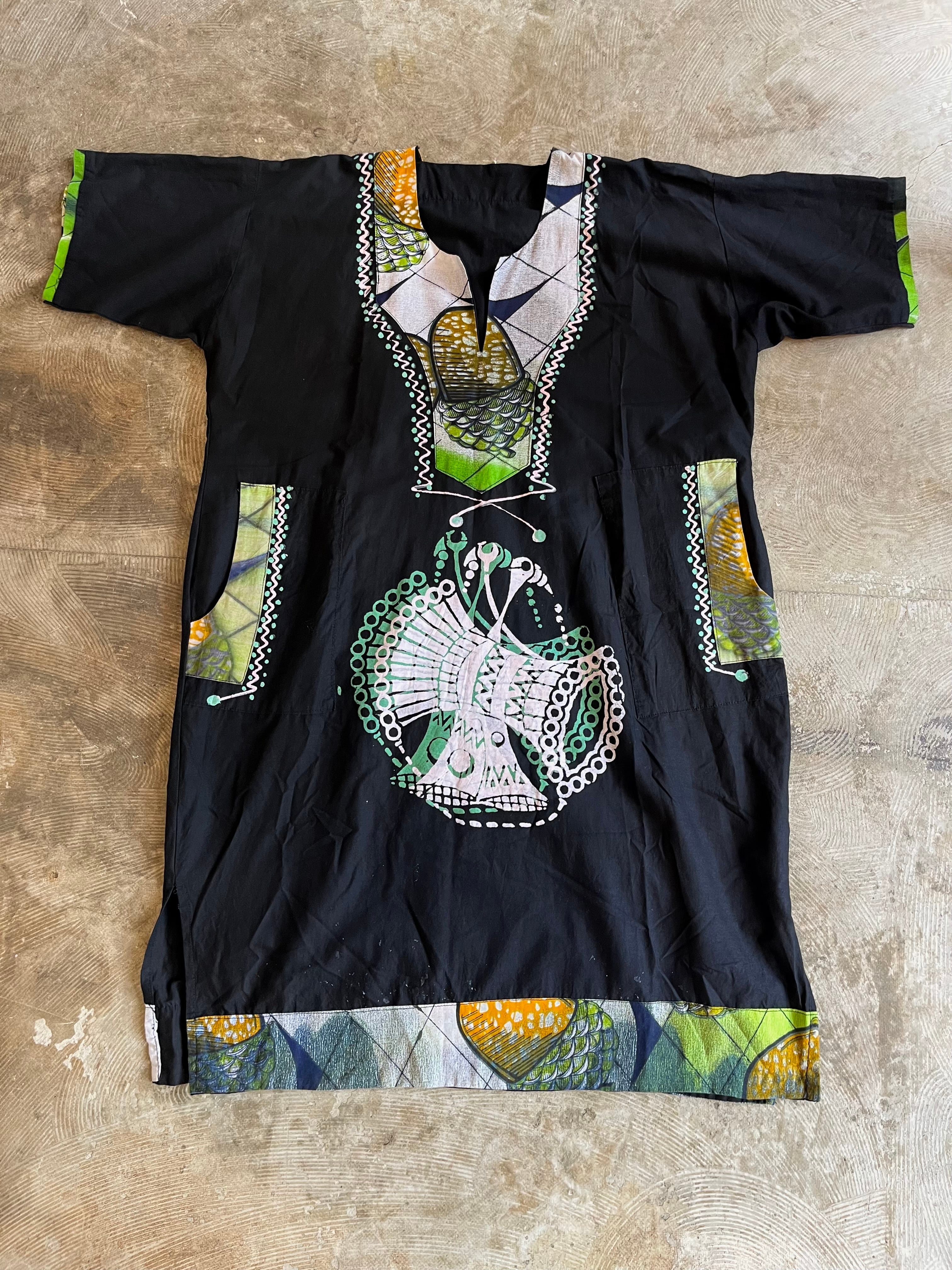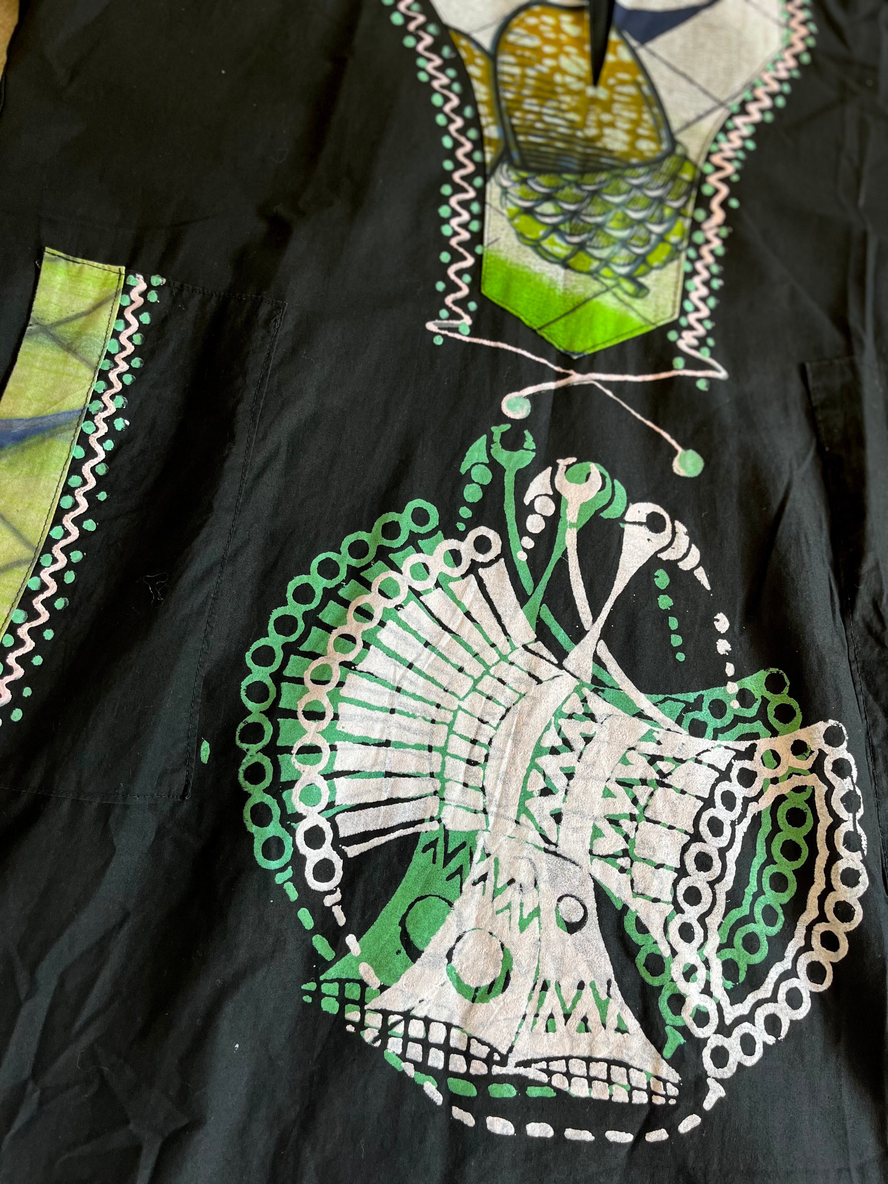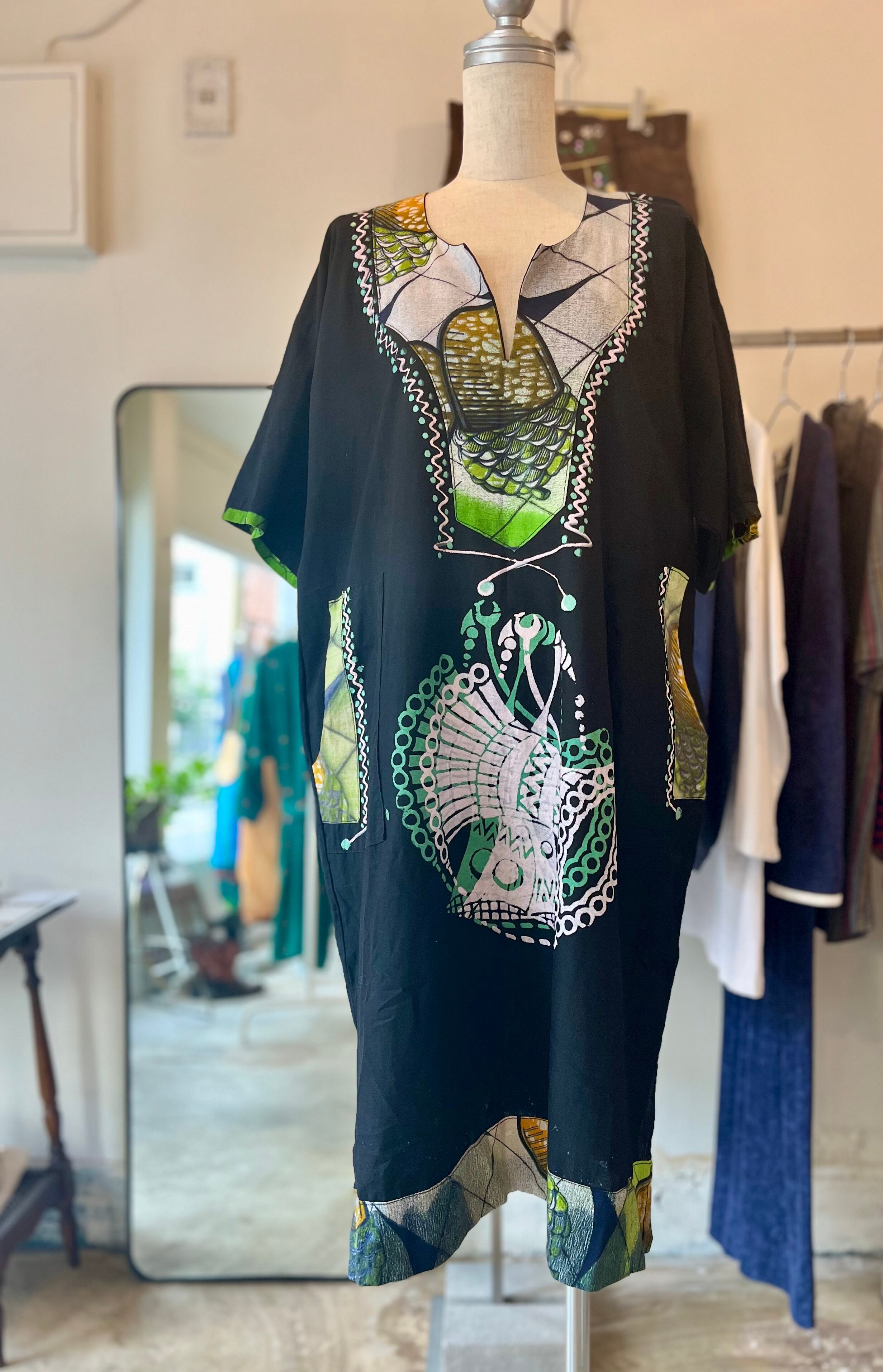 アフリカンプリントの生地と、ハンドペイントで描かれた柄のワンピース。