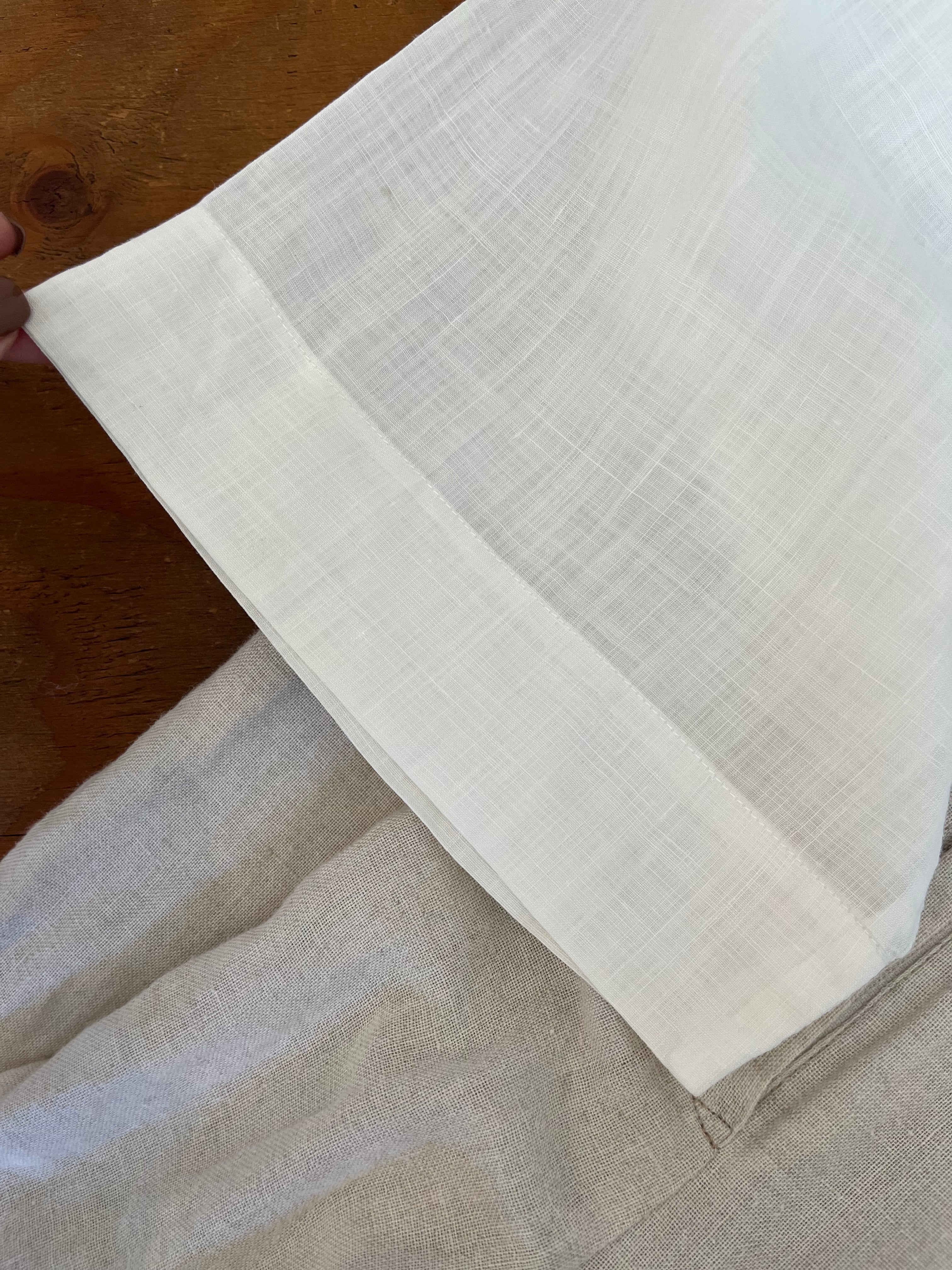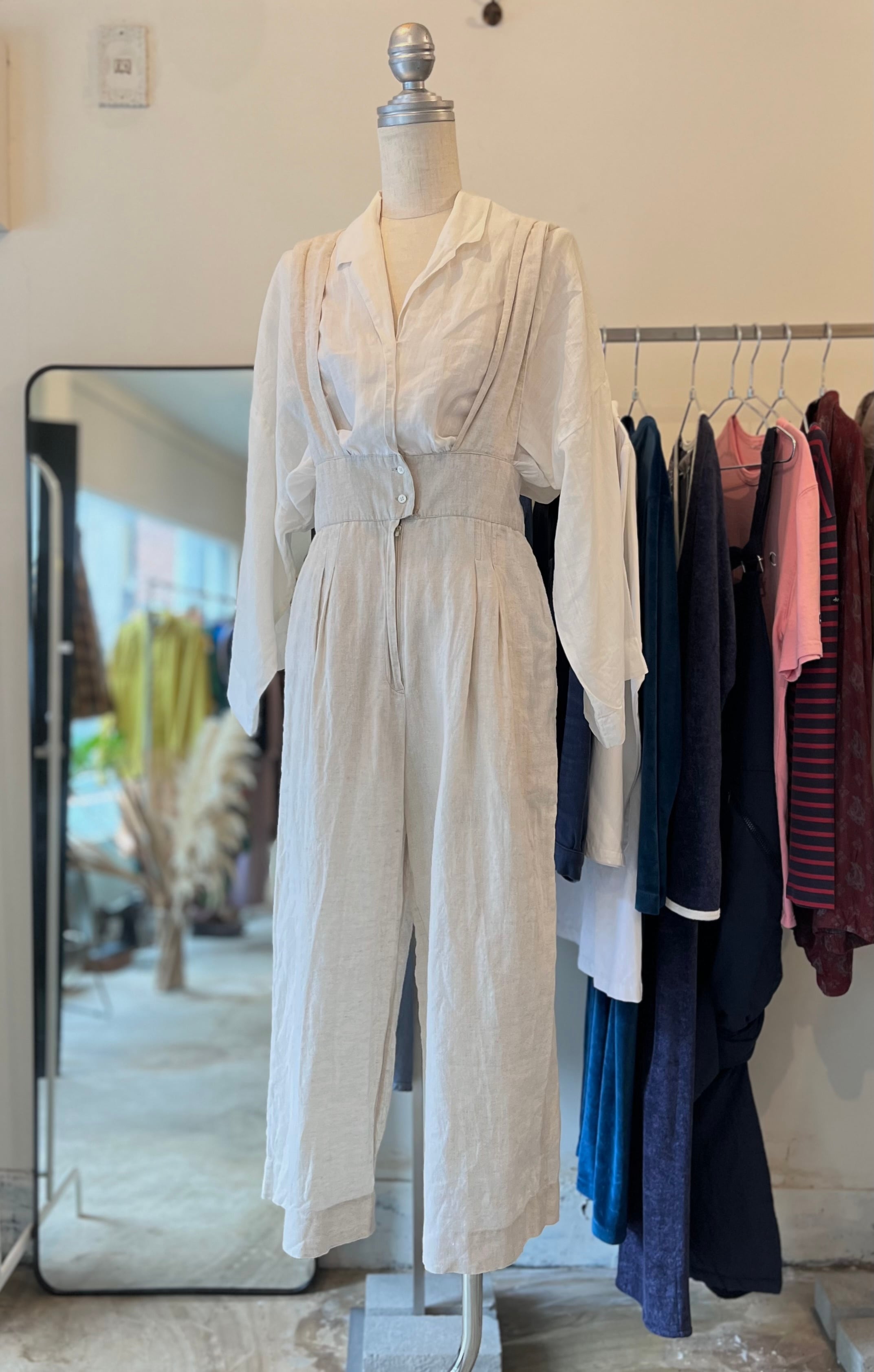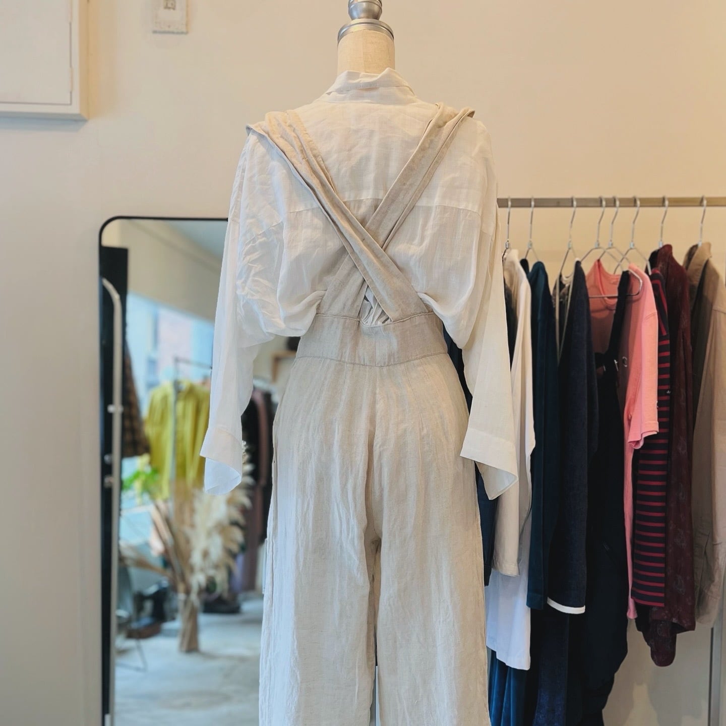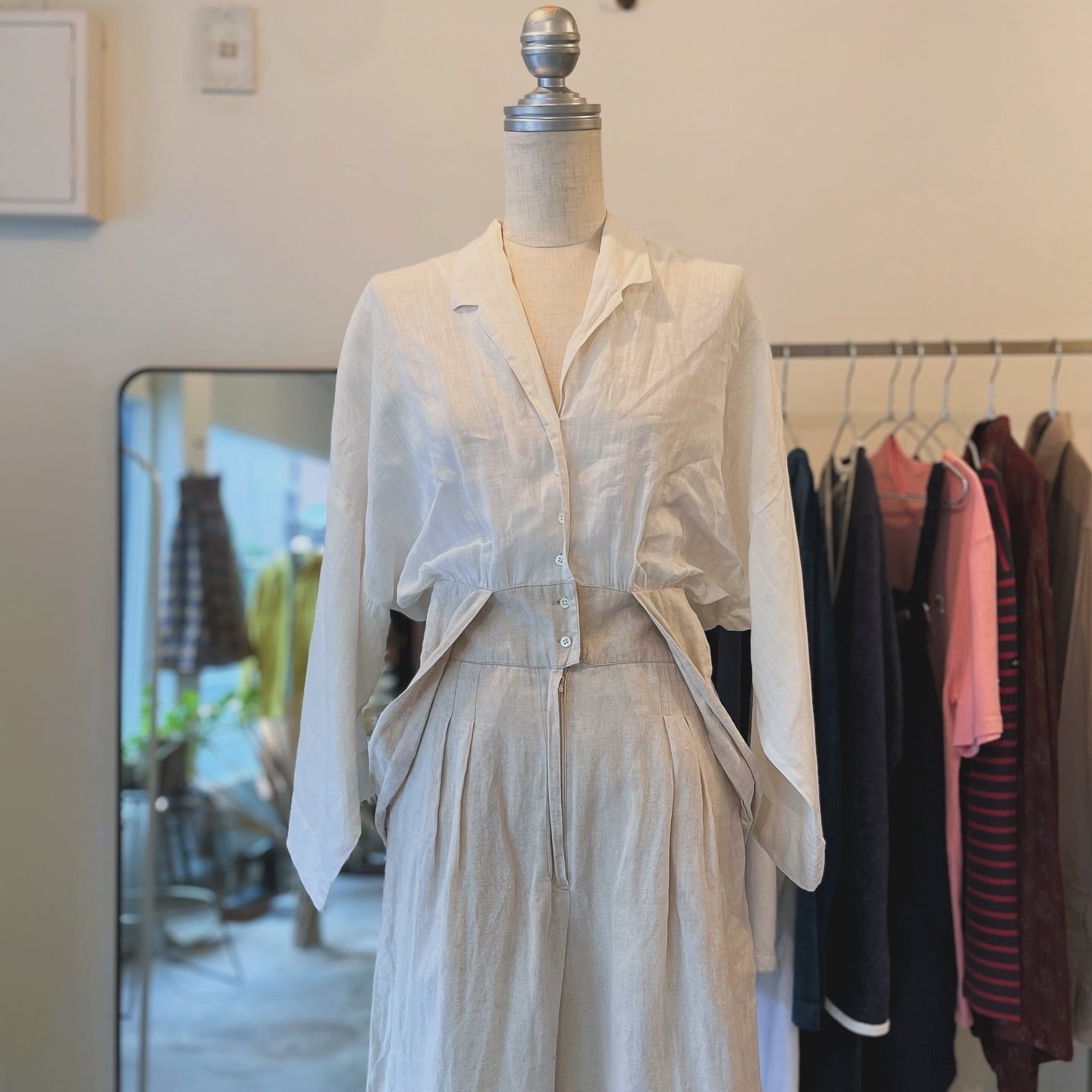 リネンのブラウス部分はゆったりとしたサイズ感でとても軽やか。春夏はもちろん、ざっくりニットやブーツなどとコーディネートして秋までお楽しみいただけます。