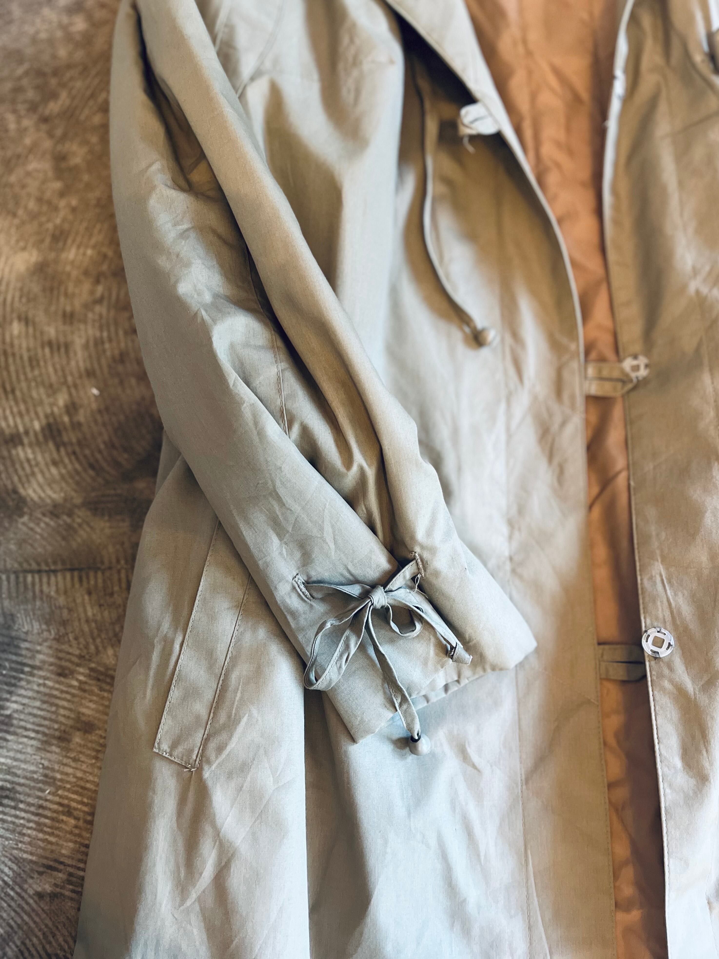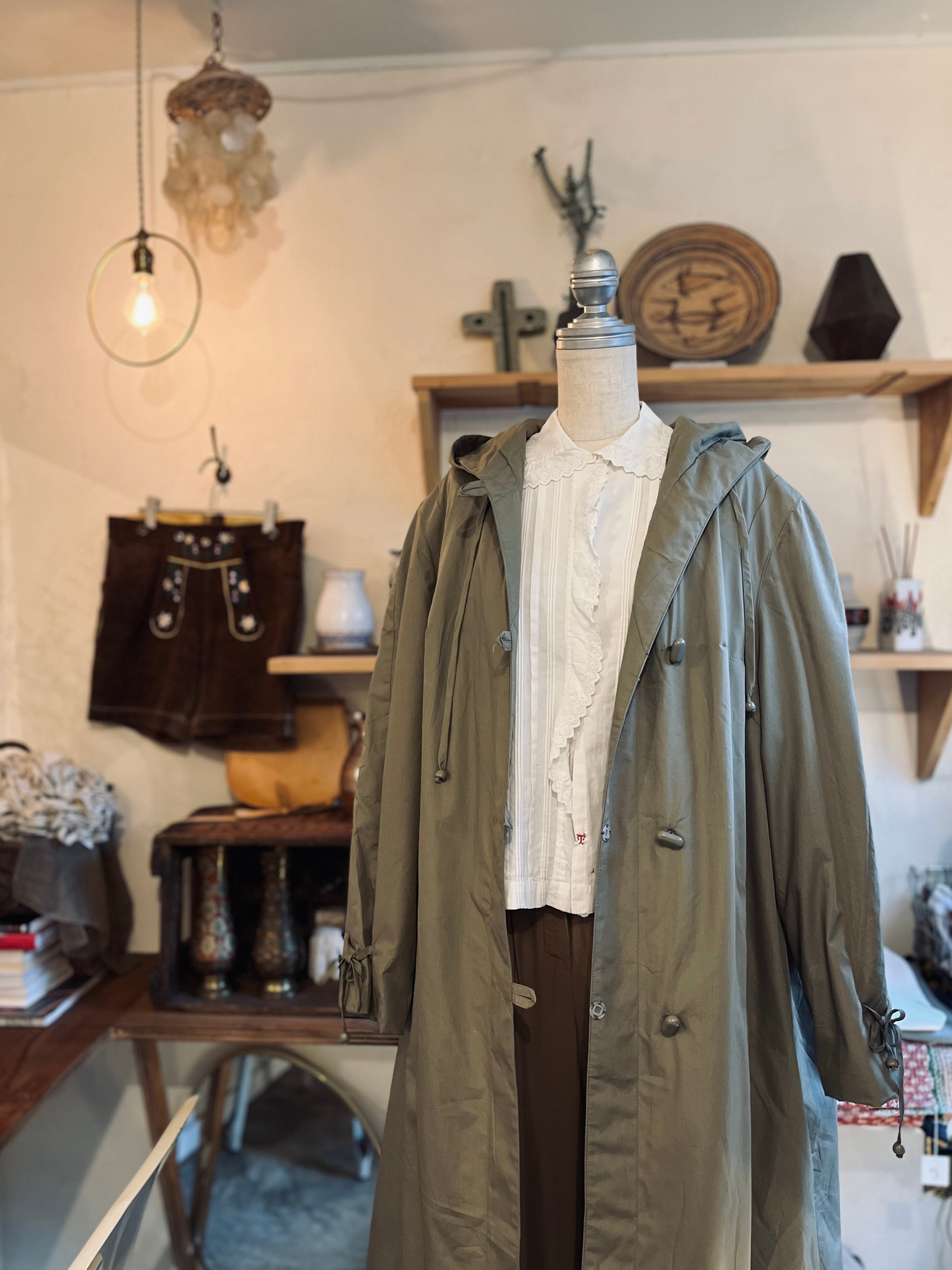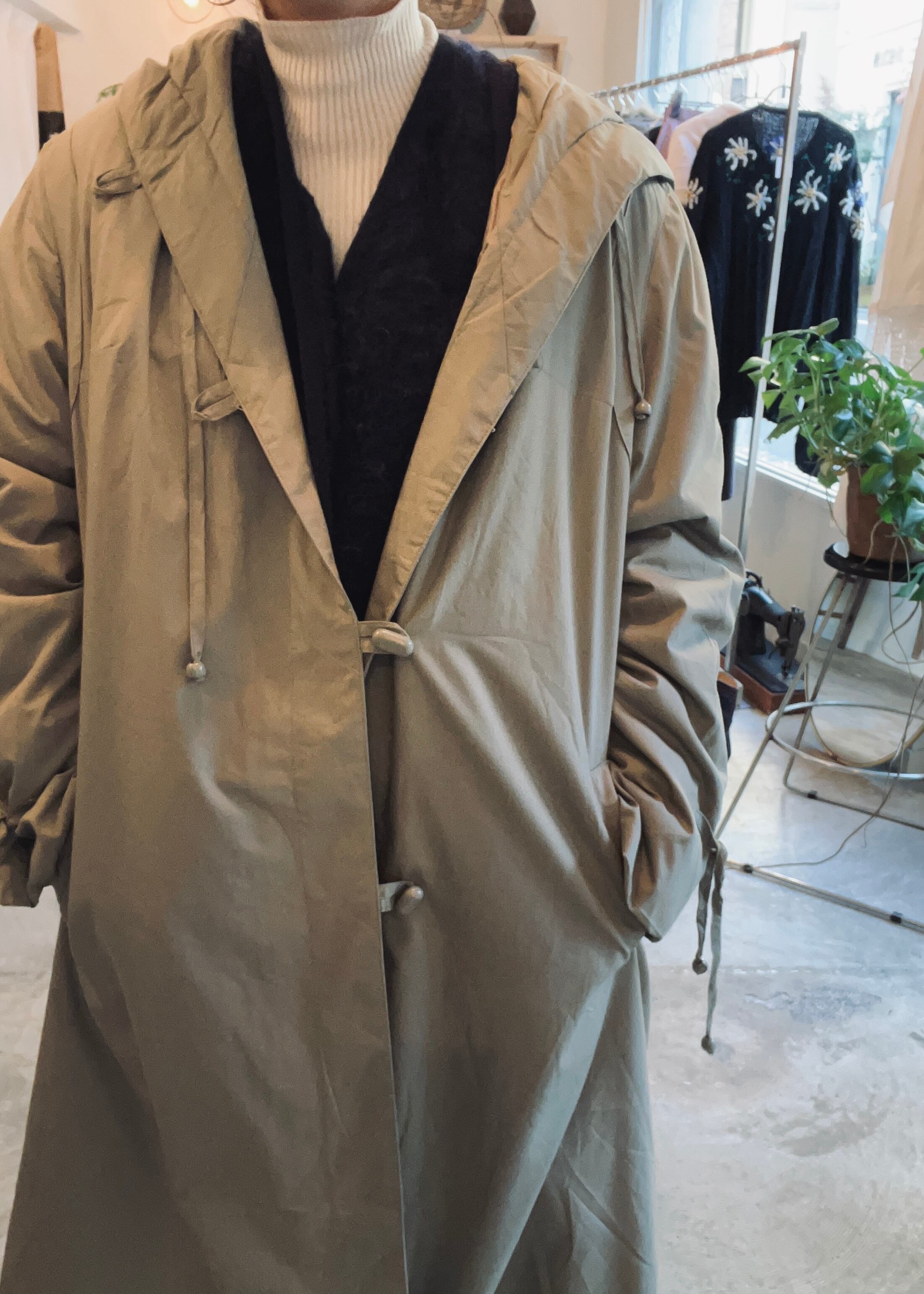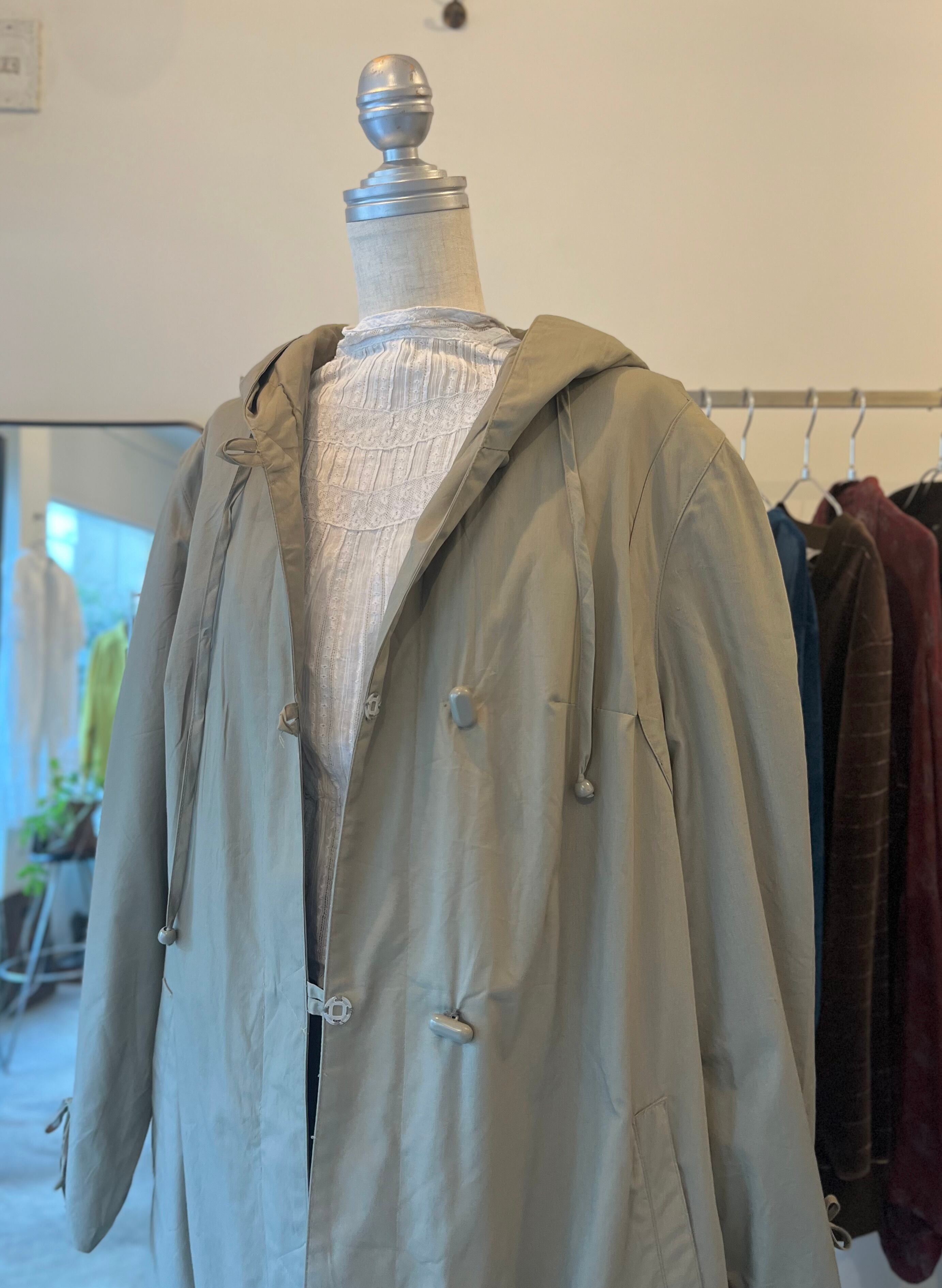 凝ったディテールがポイントのライトコートです。優しいオリーブの色味と裏地のピンクベージュの配色も可愛いです。