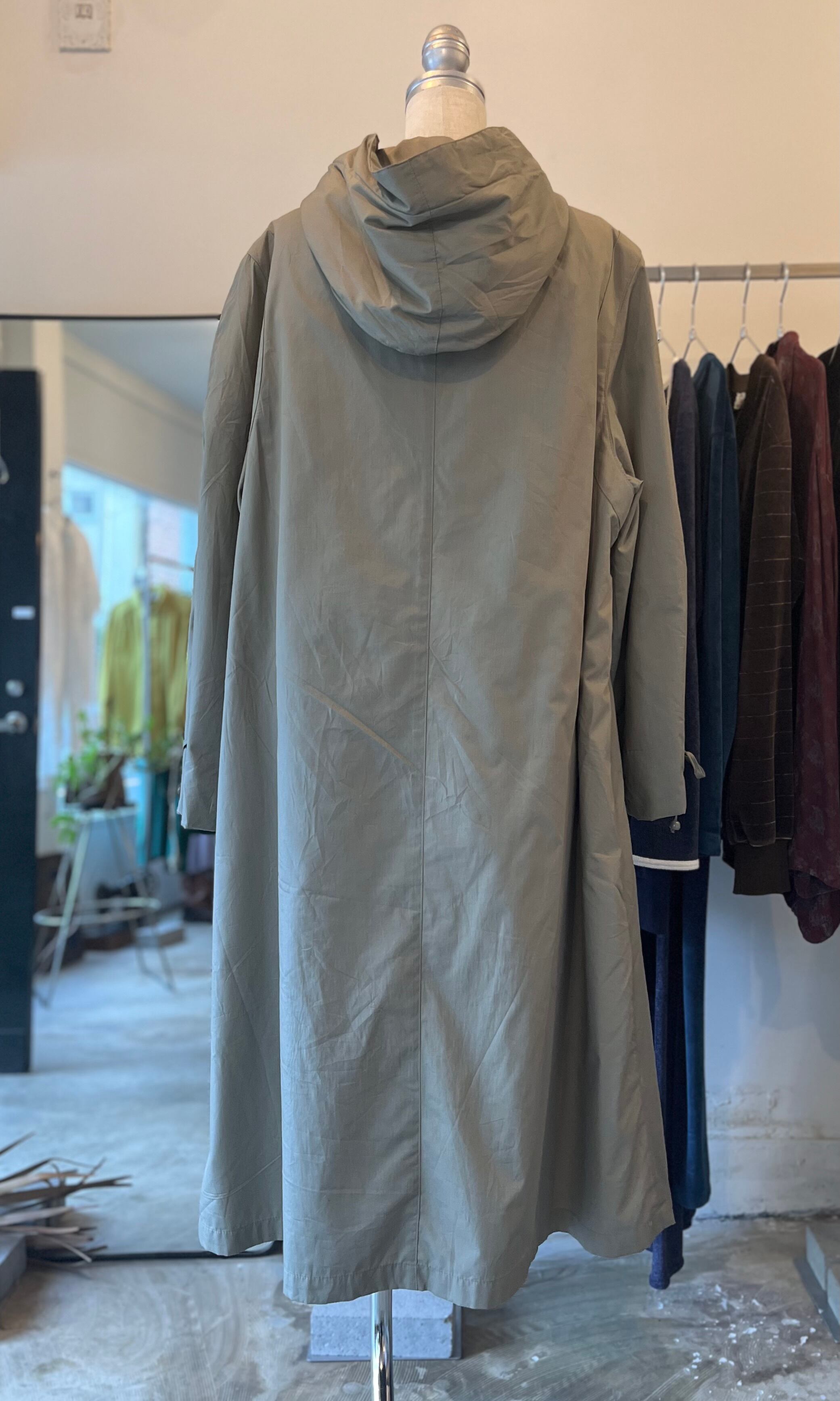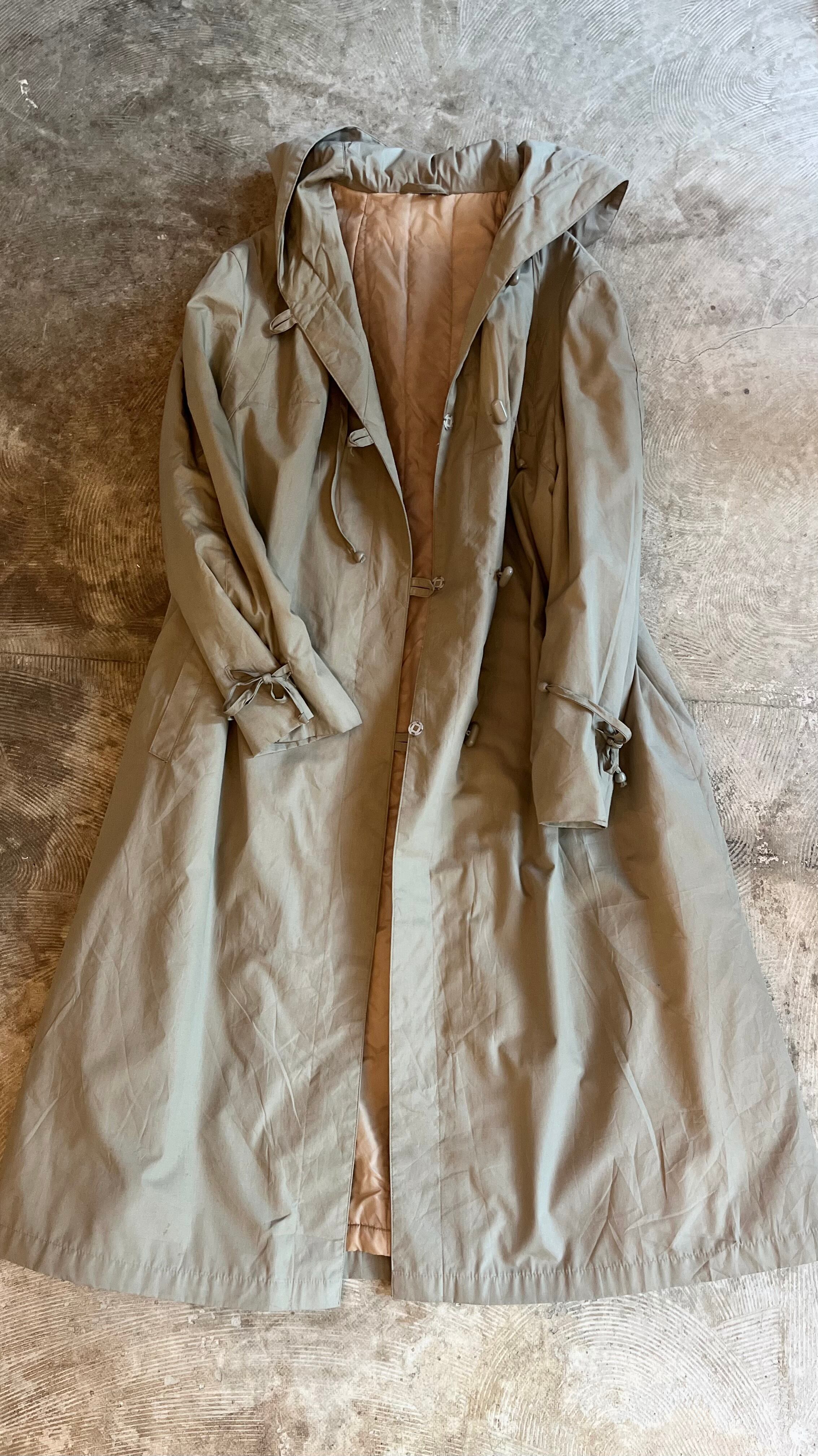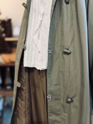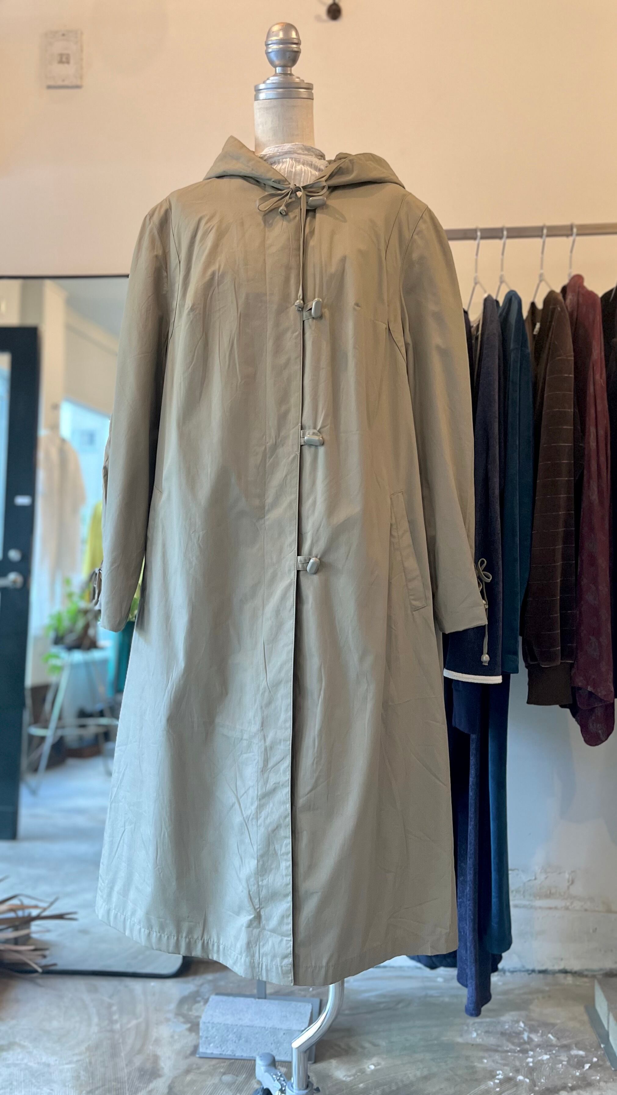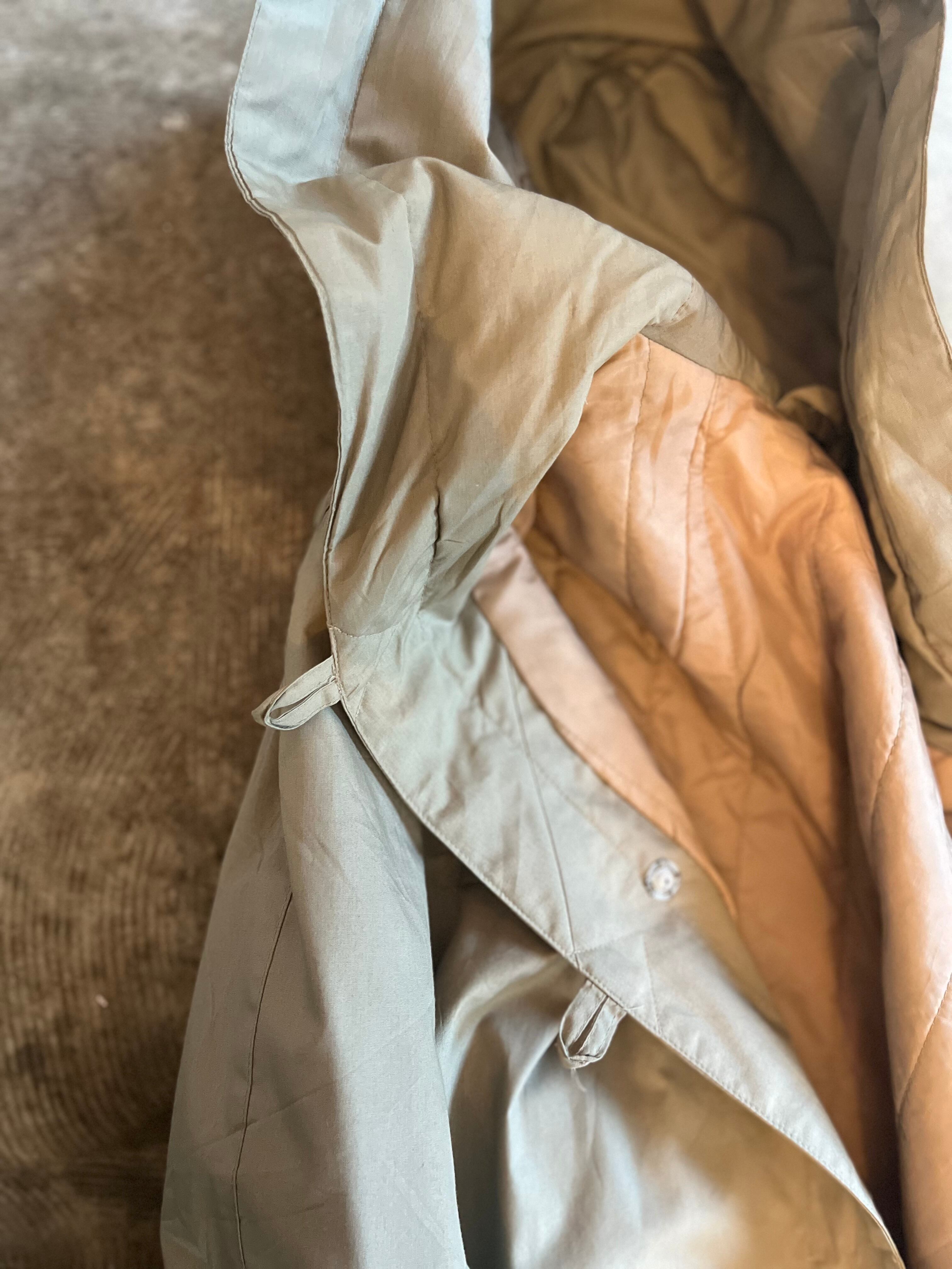 凝ったディテールがポイントのライトコートです。優しいオリーブの色味と裏地のピンクベージュの配色も可愛いです。